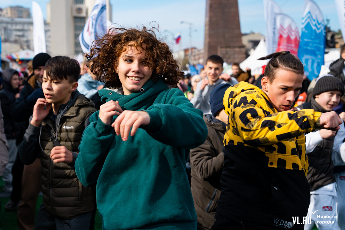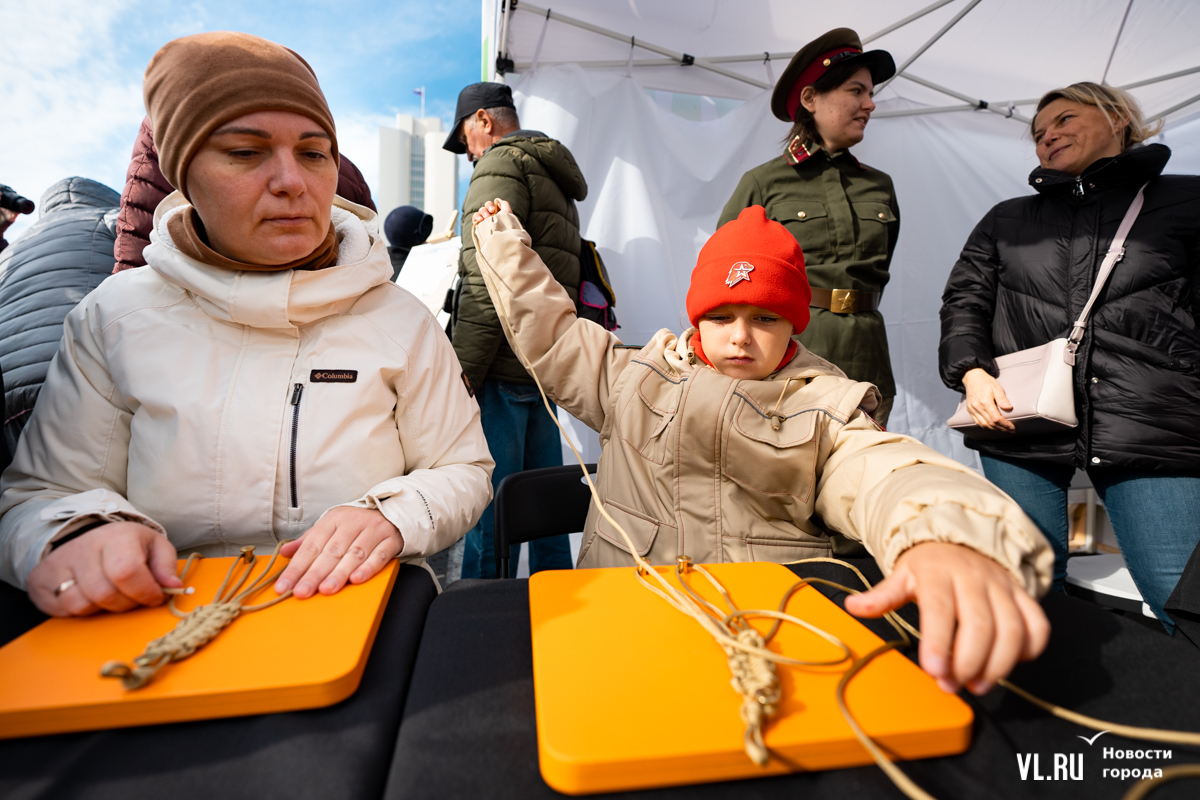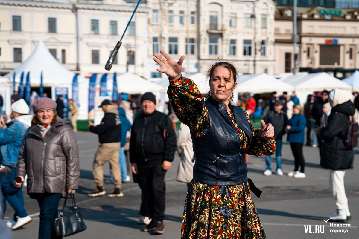 Пока в одной части площади сражались и соревновались всеми возможными способами, в другой её части текла размеренно-весёлая мирная жизнь. В одной из палаток «Россия – Моя история» давали исторический экскурс в путешествие князя Константина Константиновича в Приамурье в 1909 году, к другой, где «Русская община» угощала блинами, выстроилась очередь, а из палатки колледжа ВВГУ горожане выходили, доедая кусочки яблок, которые до этого вырезали на мастер-классе по карвингу. На сцене коллективы в ярких расшитых нарядах пели народные или патриотические песни, не обошлось и без «Я русский», а рядом кружили гигантский хоровод. Хороводы то и дело возникали в разных частях площади, причём хаотично – где-то пели «Катюшу», где-то – «Калинку».