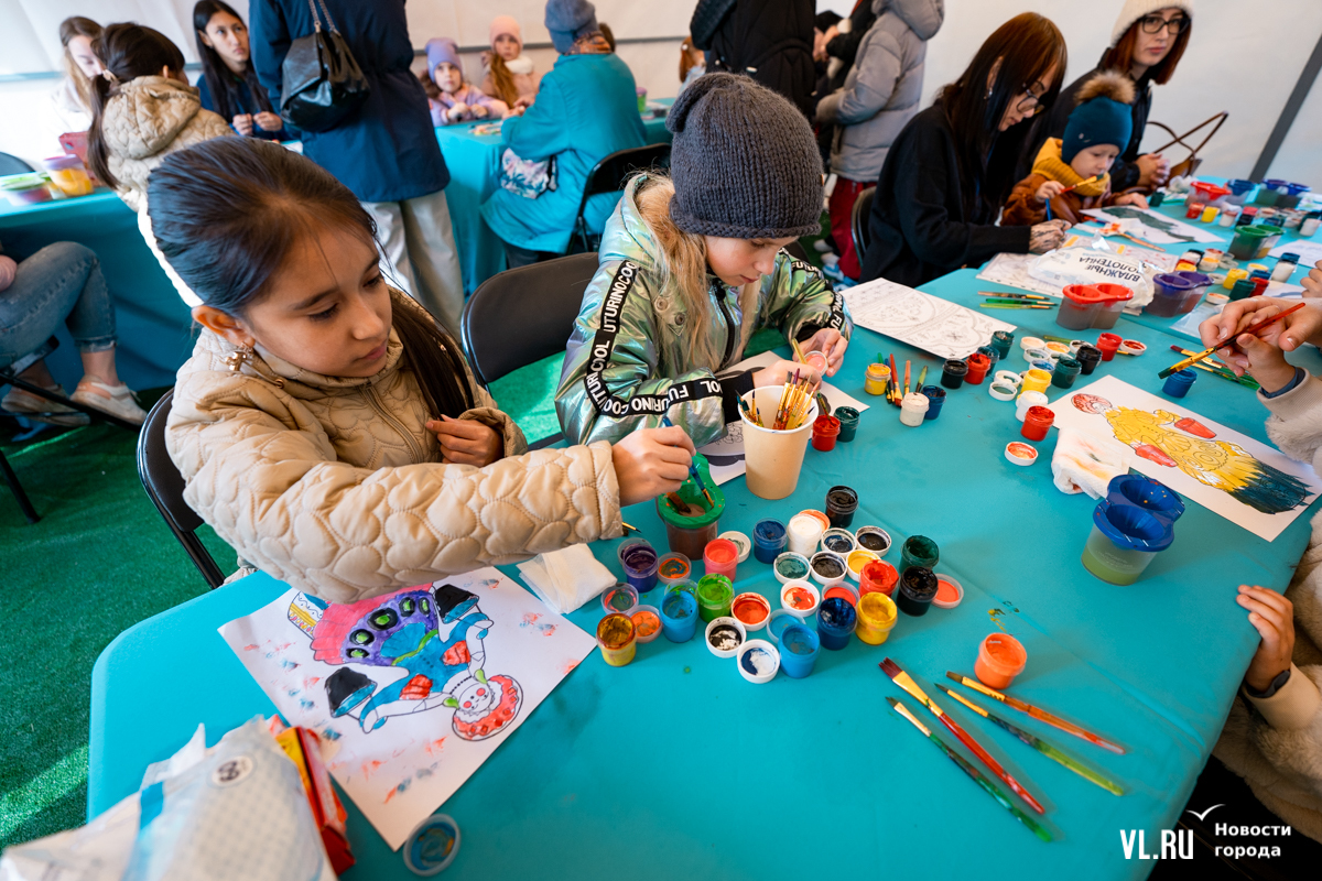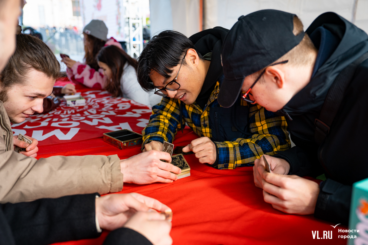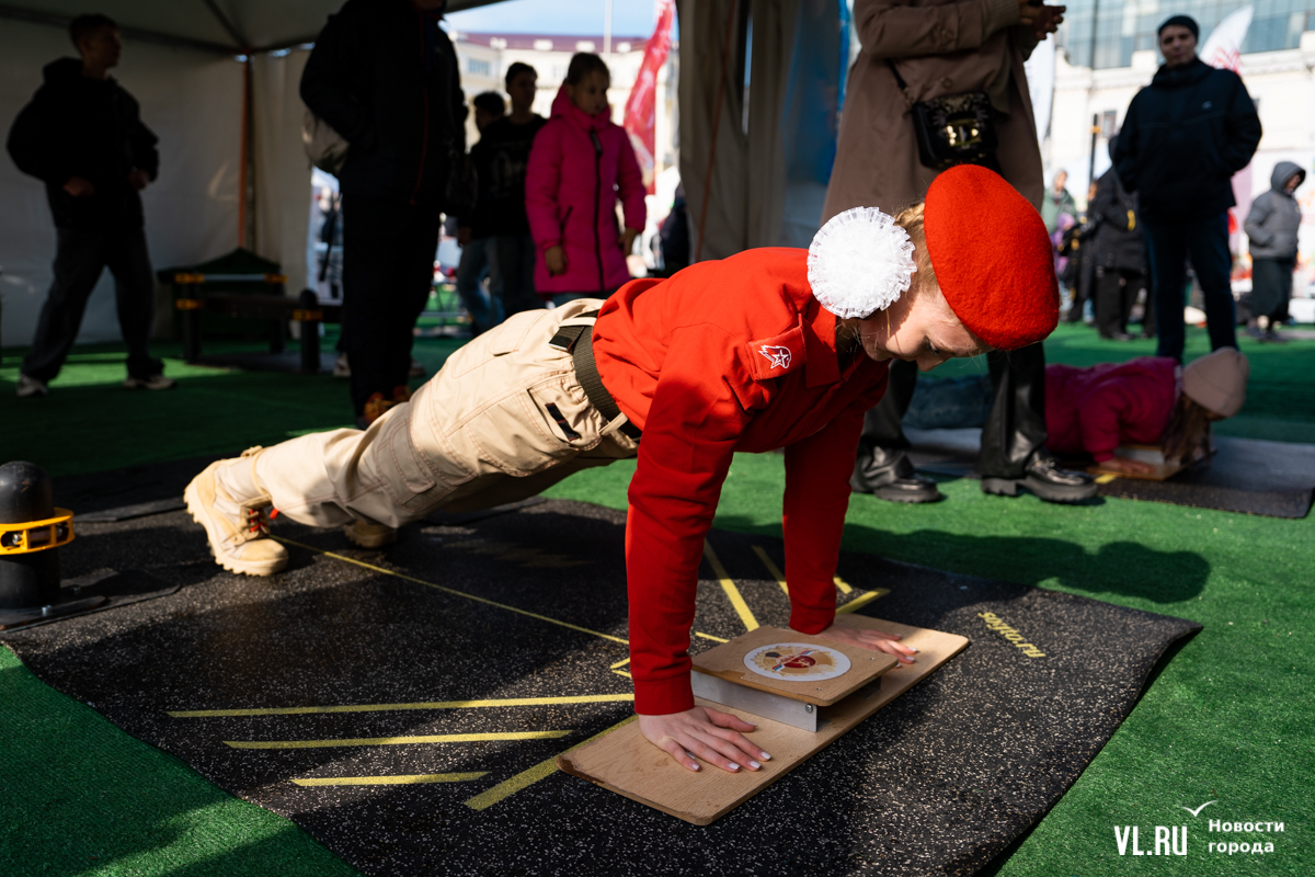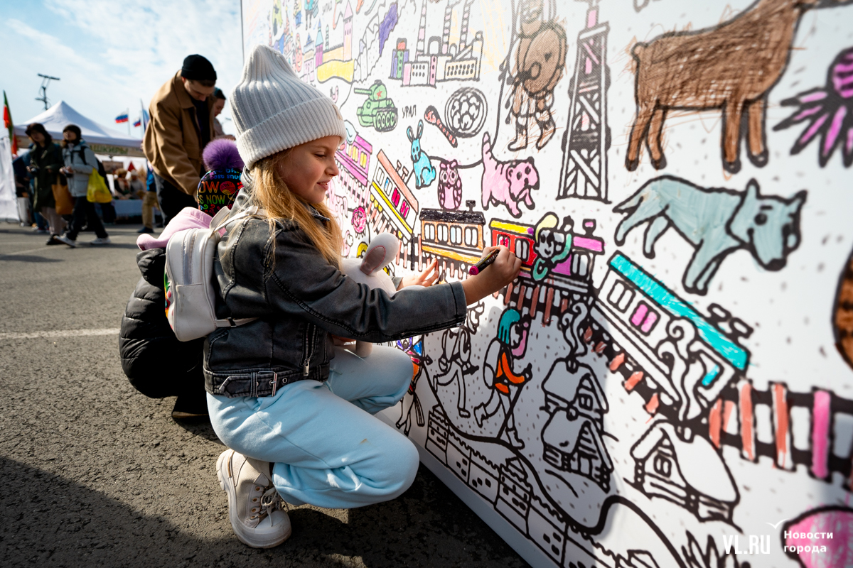 Пока в одной части площади сражались и соревновались всеми возможными способами, в другой её части текла размеренно-весёлая мирная жизнь. В одной из палаток «Россия – Моя история» давали исторический экскурс в путешествие князя Константина Константиновича в Приамурье в 1909 году, к другой, где «Русская община» угощала блинами, выстроилась очередь, а из палатки колледжа ВВГУ горожане выходили, доедая кусочки яблок, которые до этого вырезали на мастер-классе по карвингу. На сцене коллективы в ярких расшитых нарядах пели народные или патриотические песни, не обошлось и без «Я русский», а рядом кружили гигантский хоровод. Хороводы то и дело возникали в разных частях площади, причём хаотично – где-то пели «Катюшу», где-то – «Калинку».