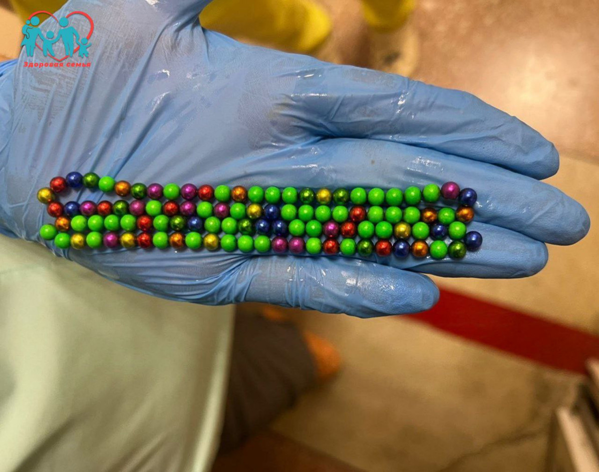 101 шариковый магнит извлекли врачи Краевой детской больницы № 1 из желудка трёхлетнего мальчика. Ребёнок поступил в приёмное отделение больницы в конце рабочего дня, а рентгенологический снимок показал наличие множества магнитов в желудке. Причём они были скреплены между собой и свободно перемещались по желудку, принимая разные формы.