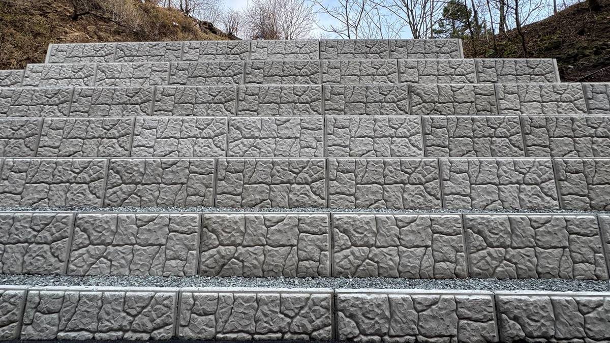 Новая стена устроена в форме уступов, а не строго вертикально, как прежняя. Сверху косогор отсыпали щебнем.