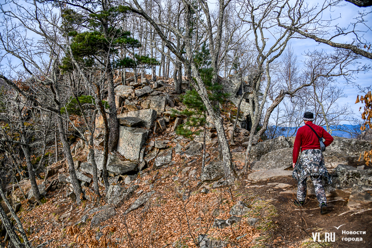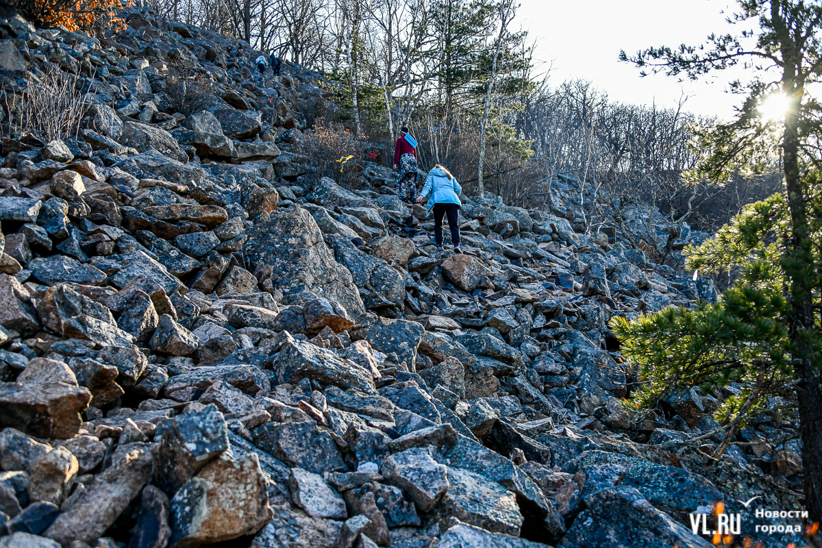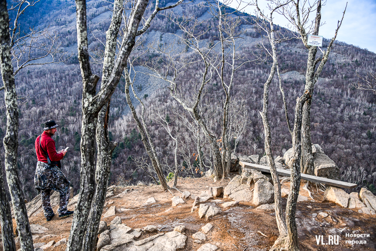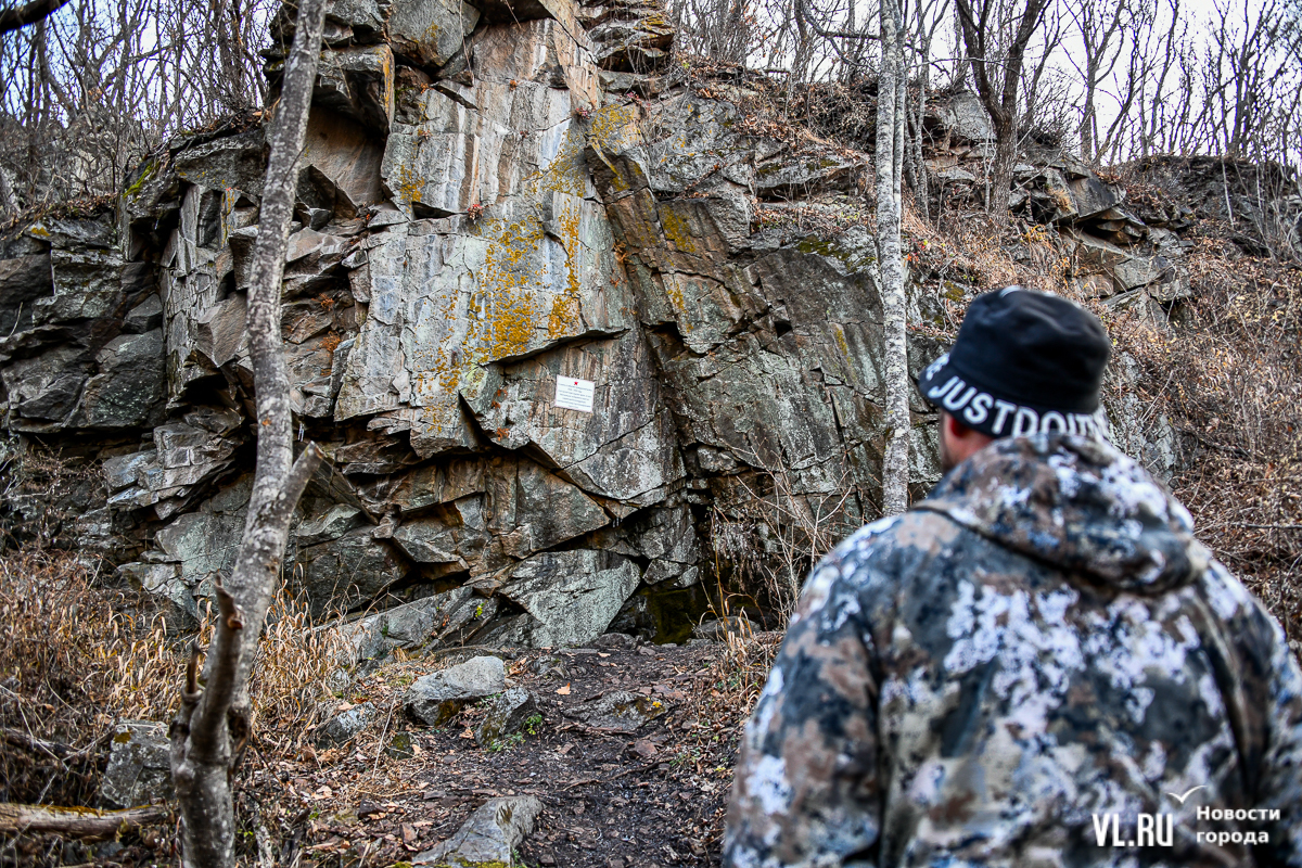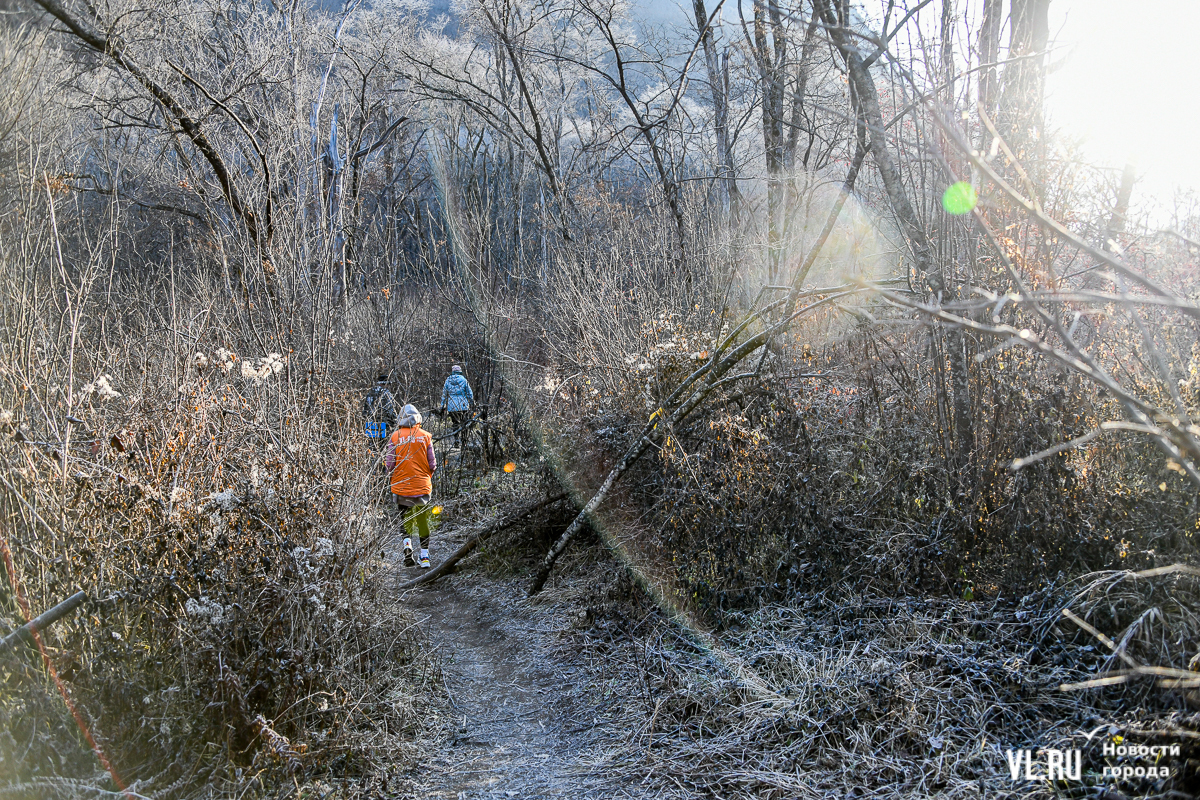 Выезжали из Владивостока ещё в темноте, и чем сильней мы отдалялись от побережья, тем холодней становился воздух на улице. Когда мы остановились в районе моста в сторону Бровничей, где начинается тропа на заветную скалу, то увидели, что весь подлесок здесь уже покрылся белым инеем. На улице было морозно и не очень комфортно. Всего две припаркованные на обочине машины говорили о том, что людей на скале было немного, а мы не зря встали так рано и оказались одними из первых.