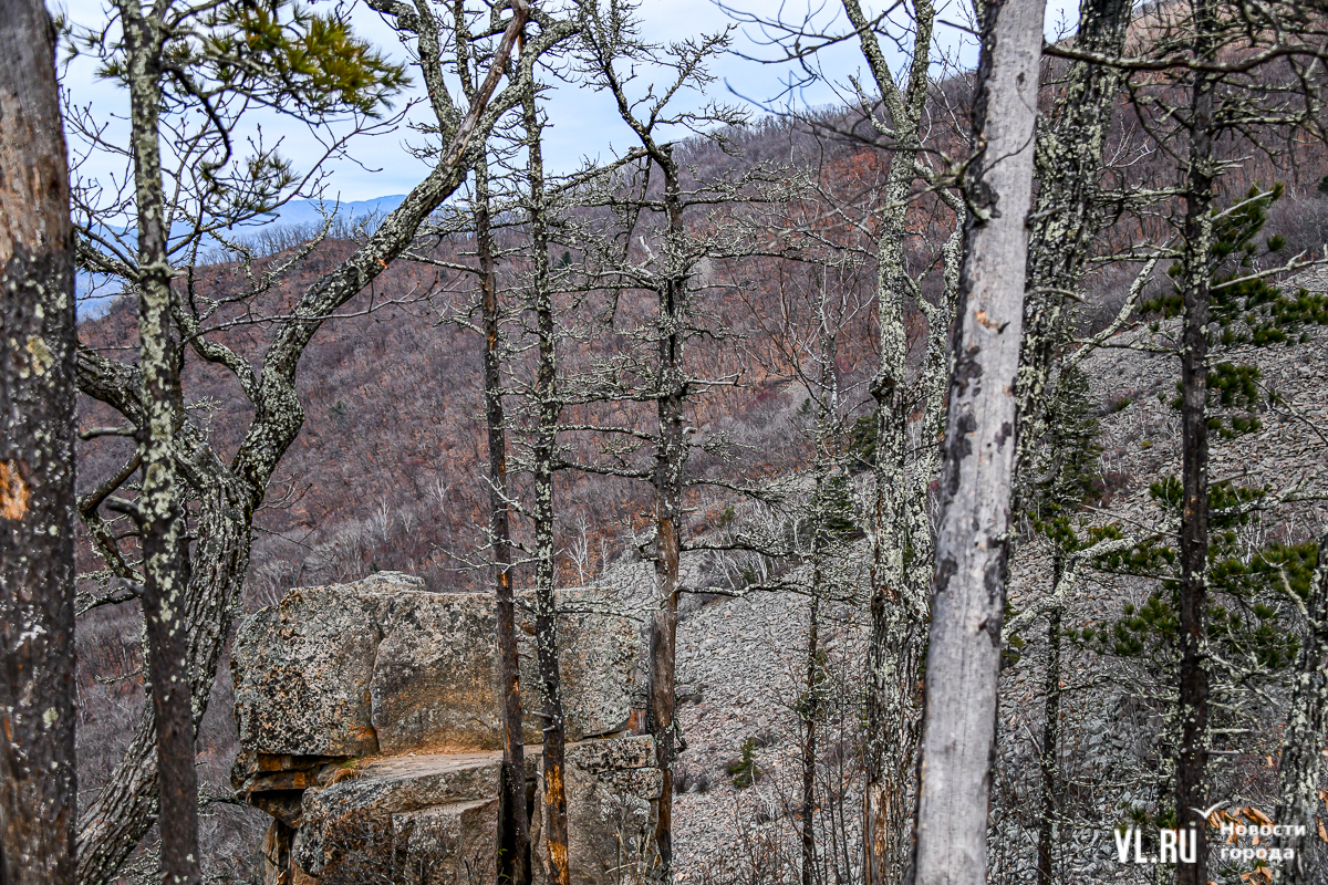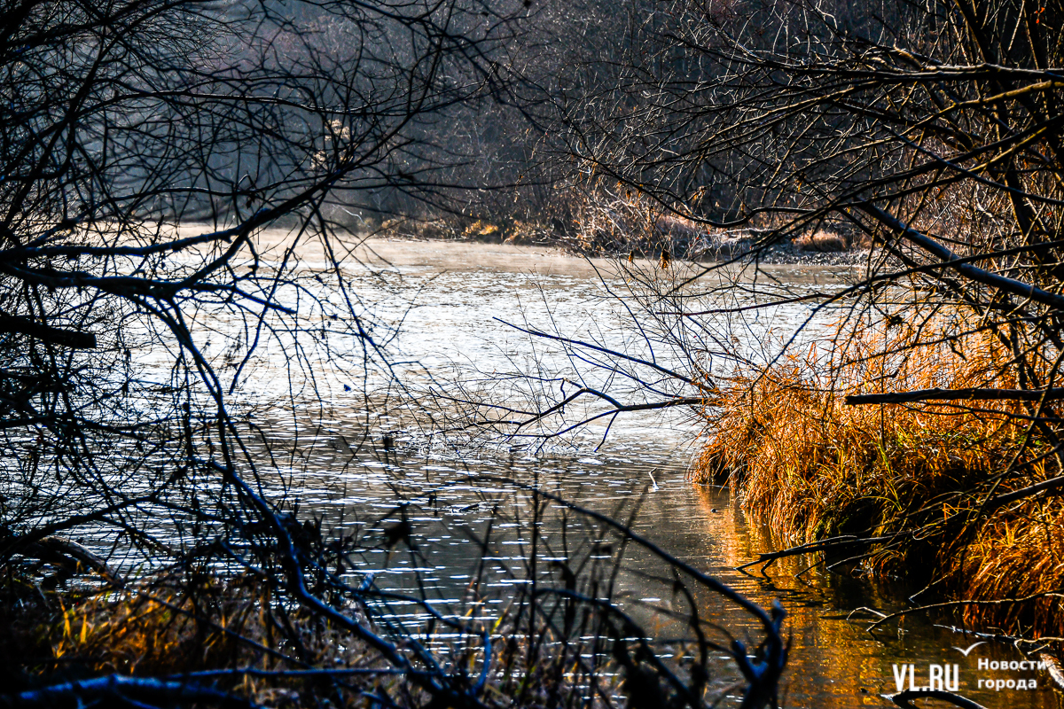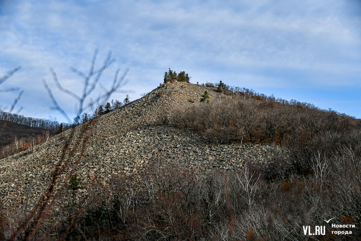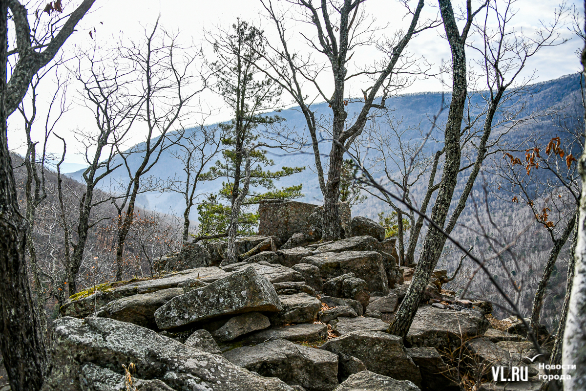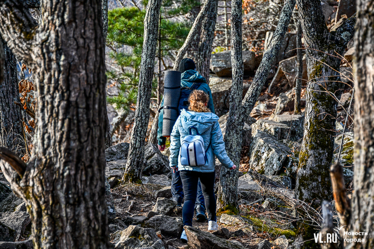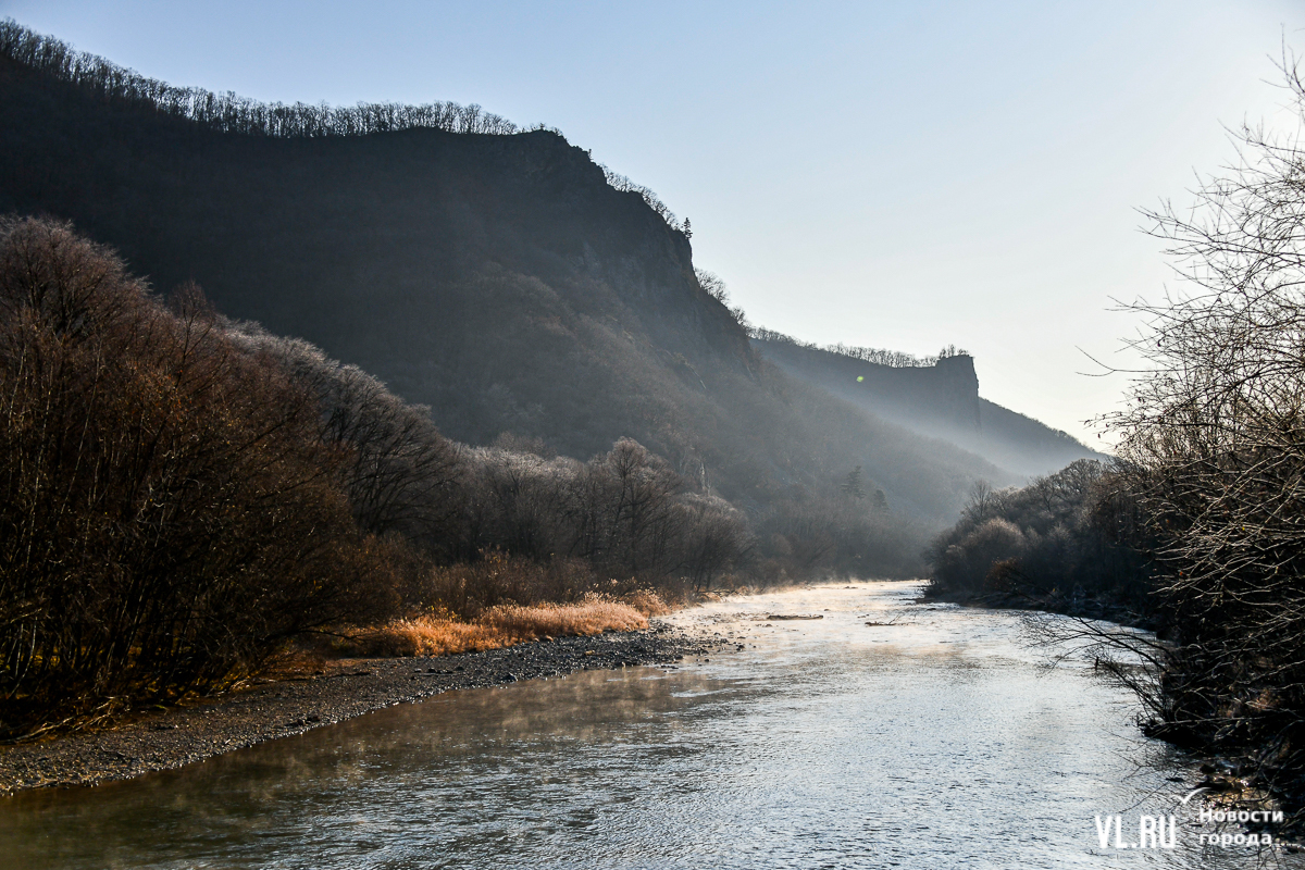 Выезжали из Владивостока ещё в темноте, и чем сильней мы отдалялись от побережья, тем холодней становился воздух на улице. Когда мы остановились в районе моста в сторону Бровничей, где начинается тропа на заветную скалу, то увидели, что весь подлесок здесь уже покрылся белым инеем. На улице было морозно и не очень комфортно. Всего две припаркованные на обочине машины говорили о том, что людей на скале было немного, а мы не зря встали так рано и оказались одними из первых.