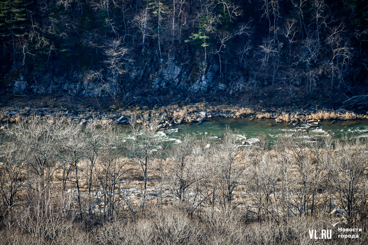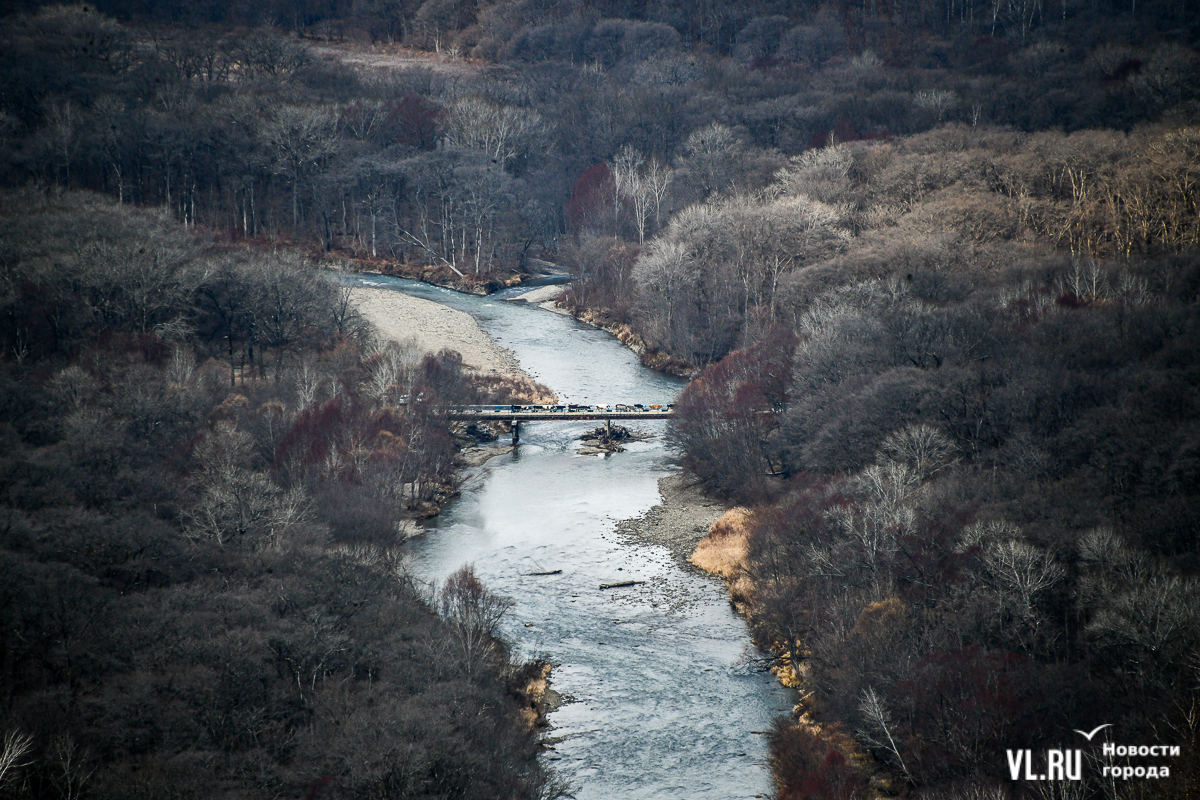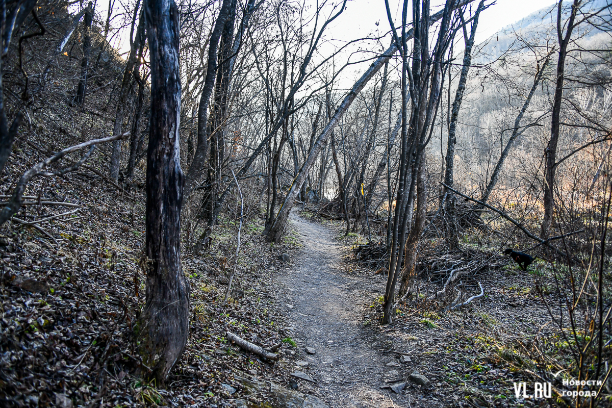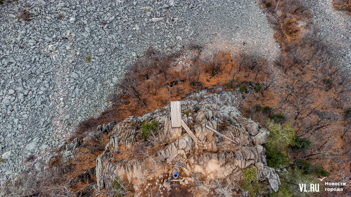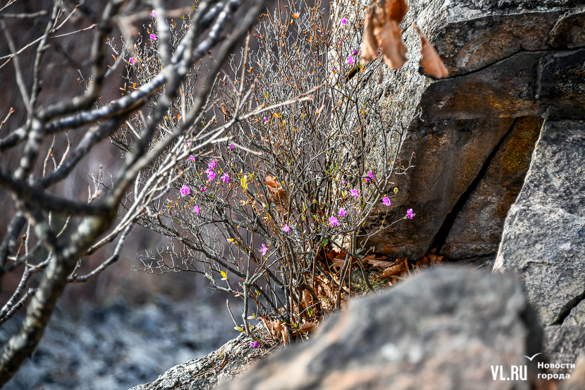 Выезжали из Владивостока ещё в темноте, и чем сильней мы отдалялись от побережья, тем холодней становился воздух на улице. Когда мы остановились в районе моста в сторону Бровничей, где начинается тропа на заветную скалу, то увидели, что весь подлесок здесь уже покрылся белым инеем. На улице было морозно и не очень комфортно. Всего две припаркованные на обочине машины говорили о том, что людей на скале было немного, а мы не зря встали так рано и оказались одними из первых.
