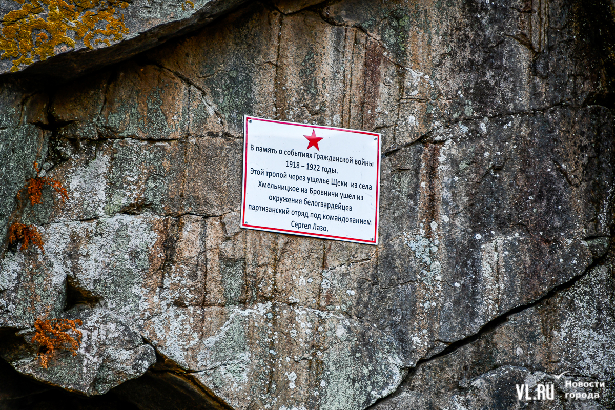 Первая часть маршрута оказалась лёгкой и непринуждённой: мы шли вдоль реки по лесу, разговаривали и пытались согреться от утреннего промозглого воздуха. Первая достопримечательность, которая повстречалась на нашем пути, – это табличка на скале, напоминающая о событиях Гражданской войны 1918–1922 годов. Она гласила, что этой тропой через ущелье Щеки из села Хмельницкое на Бровничи ушёл из окружения белогвардейцев партизанский отряд под командованием Сергея Лазо. Мы хоть и не были партизанами, но частично планировали повторить маршрут знаменитого красноармейца.