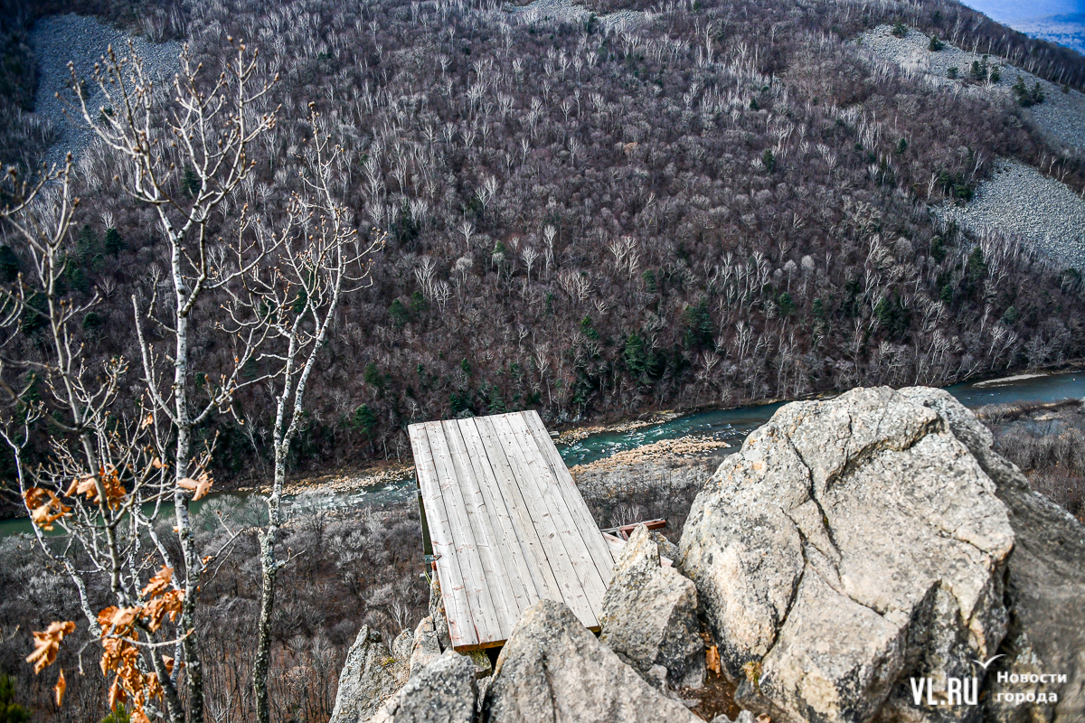 Ещё здесь есть небольшая лавочка, на которой можно посидеть и, наслаждаясь прекрасным видом на ущелье и бегущую где-то далеко внизу реку Тигровую, попить чай с бутербродами.