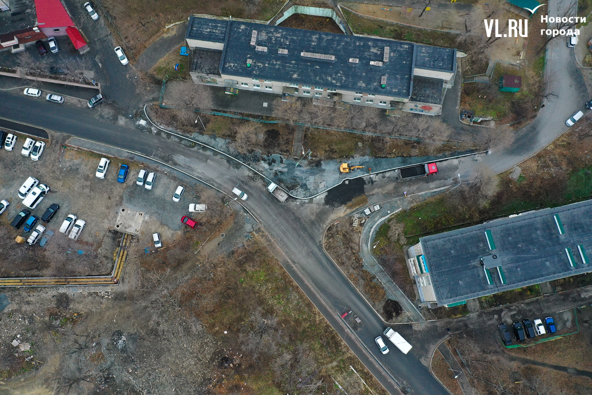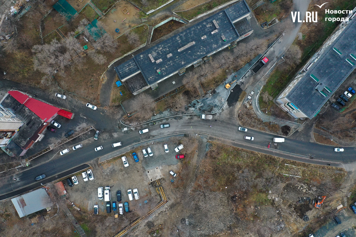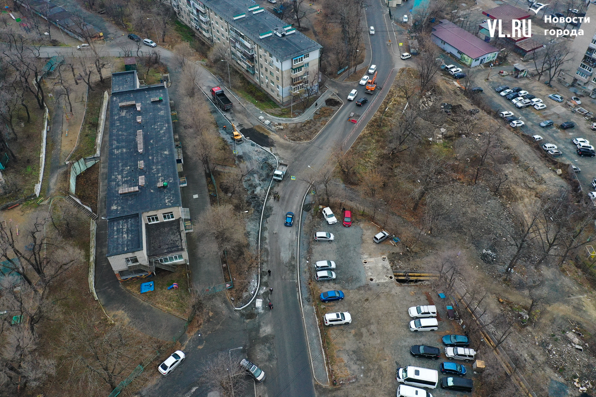 При проектировании дорог по БКД неоднократно указывалось, что дороги во Владивостоке во многих местах необходимо сузить до нормативной ширины. Но в случае с этим перекрёстком кажется, что перестарались. Место здесь было так много, что с лихвой хватило бы и на тротуары (и около учреждения, и через дорогу) и на как минимум один парковочный карман. Вместо этого у детсада тротуар стал сверхшироким, а напротив, у дома № 12, поставили клумбу.