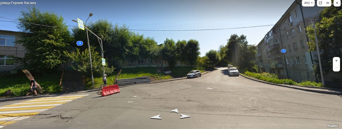 По словам местных жителей, да и по фотопанорамам видно, что на перекрёстке Героев Хасана и дороге, которая ведёт к домам на Гризодубовой, раньше был очень широкий проезд. Тротуаров тоже не было – ни около детсада (№ 14), ни у дома (№ 12) напротив, только вытоптанная обочина.