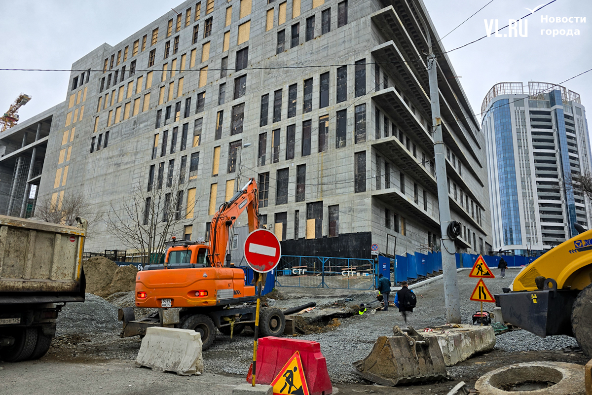 Дорогу в районе строящегося музейно-театрального центра ремонтируют уже давно. В частности, перекрыт проезд вдоль стройки от Гоголя к общежитию ДВФУ на Державина, 15. Сегодня тут тоже работала техника. Но этот участок можно объехать как раз по улице Державина, вдоль соседних общежитий.