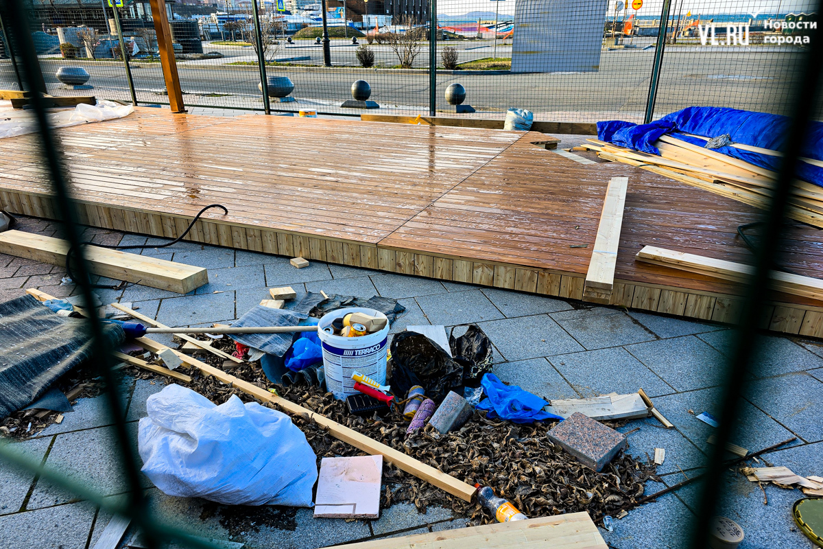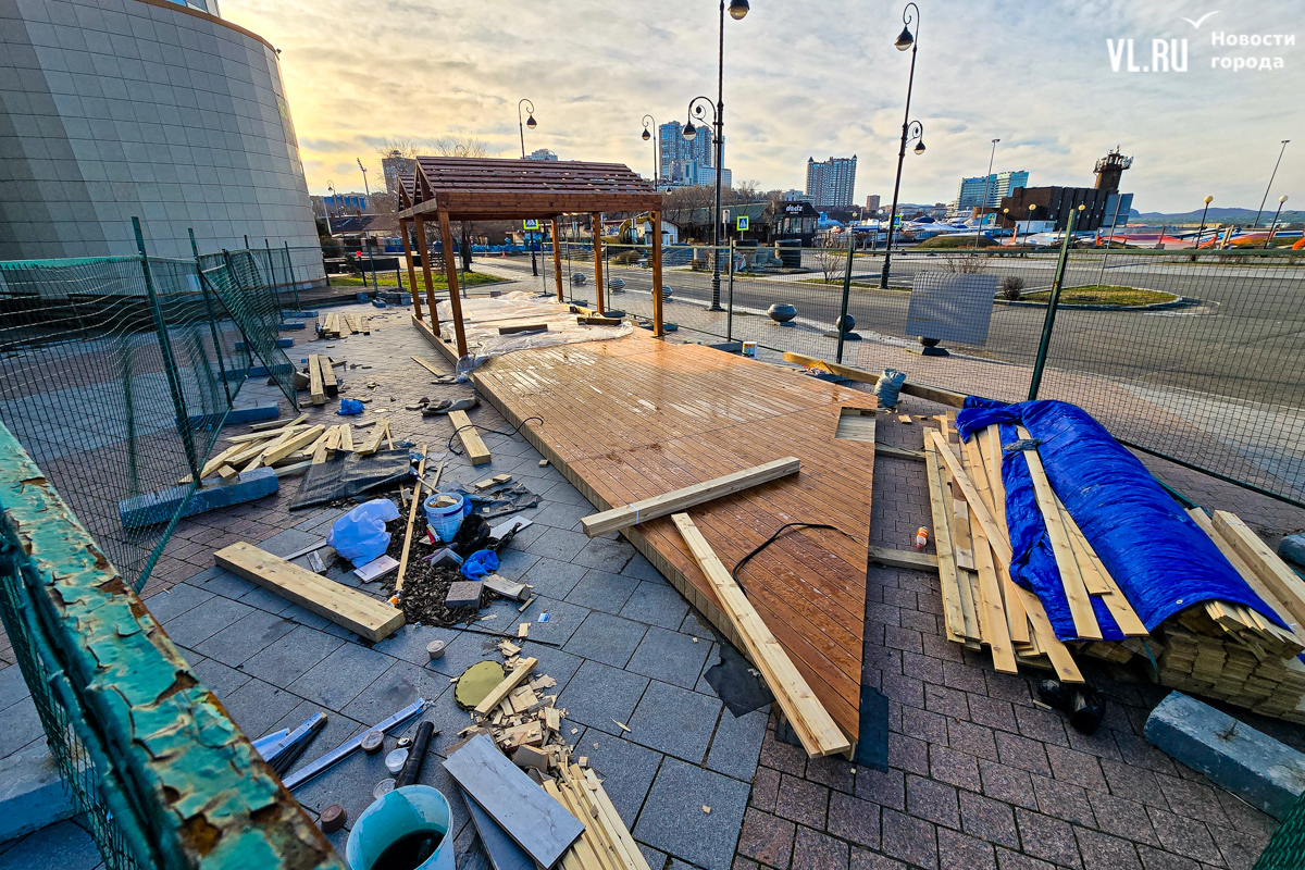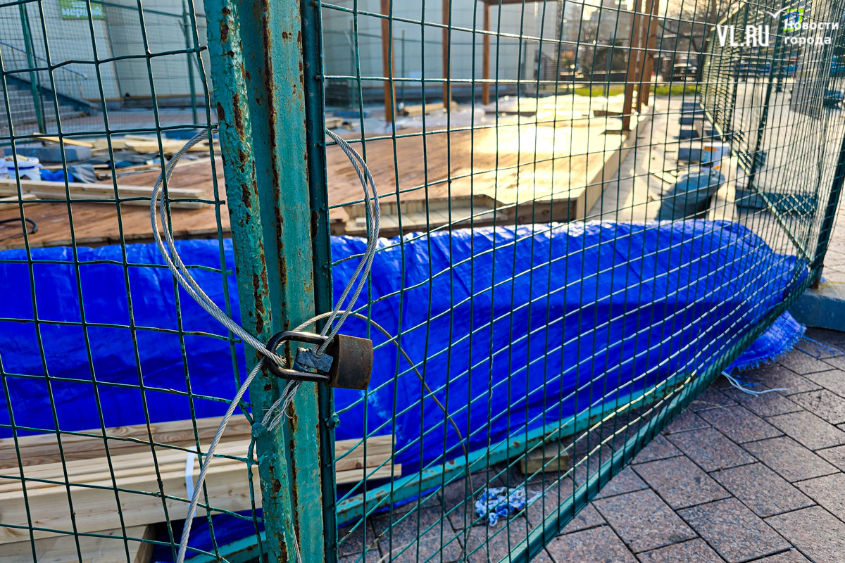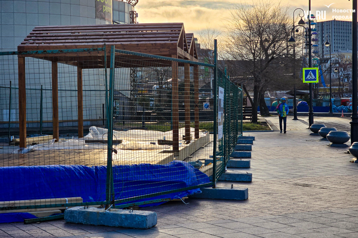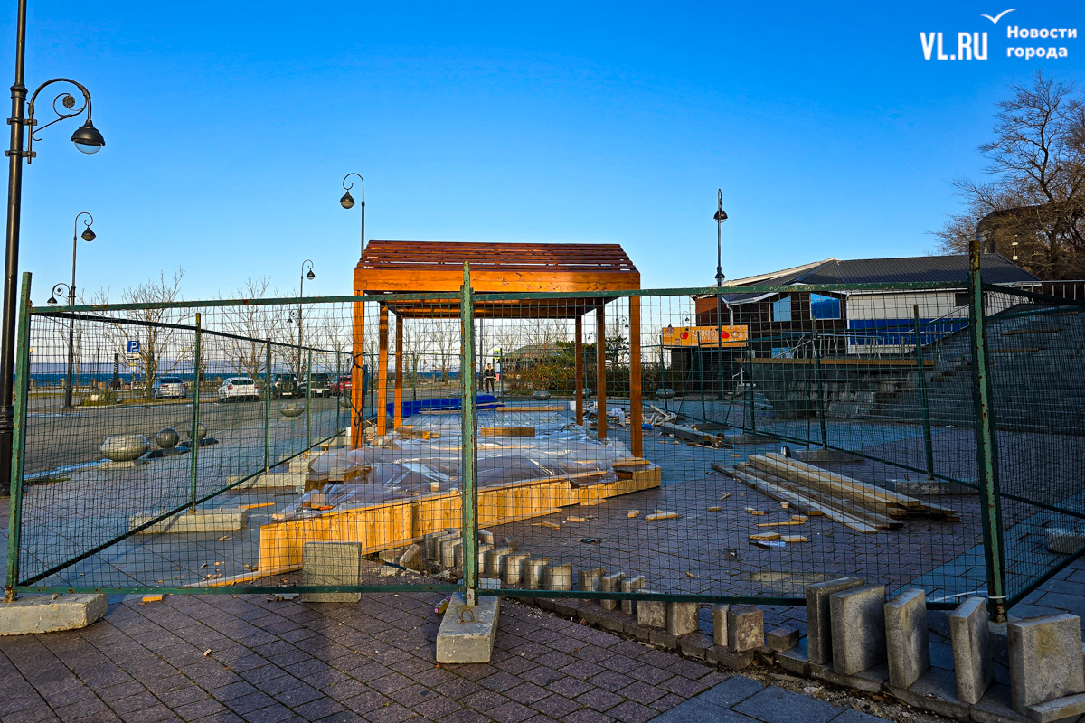 Работы по возведению новой зоны отдыха во Владивостоке, возле океанариума на улице Батарейной, притормозились. Завершить строительство должны были до конца октября, однако территория до сих пор огорожена. За забором можно увидеть только деревянный настил и навесы, а также брошенные строителями личные вещи. Самих строителей давно уже не видно. Как сообщили в ДОМ.РФ, за чей счёт создаётся общественное пространство, срок сдачи объекта перенесли на декабрь.