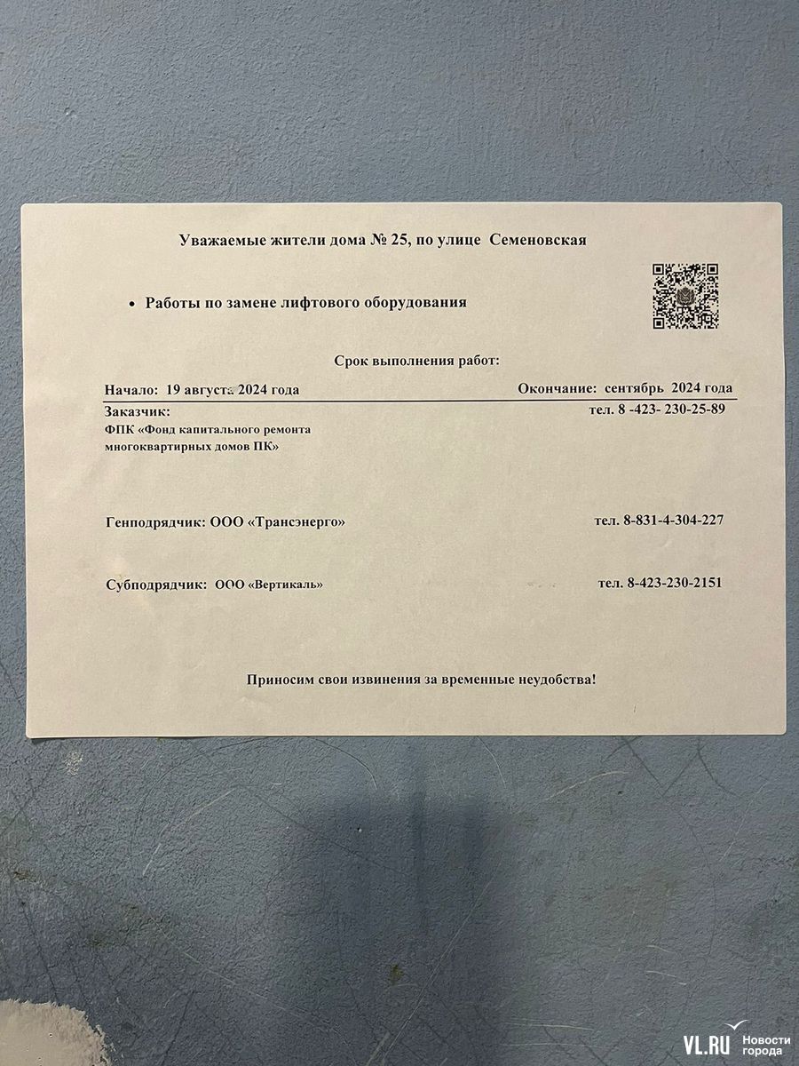 Во Владивостоке по меньшей мере в 13 домах не работают лифты из-за затянувшегося ремонта. В фонде капремонта сообщили, что где-то, помимо самих кабин, износились дверные проёмы, где-то потребовались дополнительные работы в шахтах и лифтовых комнатах, а, например, на Семёновской, 25 доступа к коммуникациям нет из-за офиса в подвале. При этом жители дома говорят, что никаких препятствий со стороны офиса нет. Ремонтом в этих домах, а также ещё по трём десяткам адресов, занимается одна компания.