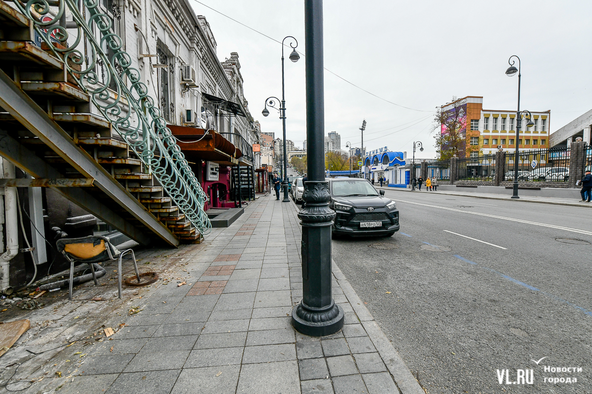 В центре города наибольшее неудобство столбы создают на улице Пограничной. Они не троллейбусные, их ставили для освещения к саммиту АТЭС. Почему тогда не думали про удобство пешеходов, непонятно. Но тротуары тут узкие сами по себе, а пешеходный трафик очень высокий, историческая часть города как-никак. Самое узкое место – около Пограничной, 6. Главная проблема – в капитальной пристройке, которая заняла больше половины тротуара. С 2022 года мэрия судится за снос этой террасы. Но пока суд да дело, пешеходам приходится ждать, пропуская встречных, или выходить на дорогу.