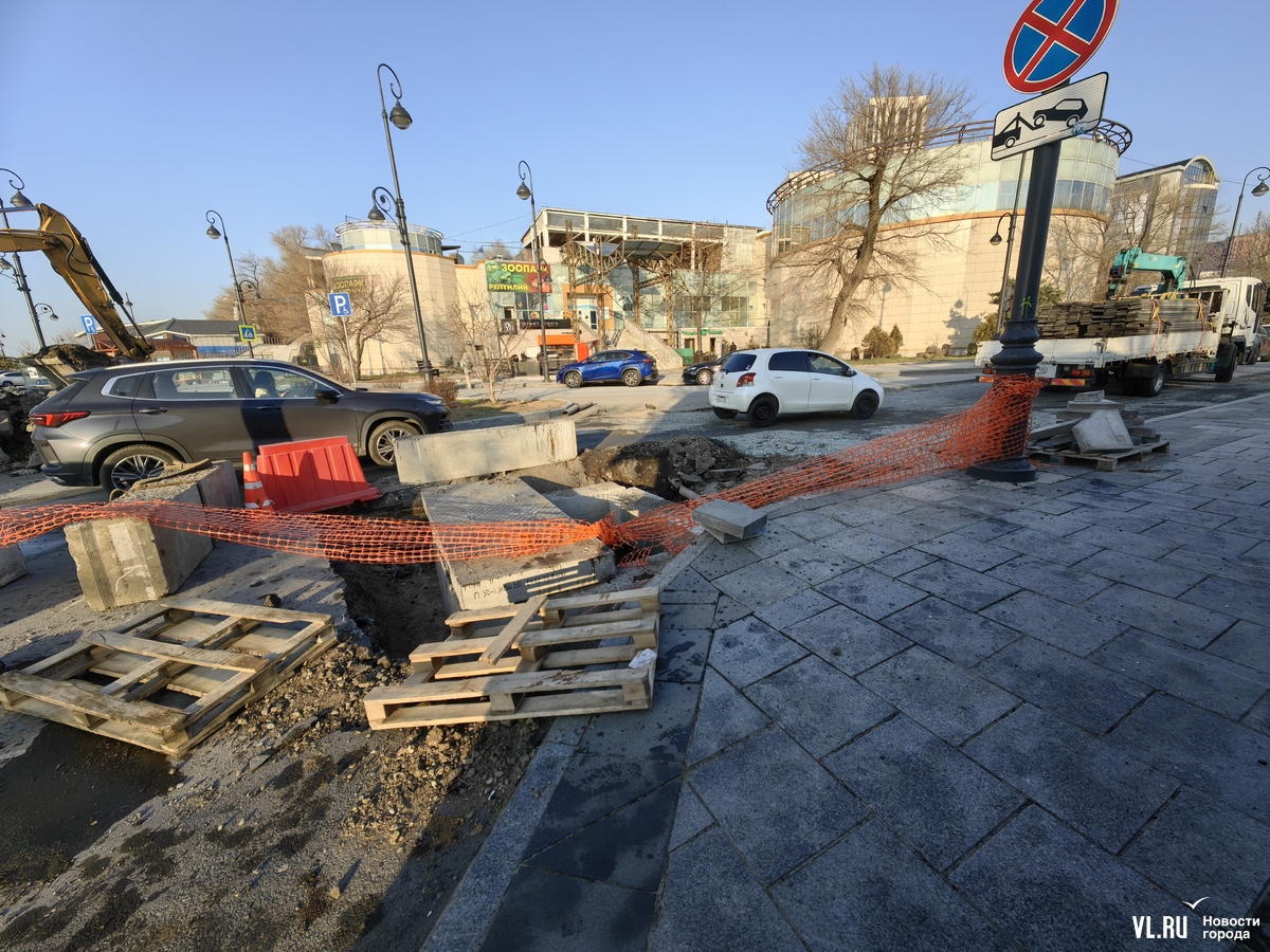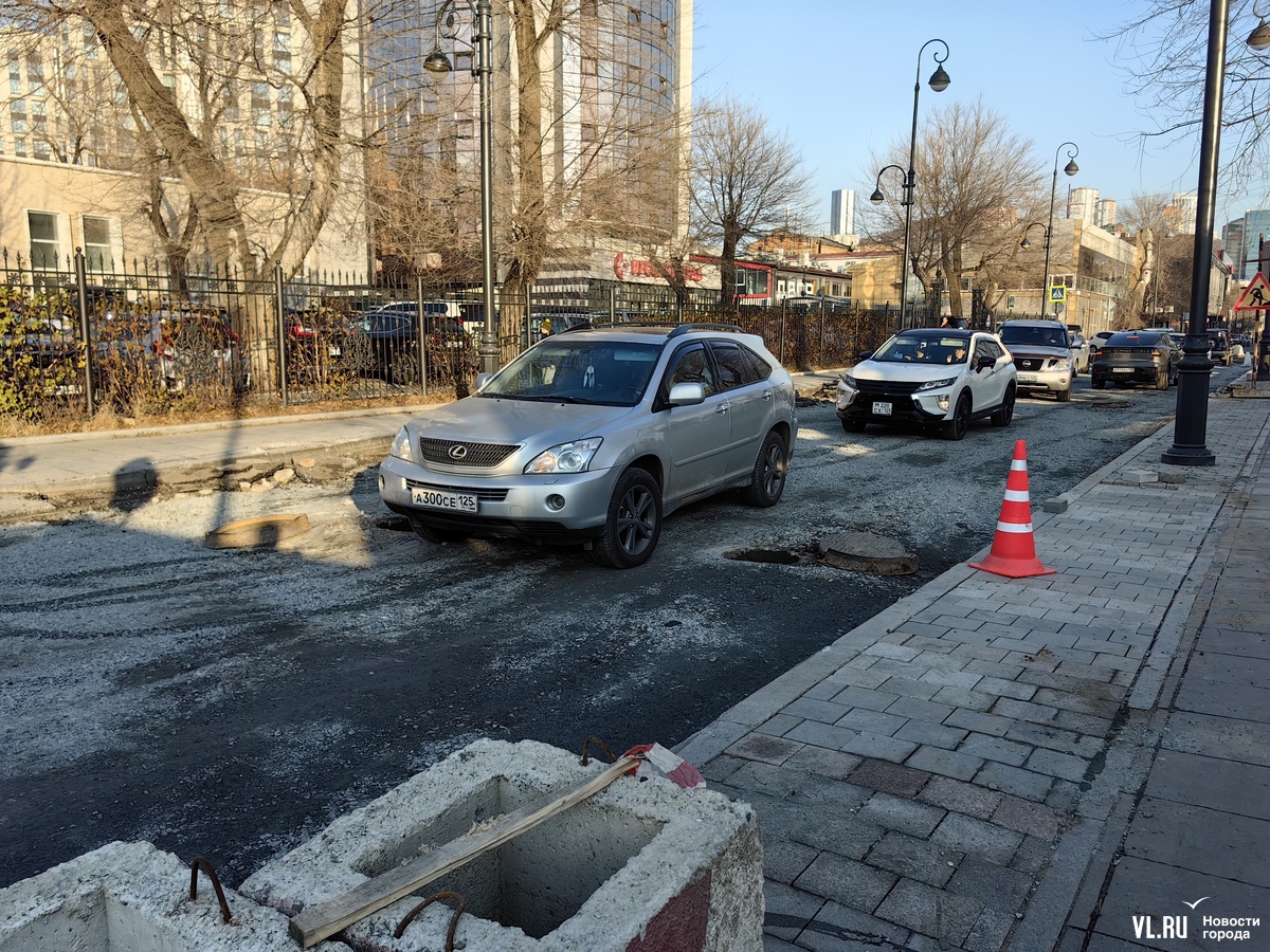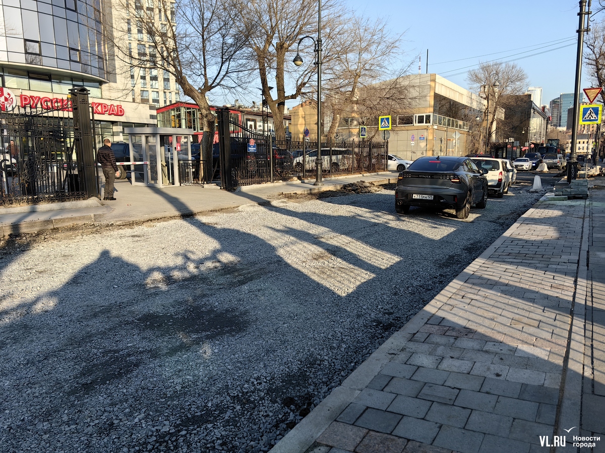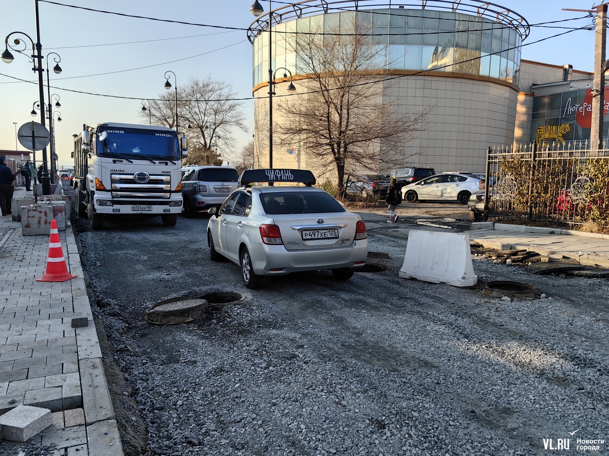 Бригада рабочих сейчас выравнивает основание под будущее асфальтирование, а между техникой, стройматериалами, разрытыми траншеями и открытыми люками протискиваются автомобили. На вид до полного завершения работ ещё далеко, однако в администрации Владивостока сообщили, что укладывать дорожное покрытие начнут уже сегодня вечером, примерно с 22:00.