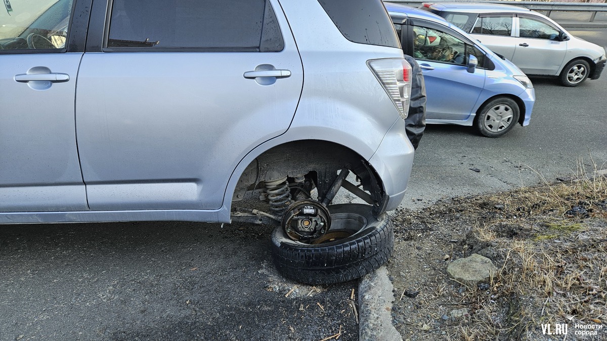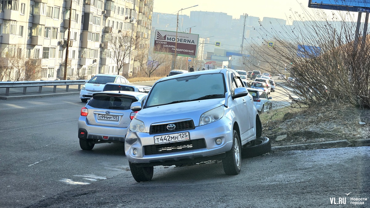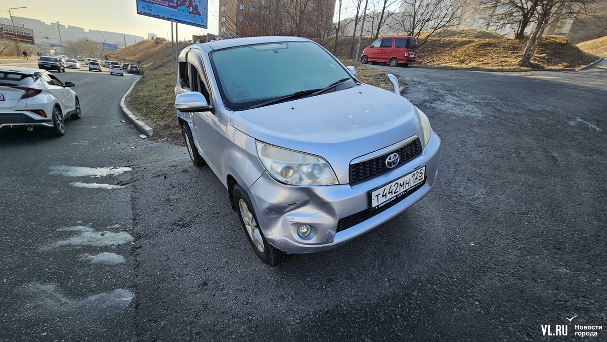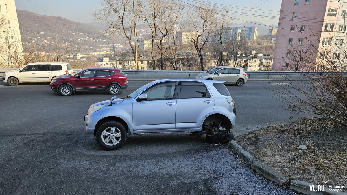 Уже несколько дней на улице Котельникова во Владивостоке посреди дороги стоит брошенный автомобиль Toyota Rush со следами ДТП. У него помяты правые двери, выбиты стёкла, заднее левое колесо оторвано и служит опорой. Машина стоит поперёк спуска от гостиницы «Гранит» и перекрывает одну полосу. Но ни хозяин, ни ГАИ до сих пор её не убрали.