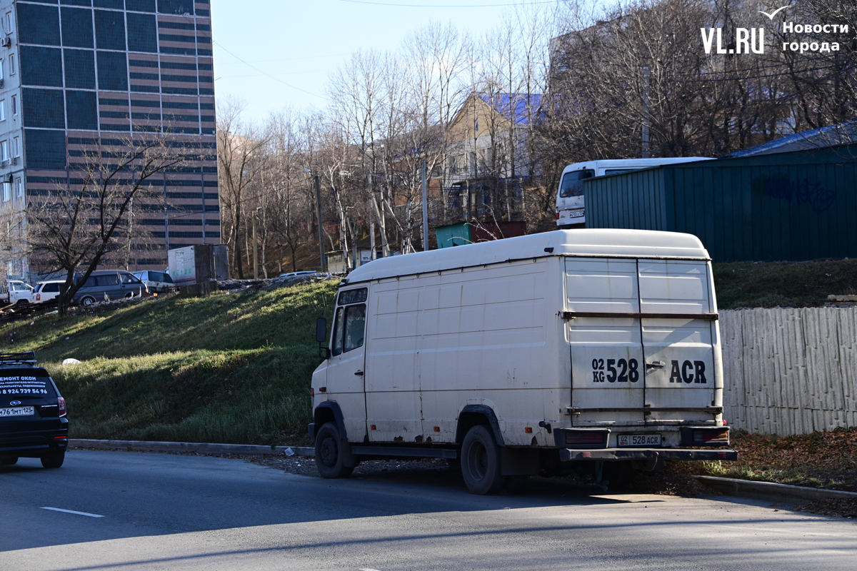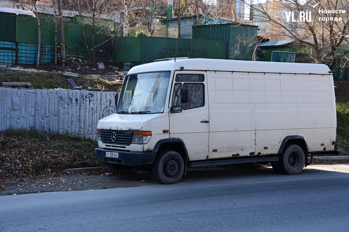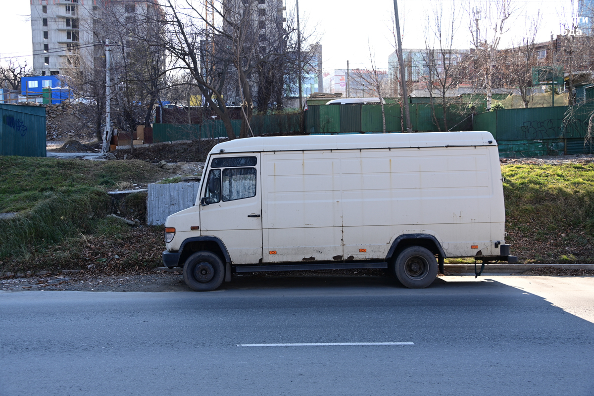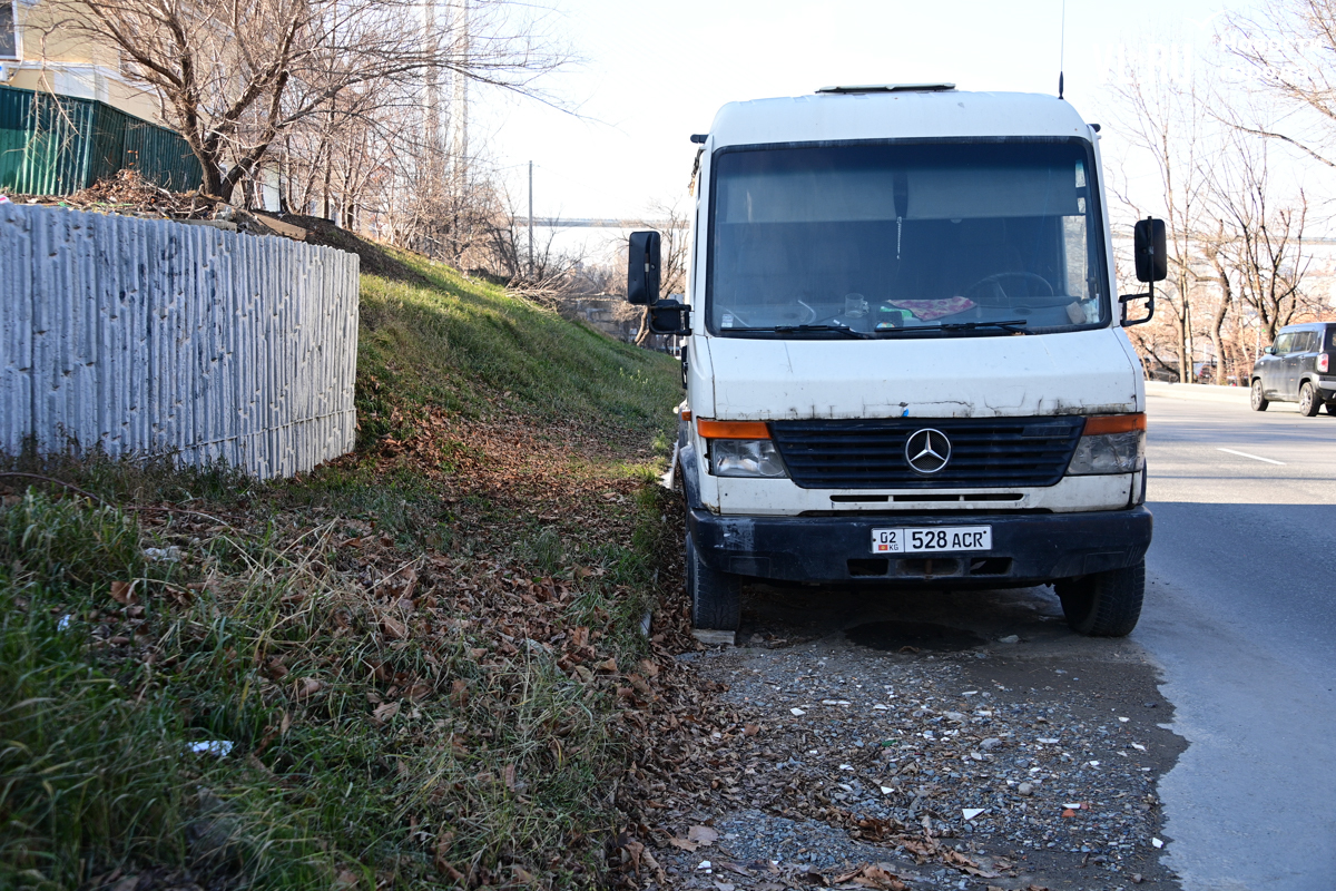 Старенький Mercedes оставили на дороге недалеко от дома № 57 на Калинина. Местный дворник говорит, что микроавтобус стоит тут уже больше месяца. Проверка номеров на портале электронных услуг Кыргызской Республики показала, что это дизельный Mercedes-Benz 612D 1997 года – один из первых, выпущенных в этой модели. Это не пассажирский автобус, а скорее грузовой фургон – в нём три места спереди и нет окон.