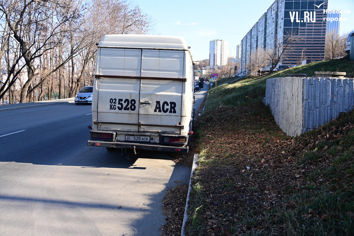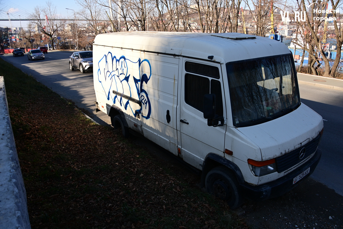 На Калинина у обочины дороги уже больше месяца стоит микроавтобус с киргизскими номерами. Его разрисовали граффити, колёса забились листвой, кузов начал ржаветь. Но вывозить его отсюда как брошенный автомобиль не будут – у него недостаточно признаков брошенности.