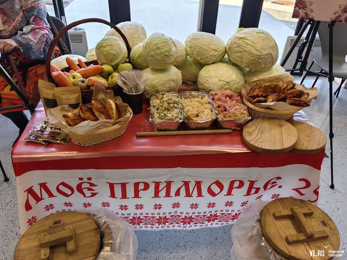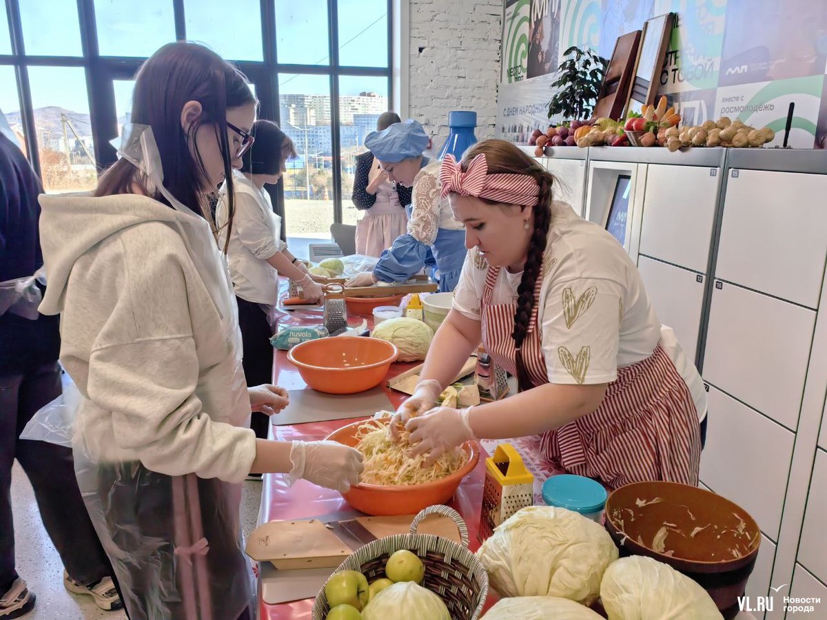 За длинным столом шинковали и засаливали капусту. К большой тёрке подходили и дети, и девушки, а мастерицы в ярких костюмах сопровождали весь процесс. Рядом стояли кадки с уже готовой капустой и испечённые пирожки с капустой для пробы.