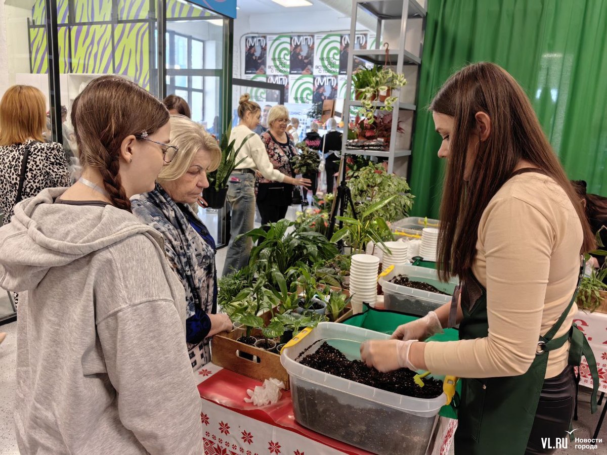 За столами, уставленными горшками с цветами, учили пересаживать растения. Для гостей подготовили грунт, белые горшочки и цветы – фиалки, спатифиллум, алоэ, каланхоэ и другие. Выбрать можно было любой и, посадив в горшок, увезти домой. Весь процесс сопровождала ведущая, она же давала напутствие-инструкцию, как ухаживать за растением дома и что делать, если оно заболеет.