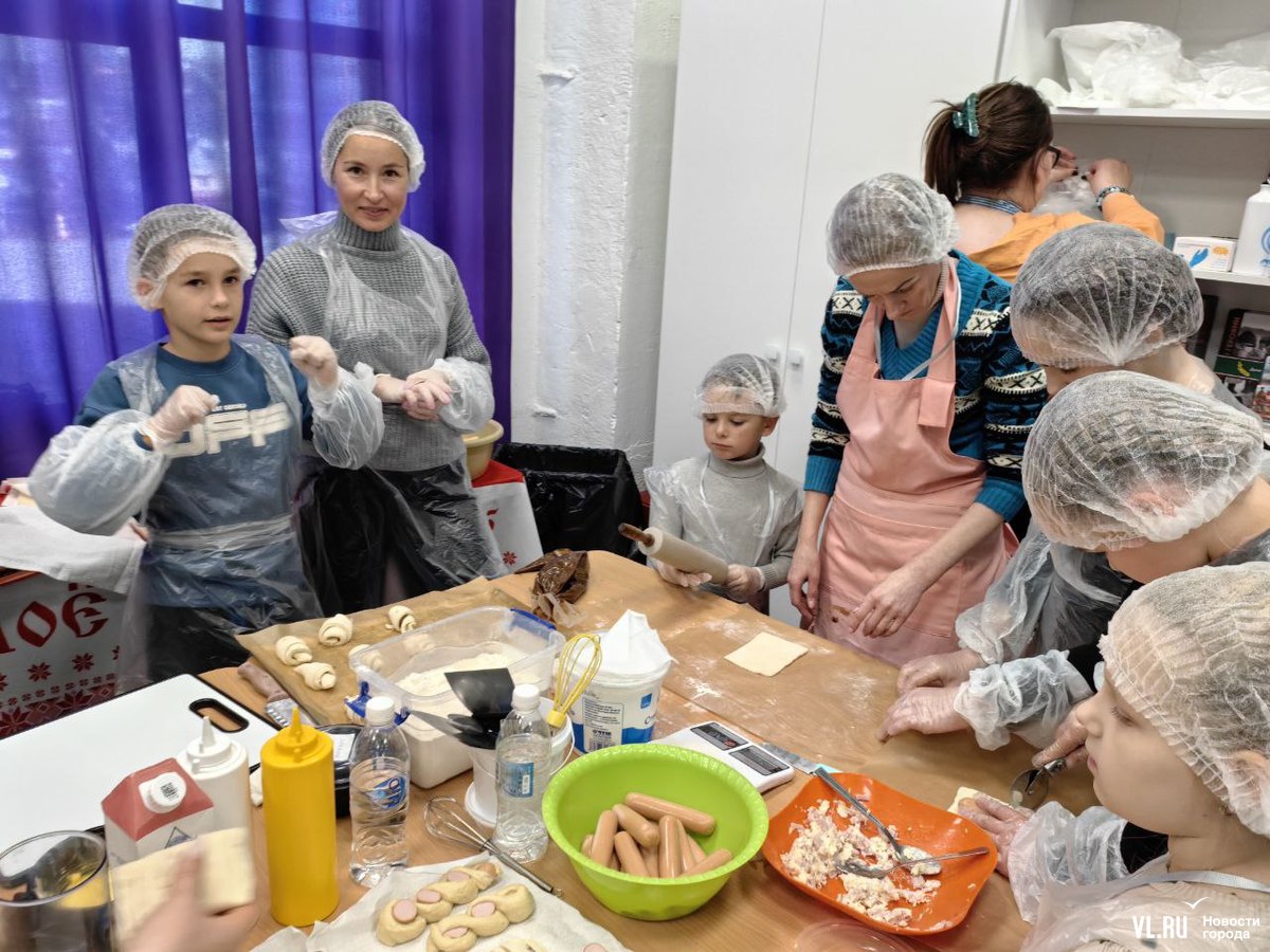 В отдельной комнате шли мастер-классы по выпечке. Особенно интересно это было маленьким поварятам. Ведущие надевали на них фартуки и нарукавники, давали тесто и сосиски, учили заворачивать, плести косички и трубочки. Готовые сосиски в тесте дети съедали сами или несли угощать своих мам.