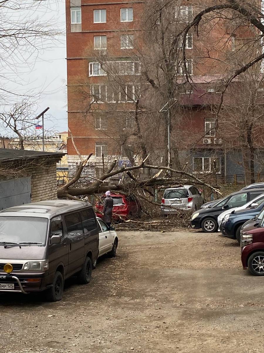 12:05: Буйства стихии не выдержало и дерево в районе Пологой, 62 – ствол сломался и лёг на крыши и лобовые стёкла сразу пяти автомобилей. Извилистые ветки попали внутрь салонов Honda Fit и Mazda CX-3 и аккуратно прилегли на Toyota Vanguard. Nissan Note буквально начал лопаться под весом ствола, владелице Toyota Ractis пришлось заклеивать стёкла скотчем, повезло только владельцу Volkswagen Tiguan, потому что пополам дерево разломилось ровно в нескольких сантиметрах от него.