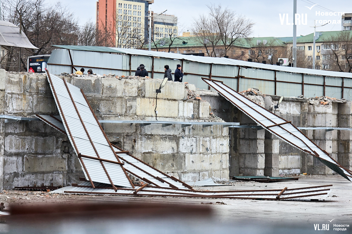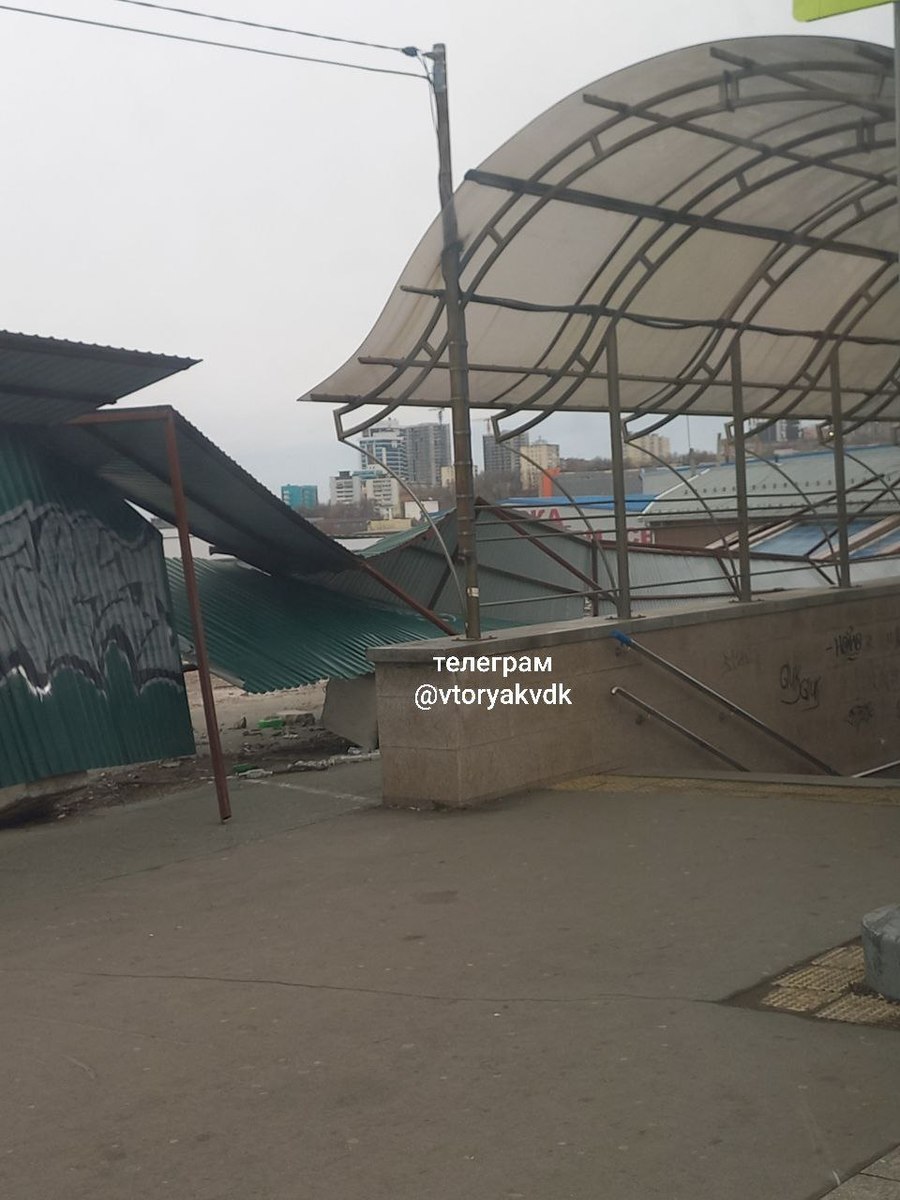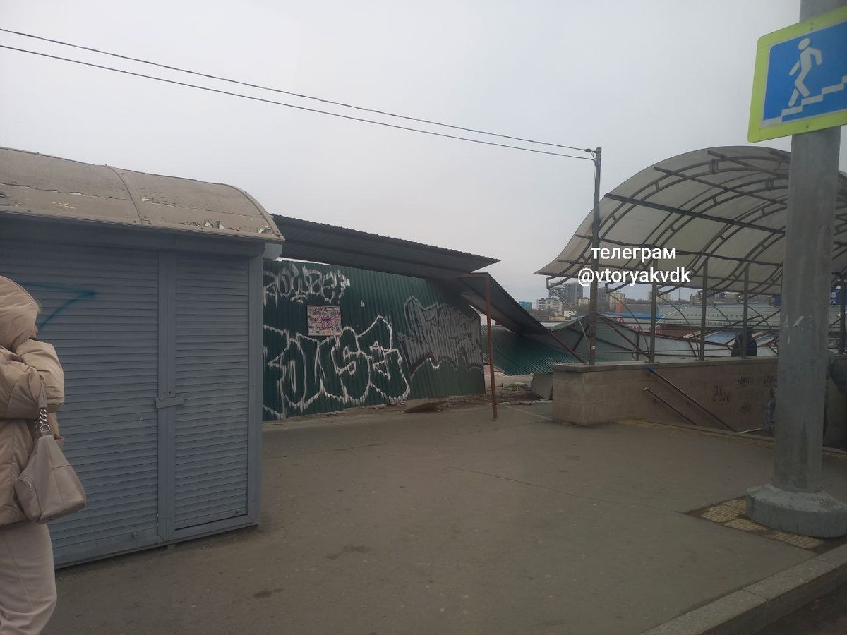 12:23: На Постышева упало несколько секций забора вокруг бывшего ТЦ «Максим». Сейчас там остался котлован после сноса торгового центра, в него как раз и упала часть забора. Остальное ограждение сейчас разбирают строители, несмотря на сильный ветер.
