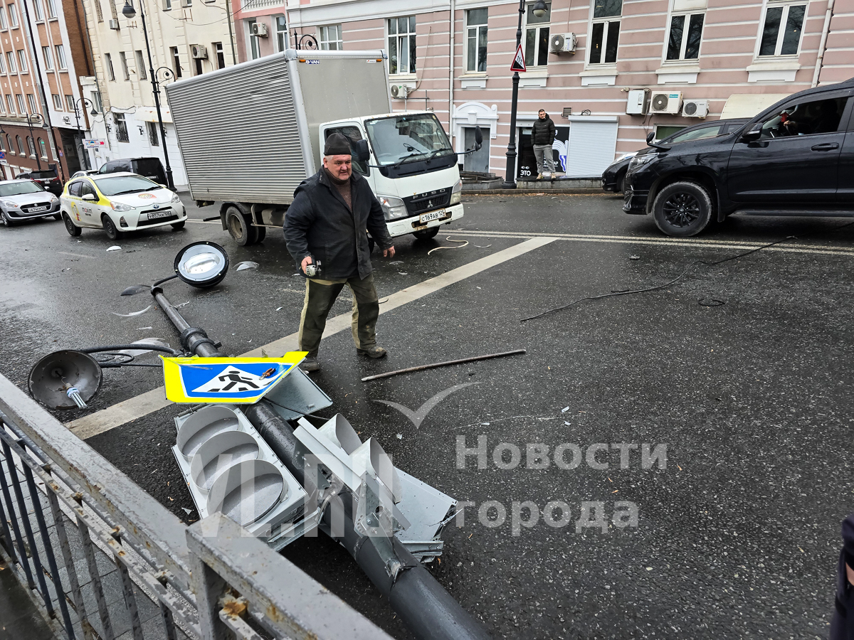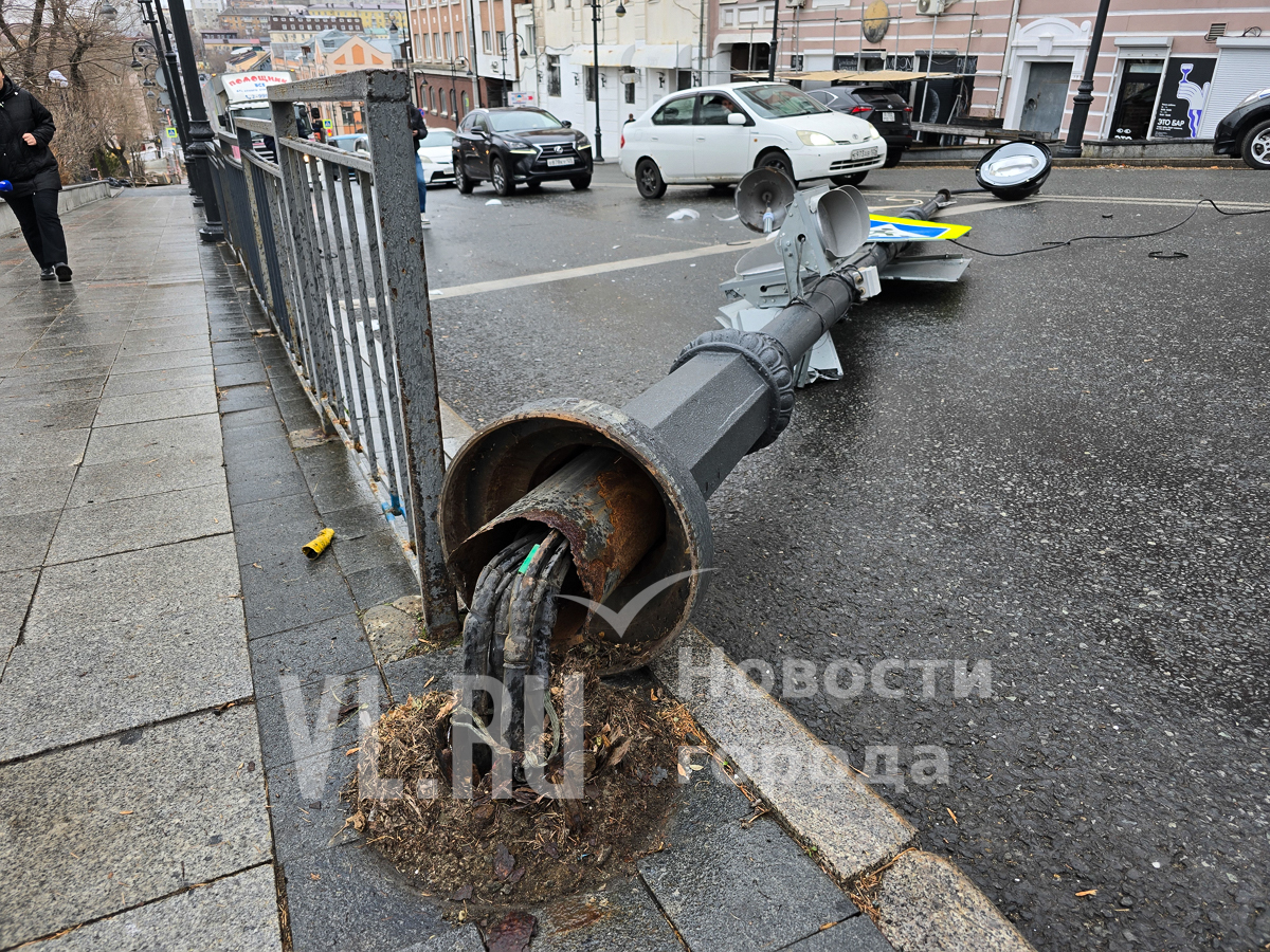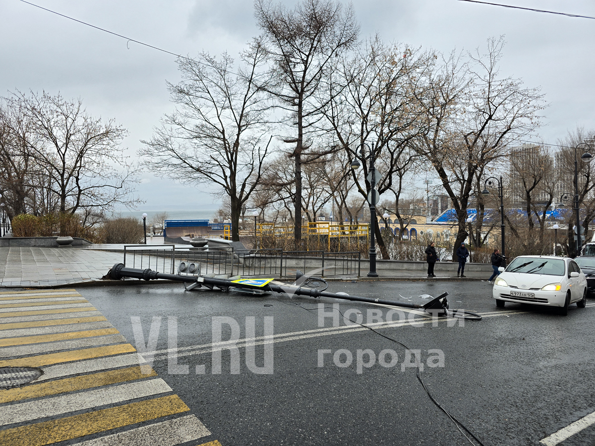 Обновление 10:51: Сильный ветер повалил фонарь на перекрёстке Пограничной и Светланской. Автомобили, поднимающиеся со стороны стадиона «Динамо», вынуждены объезжать его по встречной полосе. Здесь уже собралась пробка.