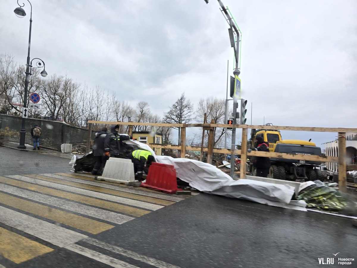 17:52: На Русском острове упал фонарный столб. Полторы полосы в сторону моста оказались перекрыты.