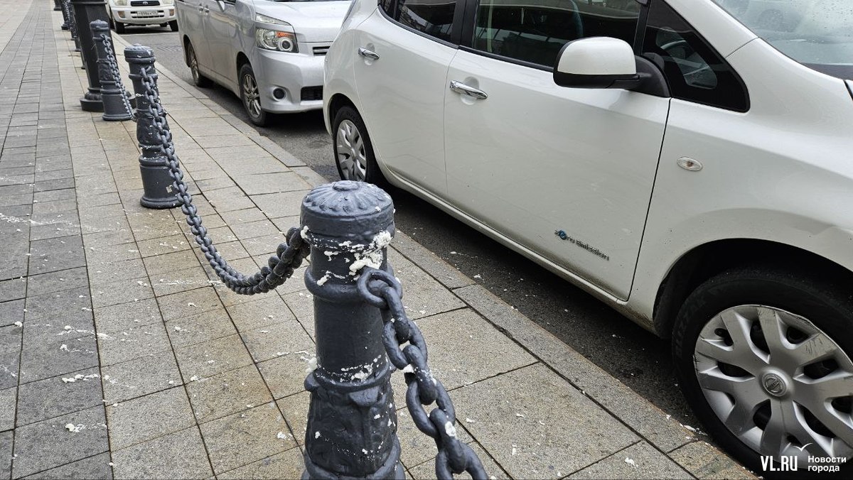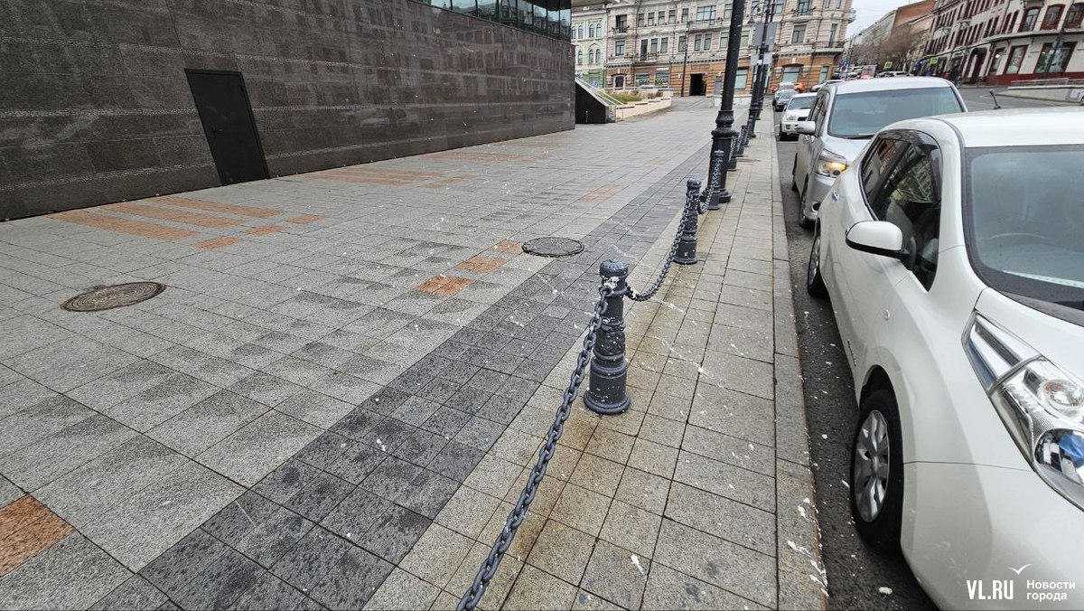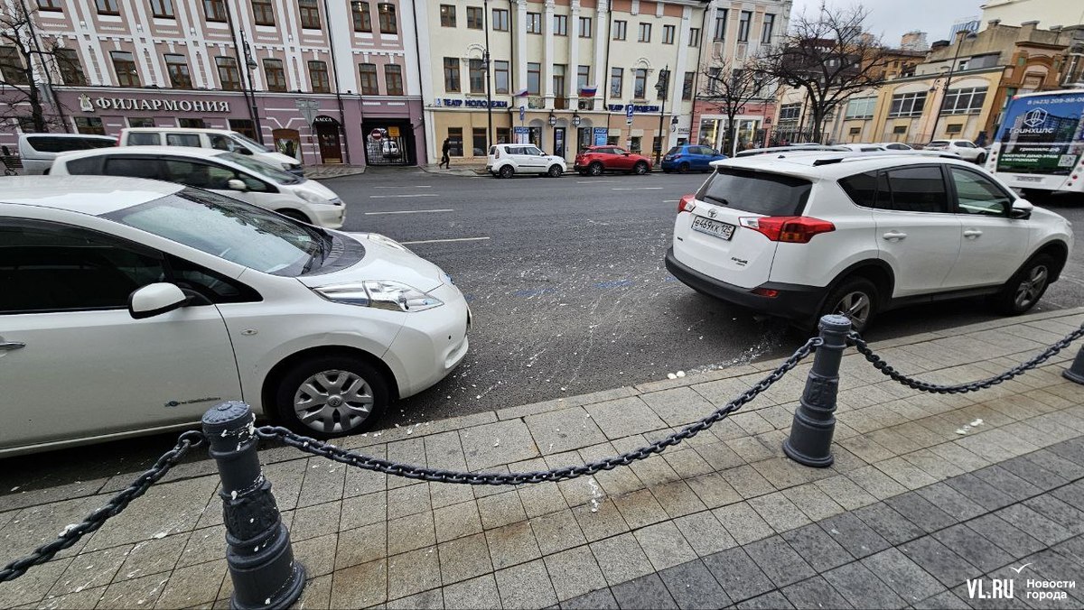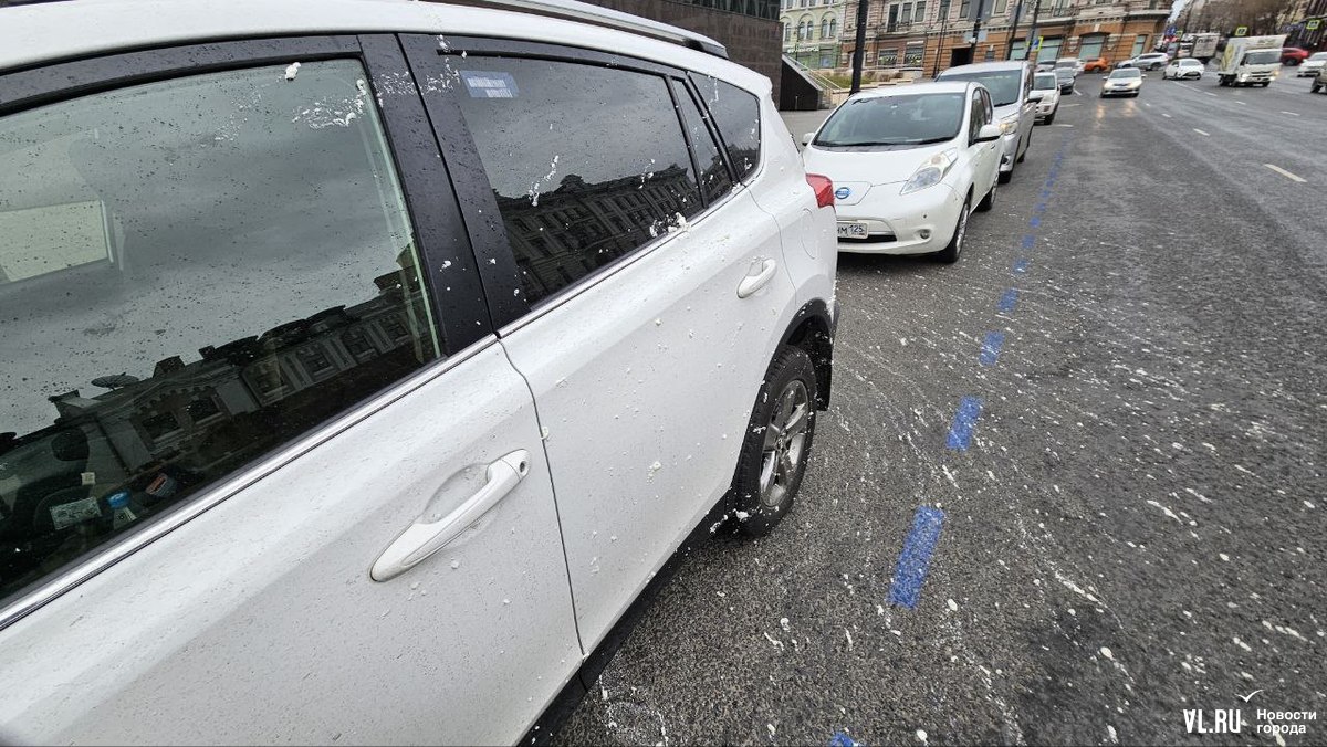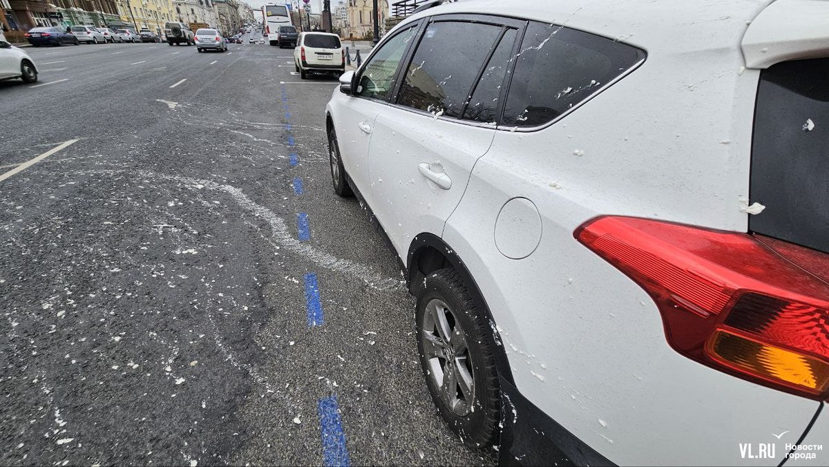 А вот на Светланской возле здания правительства края на тротуаре, дороге и даже припаркованных автомобилях можно заметить следы другого мусора и даже монтажной пены. Возможно, что-то прилетело с высоты и сюда. Похоже, что владельцы авто ещё не знают о случившемся.