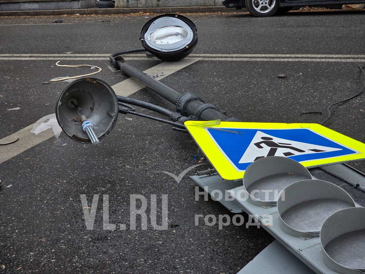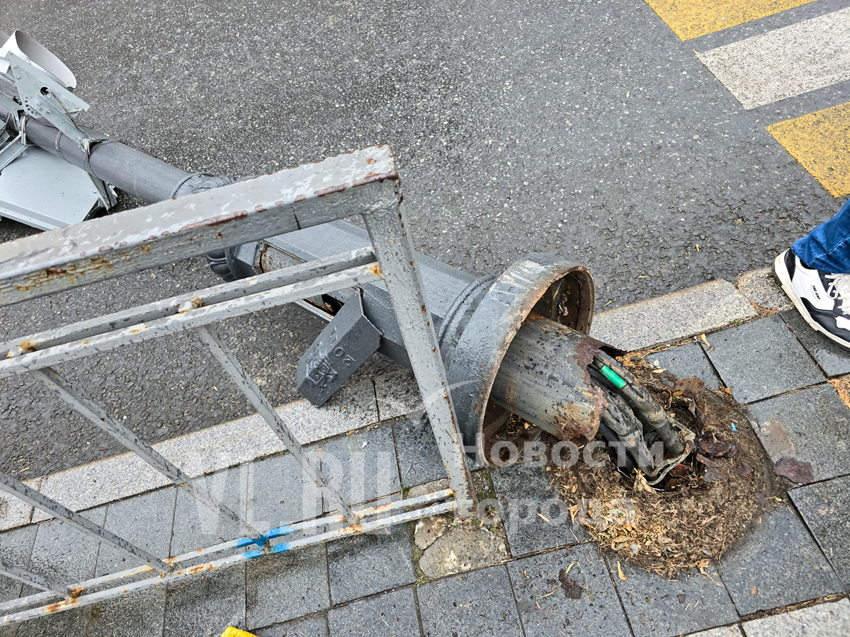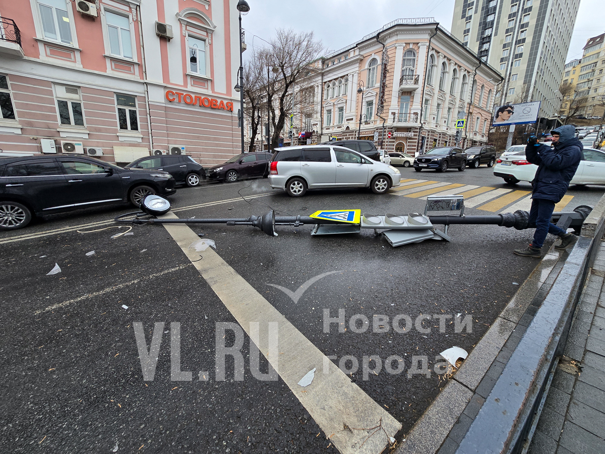 Ещё одной проблемной точкой стал перекрёсток Пограничной – Светланской – Тигровой. Тут упал фонарный столб, перекрыв полдороги со стороны стадиона «Динамо». Судя по всему, основание опоры сильно проржавело. Кажется, такие столбы ставили во время ремонта к саммиту АТЭС, то есть уже 12 лет назад. А на этот столб ещё и повесили дорожные знаки и светофор, которые, судя по всему, выступили парусом.