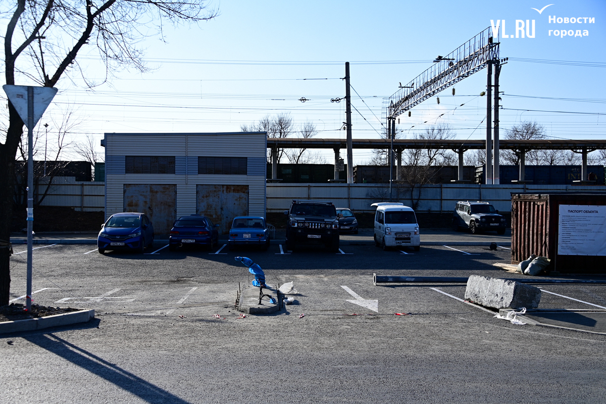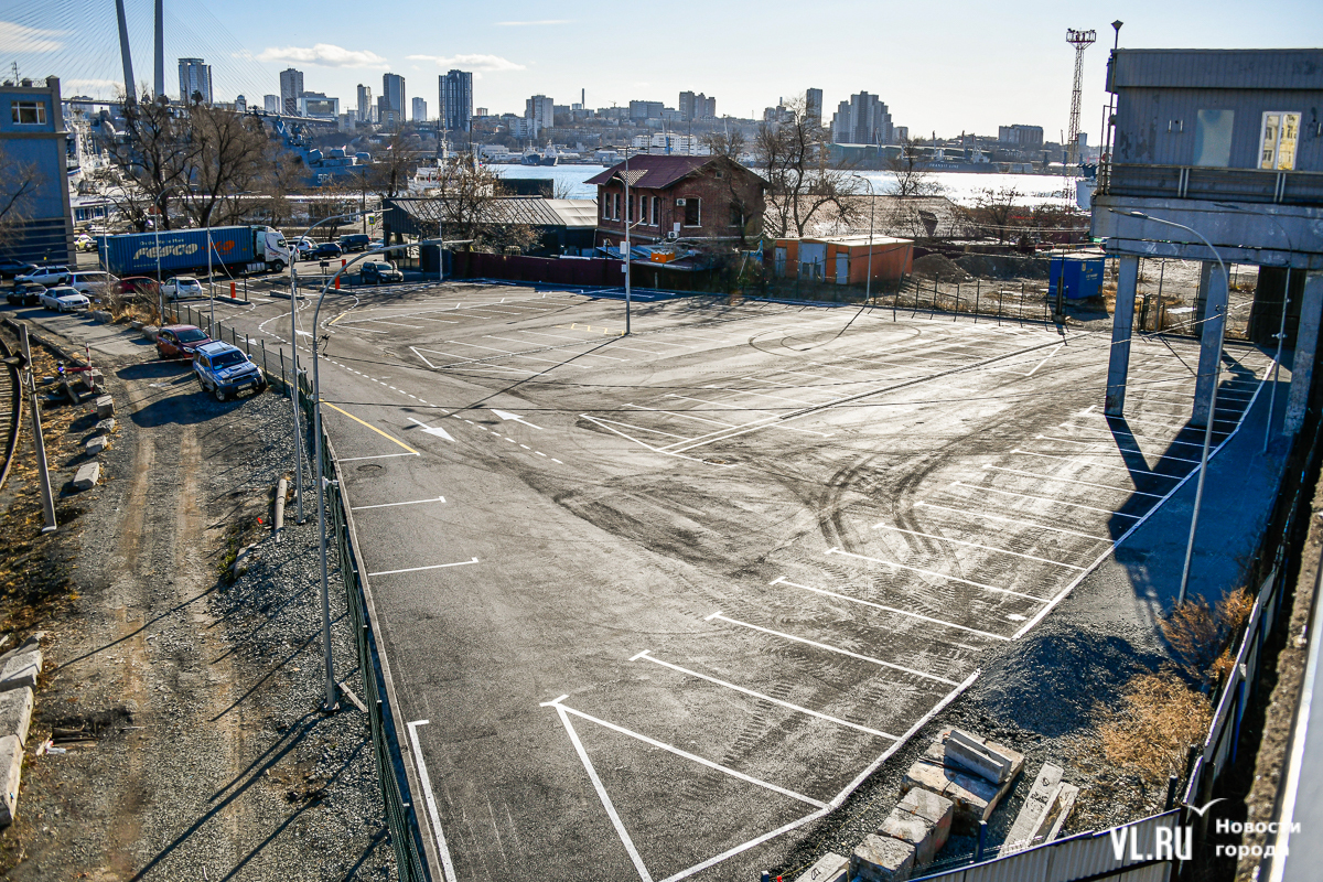 Визуально парковка на Корабельной Набережной, 1 выглядит практически готовой. Здесь подрядчик из Артёма, ООО «Фортэс», уложил асфальт, нанёс разметку, установил столбы освещение и шлагбаум. Осталось только смонтировать и подключить камеры. Доступ на неё сейчас закрыт, так что и бесплатно припарковаться пока не получится. Поэтому некоторые бросают машины за забором парковки, где, видимо, должен быть газон, а также между забором и железной дорогой.