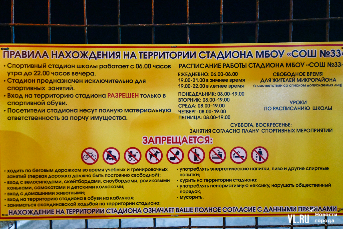 Вечером 4 декабря корреспондент Новостей VL.ru тоже попробовал попасть на стадион на Сахалинской, но обнаружил замок на входе. При этом на самом стадионе неизвестно для кого горел свет, но людей на нём не было. Охранника тоже нигде не было видно. Того самого объявления обнаружить не удалось, но на заборе висит график работы, согласно которому в вечернее время, с 19:00 до 21:00, – свободное время для жителей микрорайона в соответствии со списком допускаемых лиц. Корреспондент сверился с часами, подёргал запертую калитку и ушёл.
