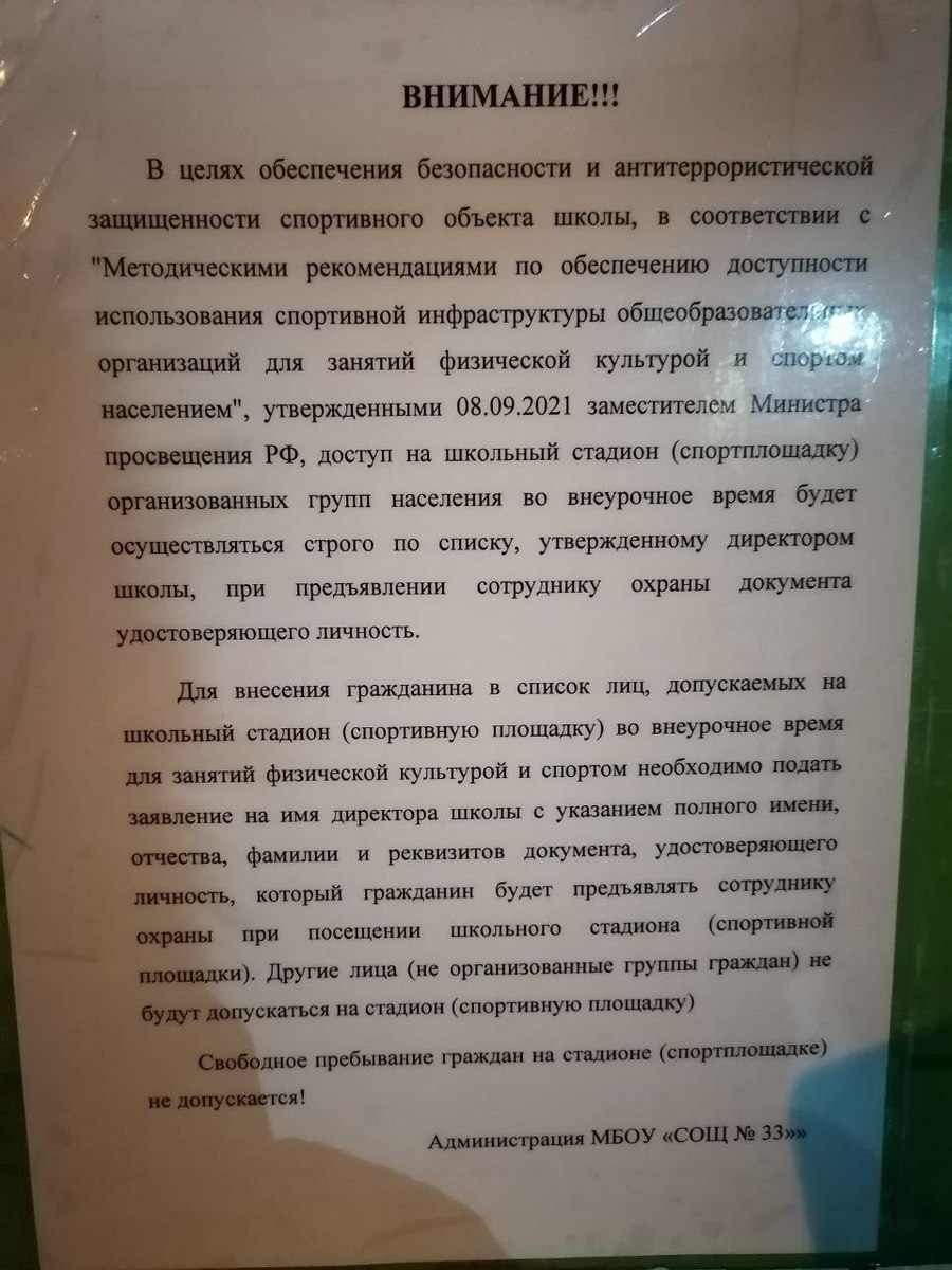 Как рассказали местные жители, администрация школы вывесила объявление, где сказано, что свободное пребывание граждан на стадионе не допускается. А всем тем, кто очень хочет заняться спортом во внеурочное время, предлагалось организоваться в группу, подать директору школы заявление с паспортными данными, а потом не забывать показывать паспорт охраннику на входе. Всё это объяснялось рекомендациями министра просвещения РФ и антитеррором.