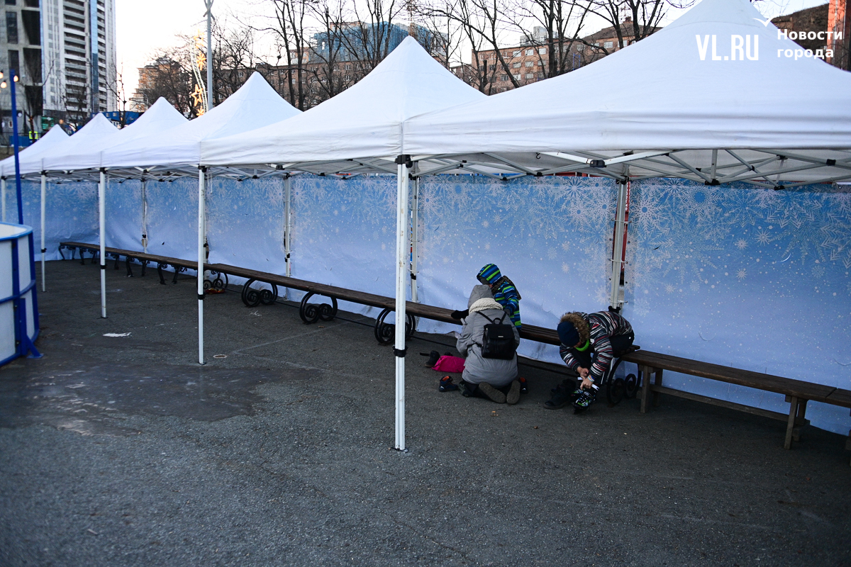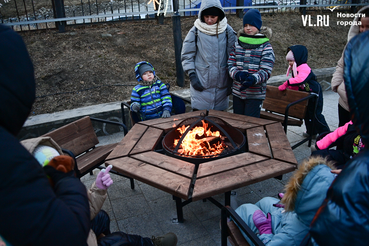 В остальные дни с 10:00 до 22:00 будут работать бесплатный каток и ледяная горка. Проката коньков и ледянок нет, поэтому нужно брать с собой. С 17:00 на протяжении минимум трёх недель будут разжигать два очага, которые расположились в круглых столах с местом для костра посередине. А с наступлением темноты будет включаться иллюминация.