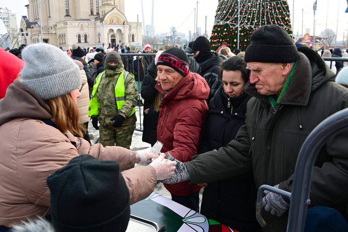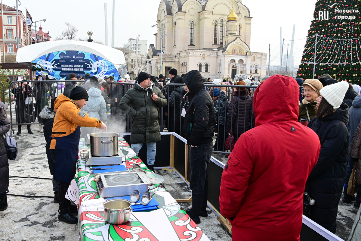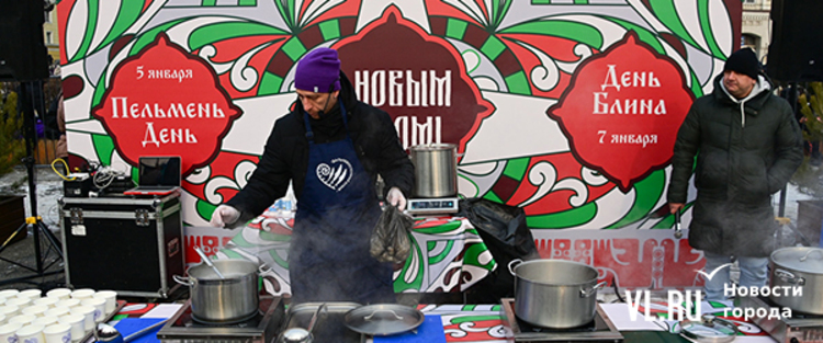На центральной площади Владивостока состоялся пельменный праздник. Восемь ресторанов города по очереди готовили и бесплатно угощали гостей пельменями. Чтобы попробовать привычное для праздников блюдо с необычными начинками и соусами, гостям пришлось постоять на морозе.