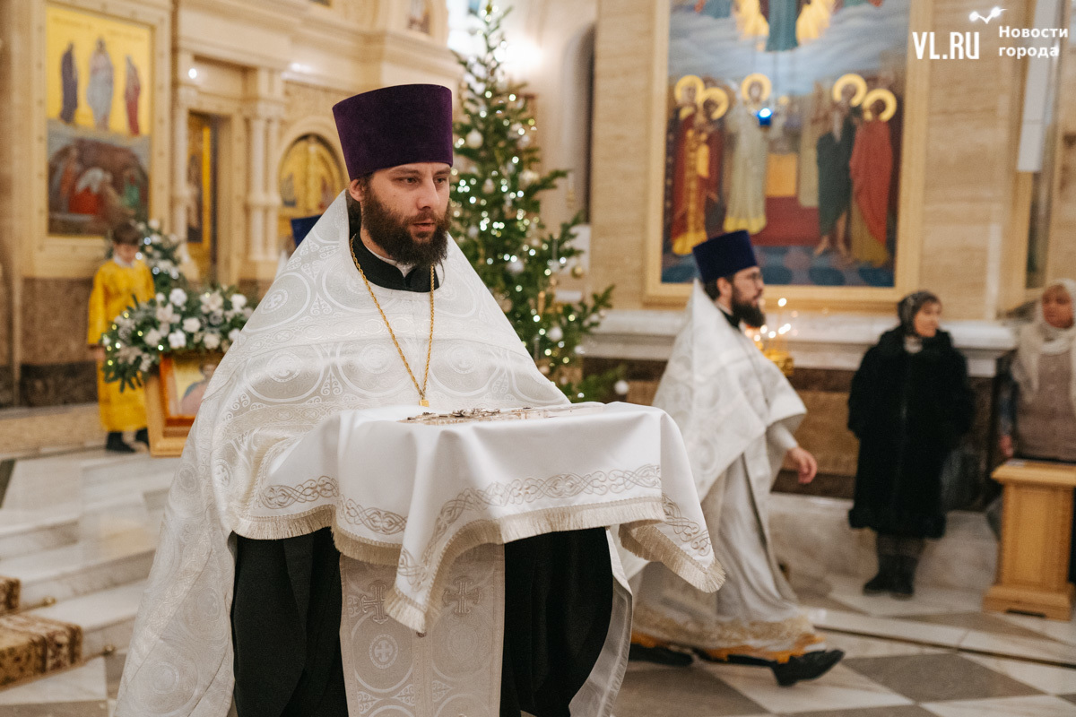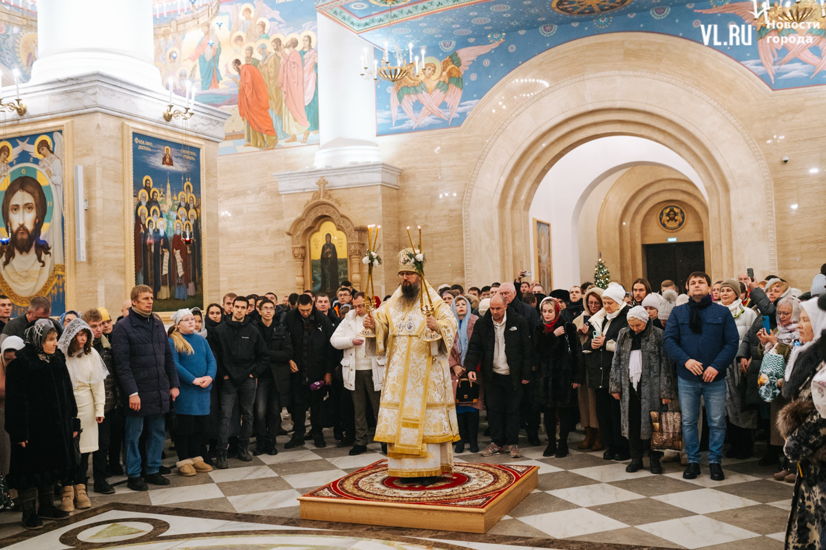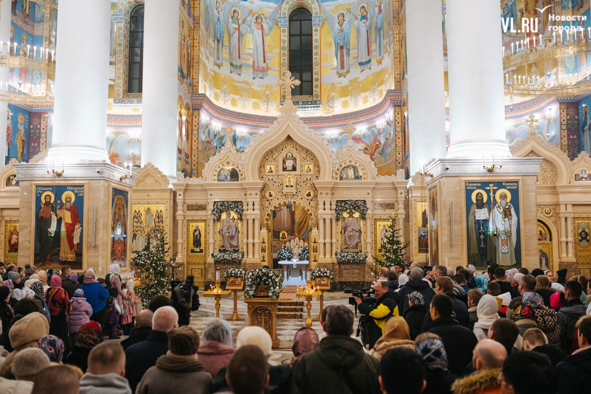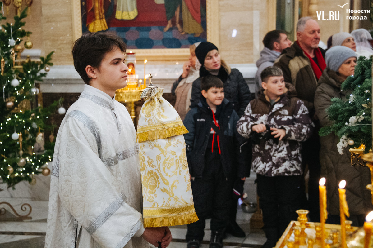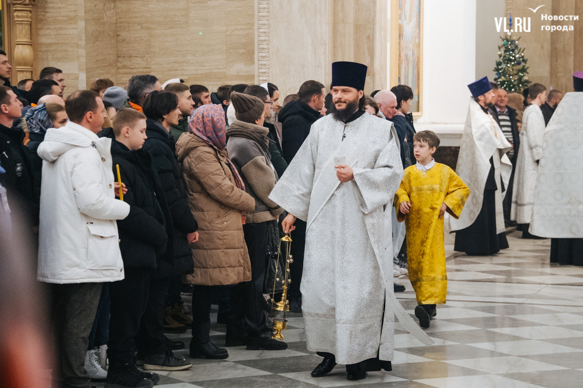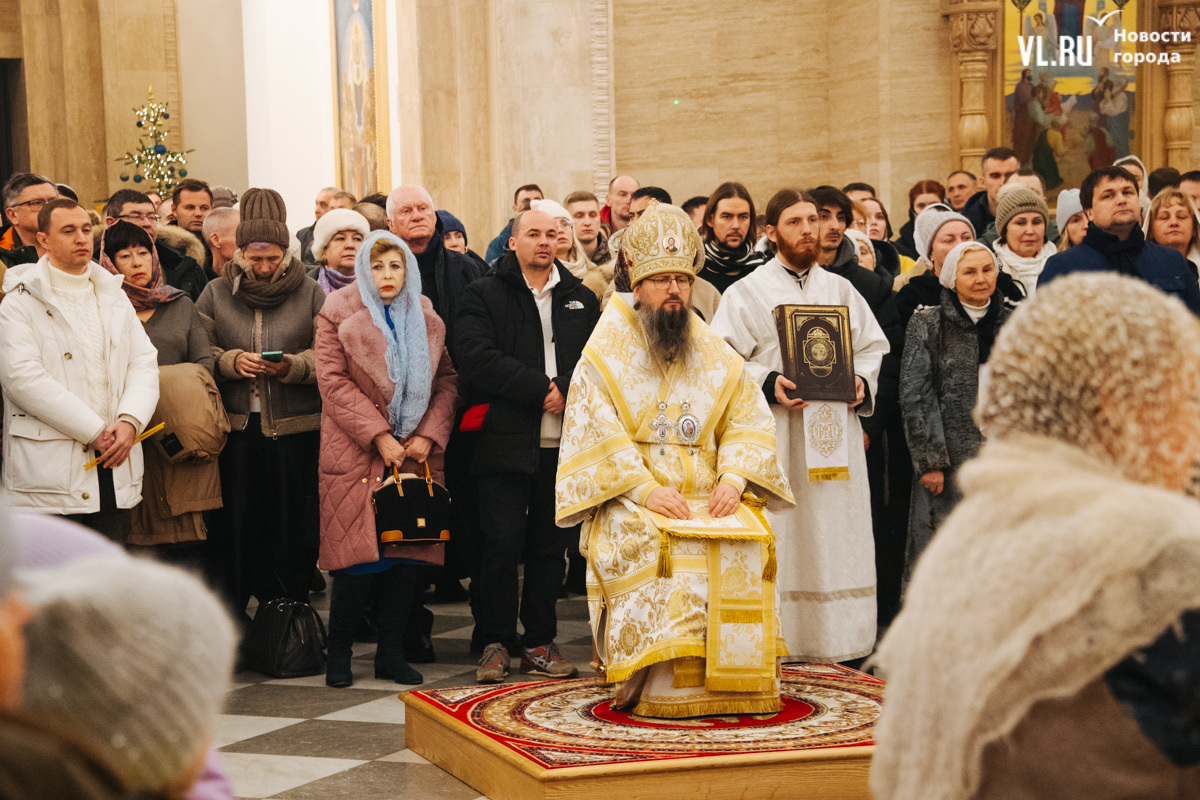 Божественная литургия прошла в ночь с 6 на 7 января в Спасо-Преображенском кафедральном соборе. Проводил её митрополит Павел, который стал главой Владивостокской епархии в октябре 2024 года. Приходили в Собор в основном взрослые люди, но были и те, кто привёл с собой детей. Рождество отмечали в храме среди наряженных новогодних ёлок и прочей атрибутики, которой, впрочем, было не очень много.