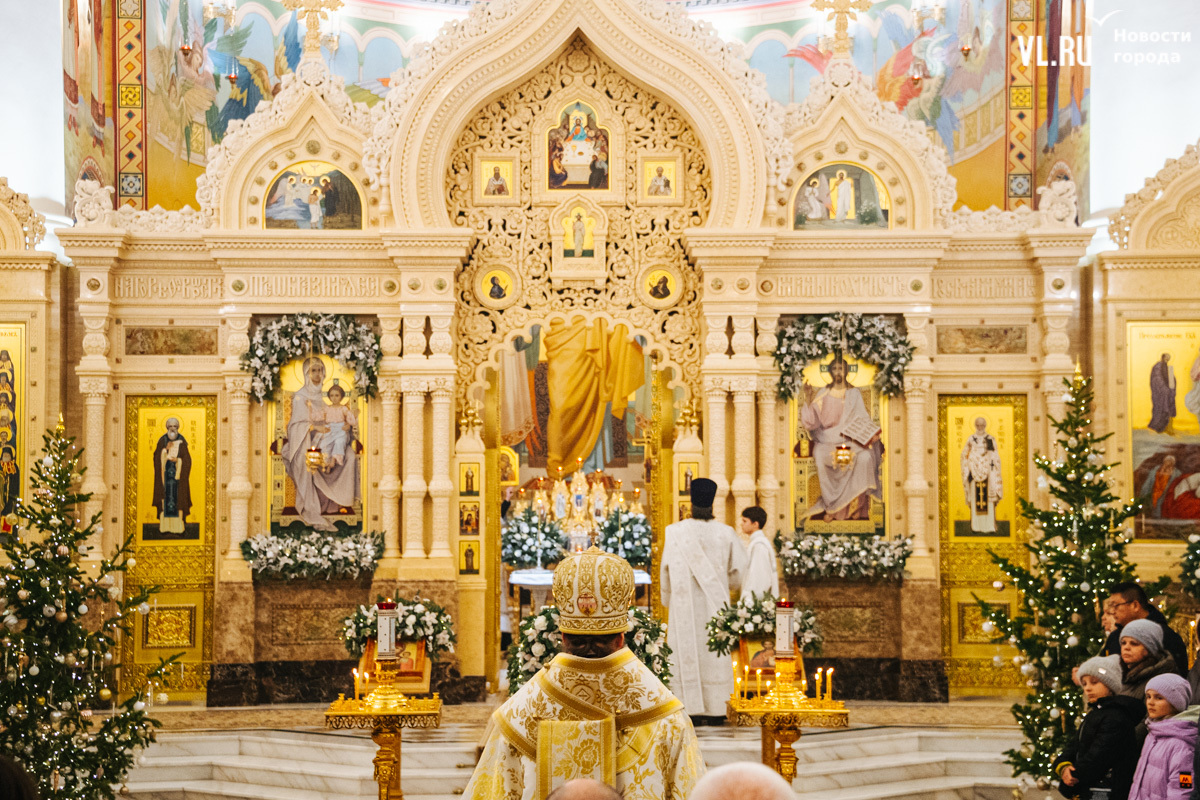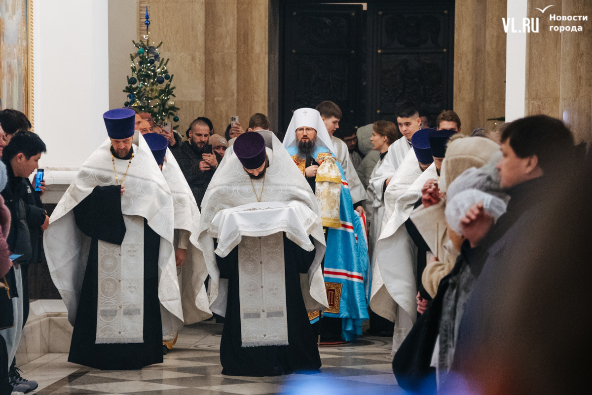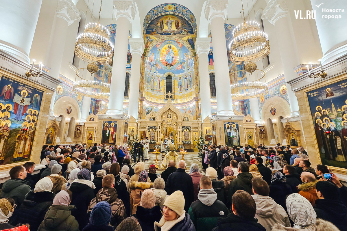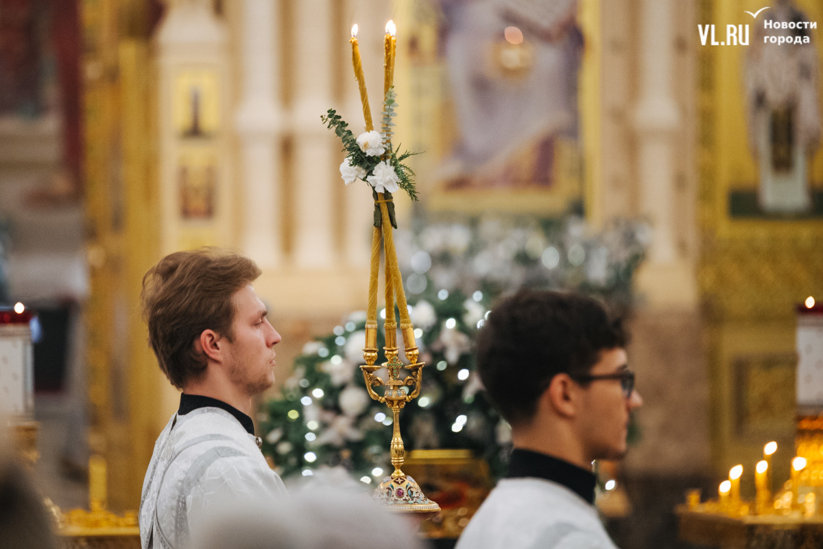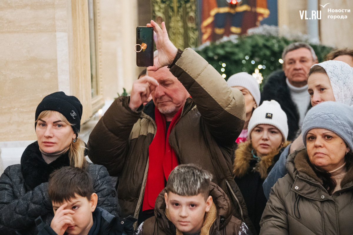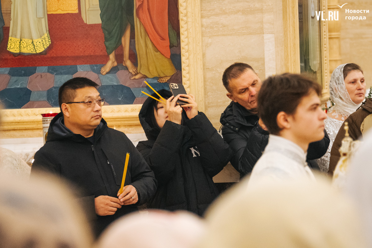 Божественная литургия прошла в ночь с 6 на 7 января в Спасо-Преображенском кафедральном соборе. Проводил её митрополит Павел, который стал главой Владивостокской епархии в октябре 2024 года. Приходили в Собор в основном взрослые люди, но были и те, кто привёл с собой детей. Рождество отмечали в храме среди наряженных новогодних ёлок и прочей атрибутики, которой, впрочем, было не очень много.