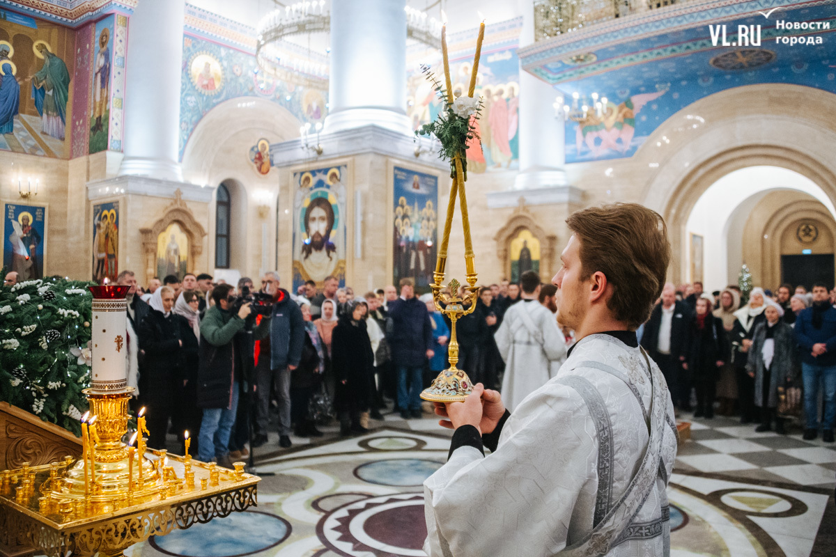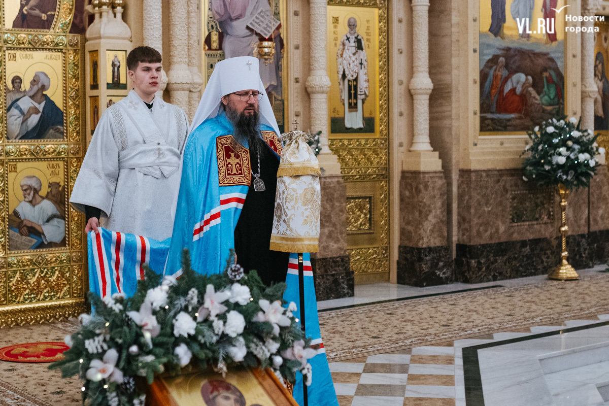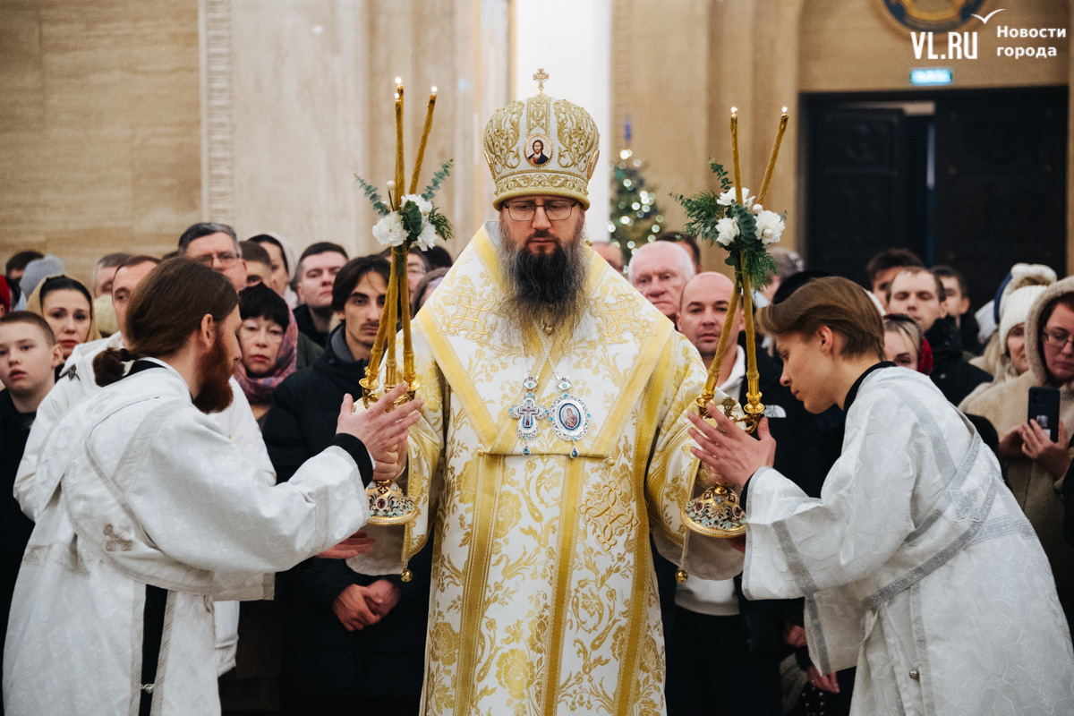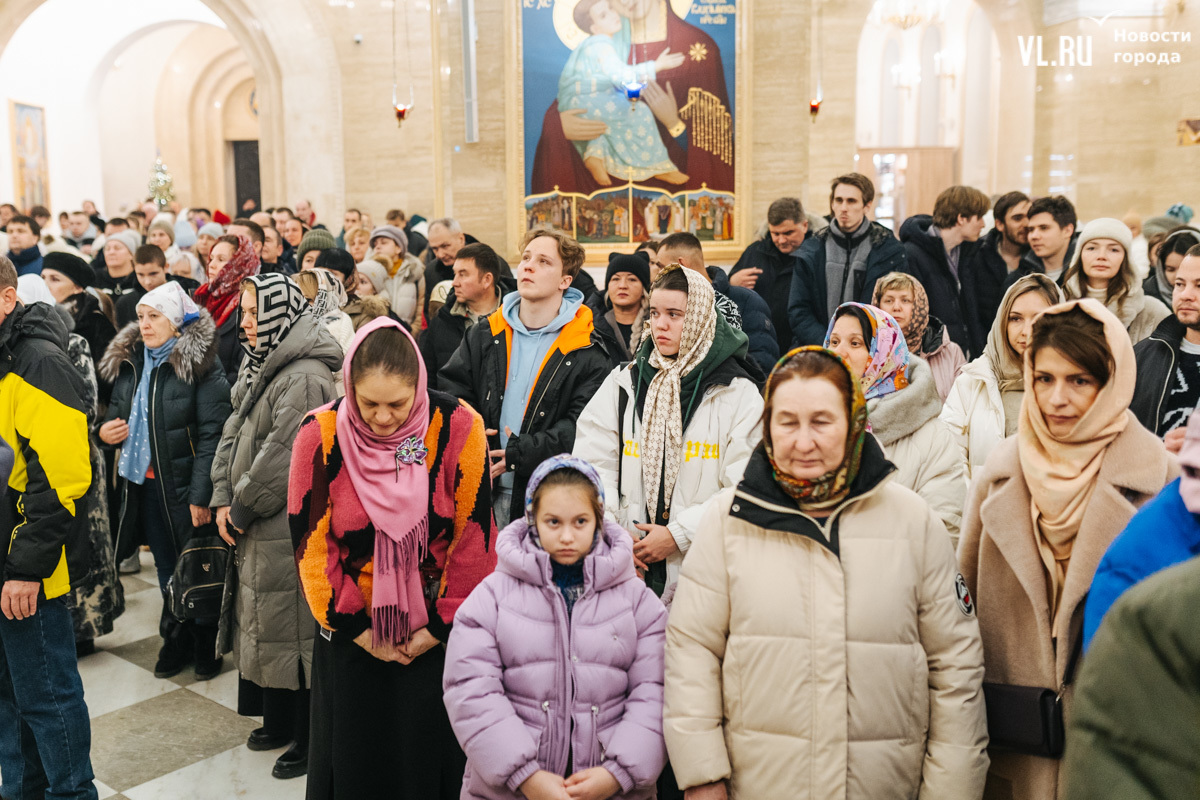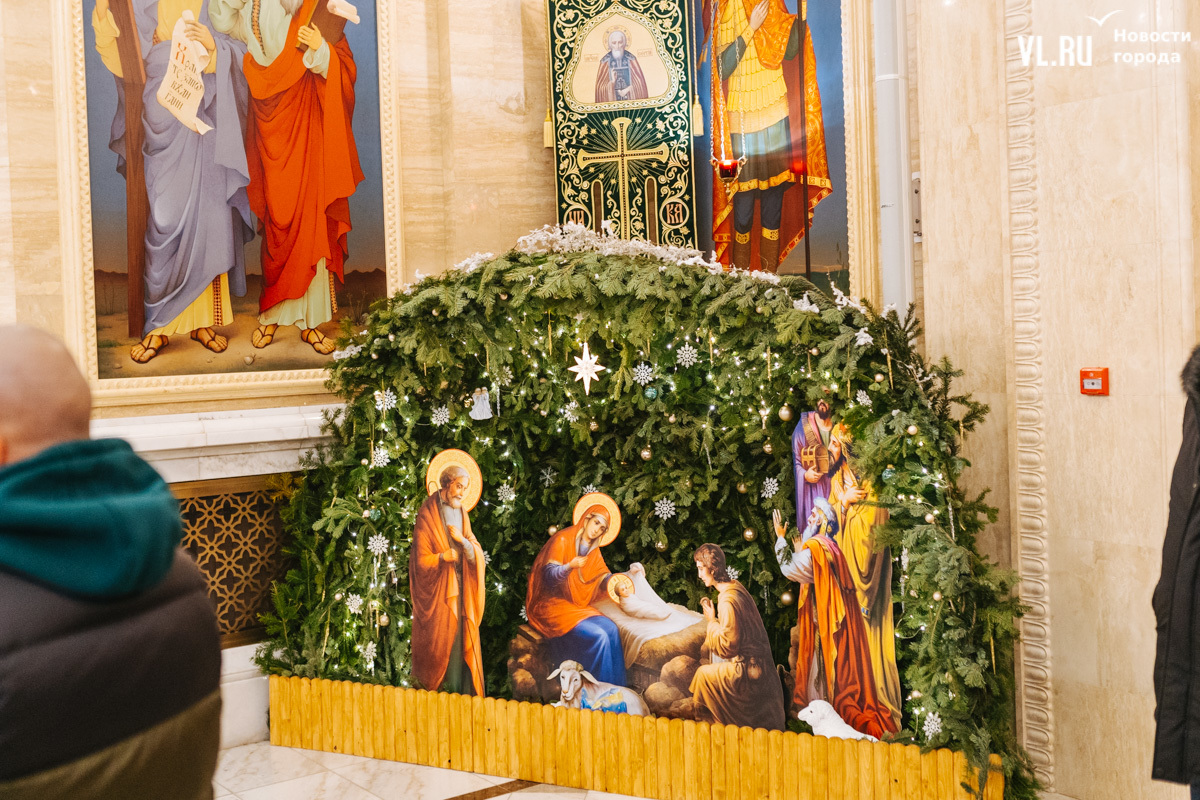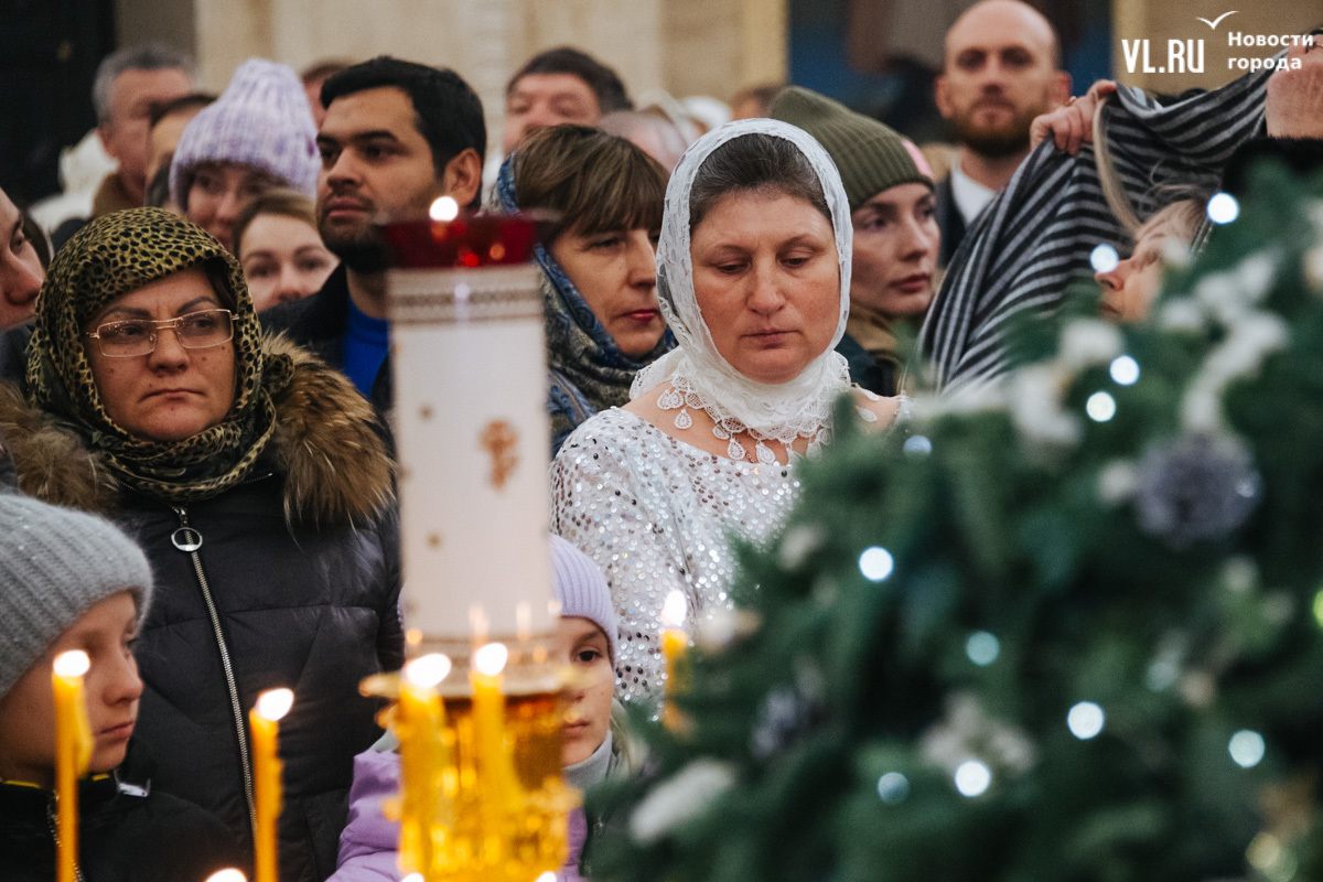 Божественная литургия прошла в ночь с 6 на 7 января в Спасо-Преображенском кафедральном соборе. Проводил её митрополит Павел, который стал главой Владивостокской епархии в октябре 2024 года. Приходили в Собор в основном взрослые люди, но были и те, кто привёл с собой детей. Рождество отмечали в храме среди наряженных новогодних ёлок и прочей атрибутики, которой, впрочем, было не очень много.