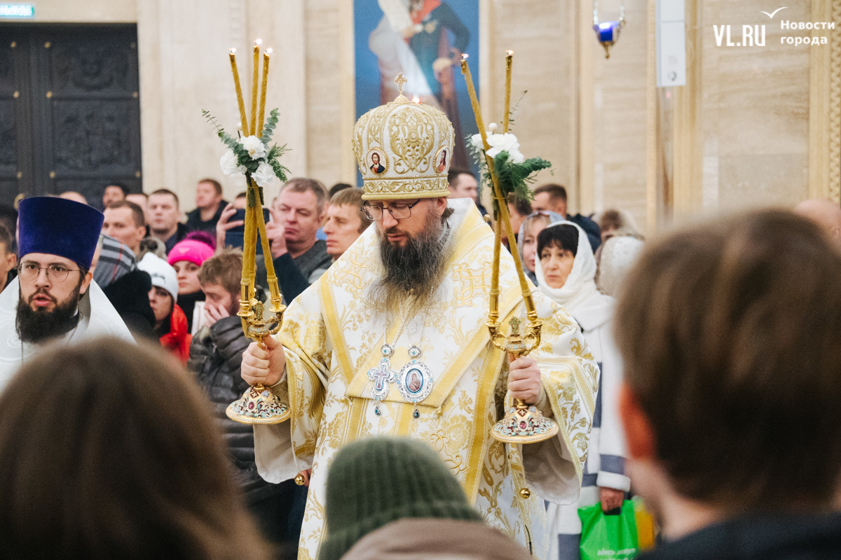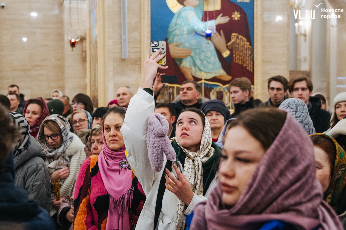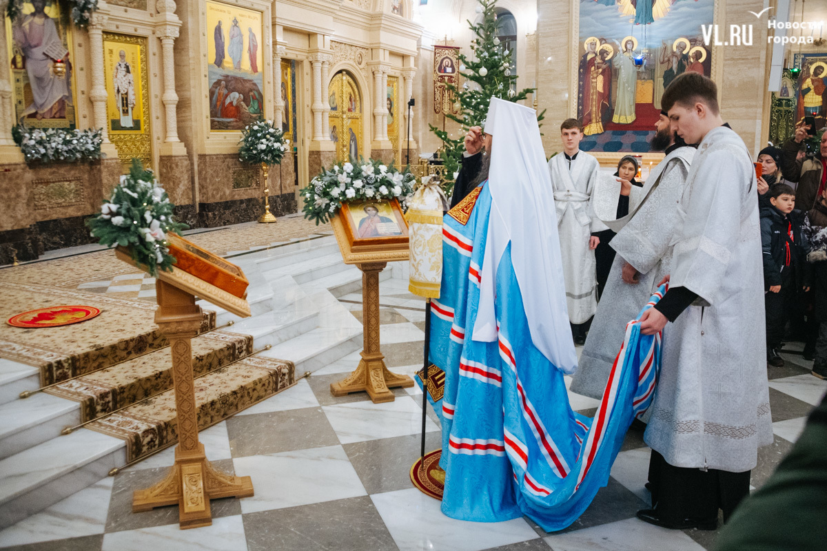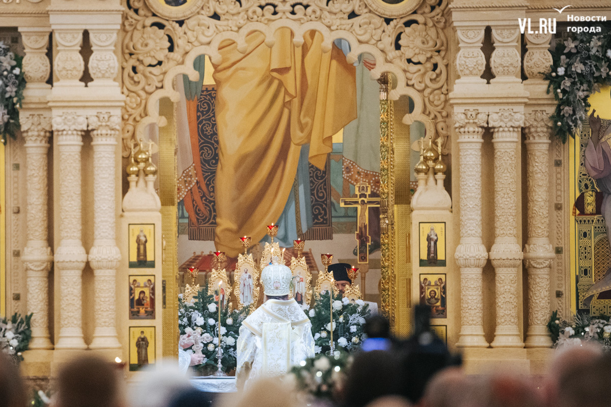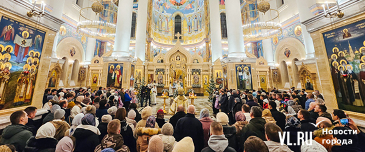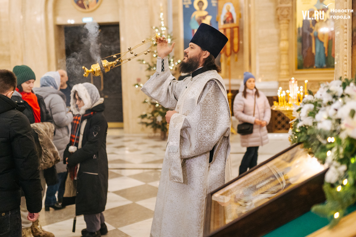 Божественная литургия прошла в ночь с 6 на 7 января в Спасо-Преображенском кафедральном соборе. Проводил её митрополит Павел, который стал главой Владивостокской епархии в октябре 2024 года. Приходили в Собор в основном взрослые люди, но были и те, кто привёл с собой детей. Рождество отмечали в храме среди наряженных новогодних ёлок и прочей атрибутики, которой, впрочем, было не очень много.