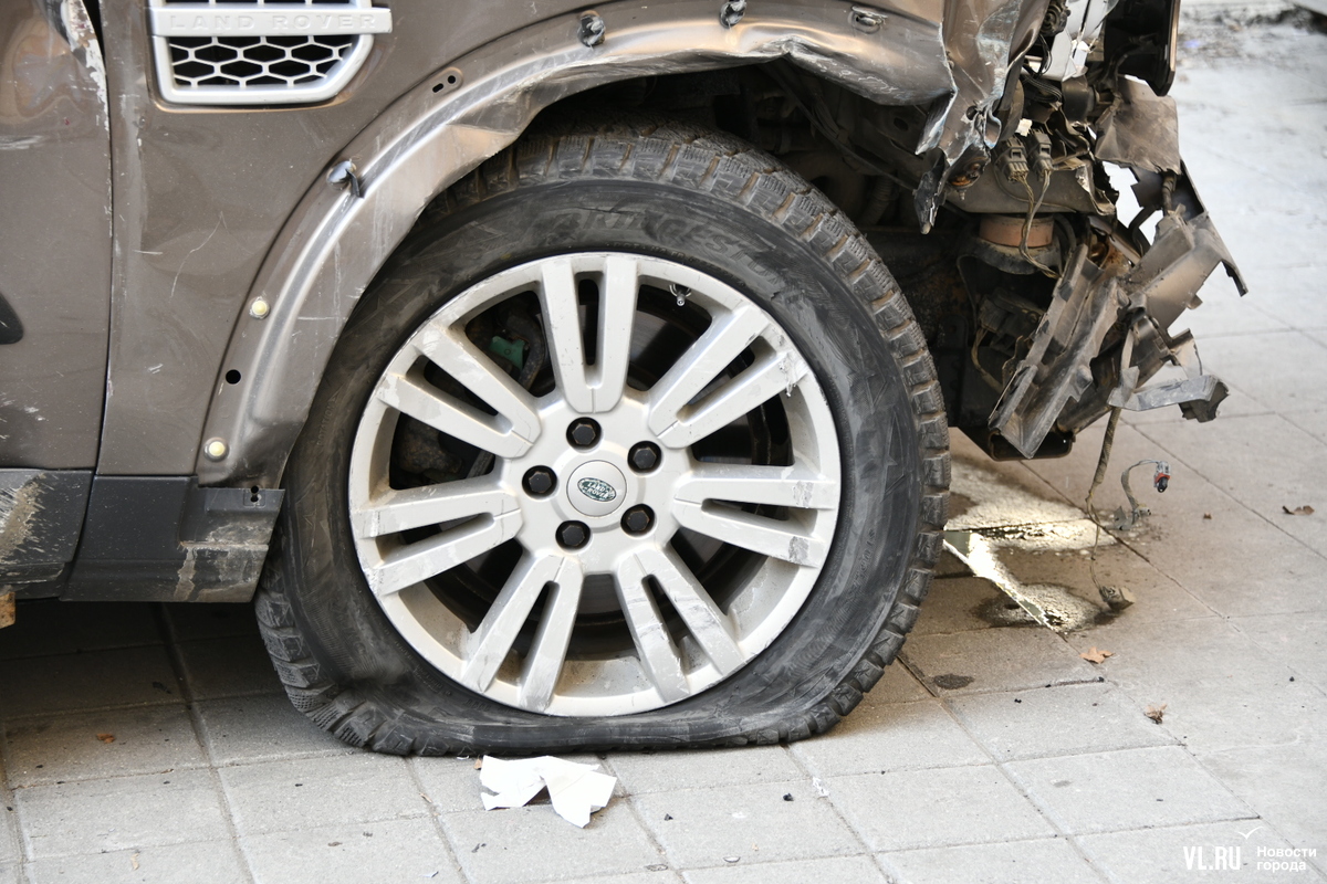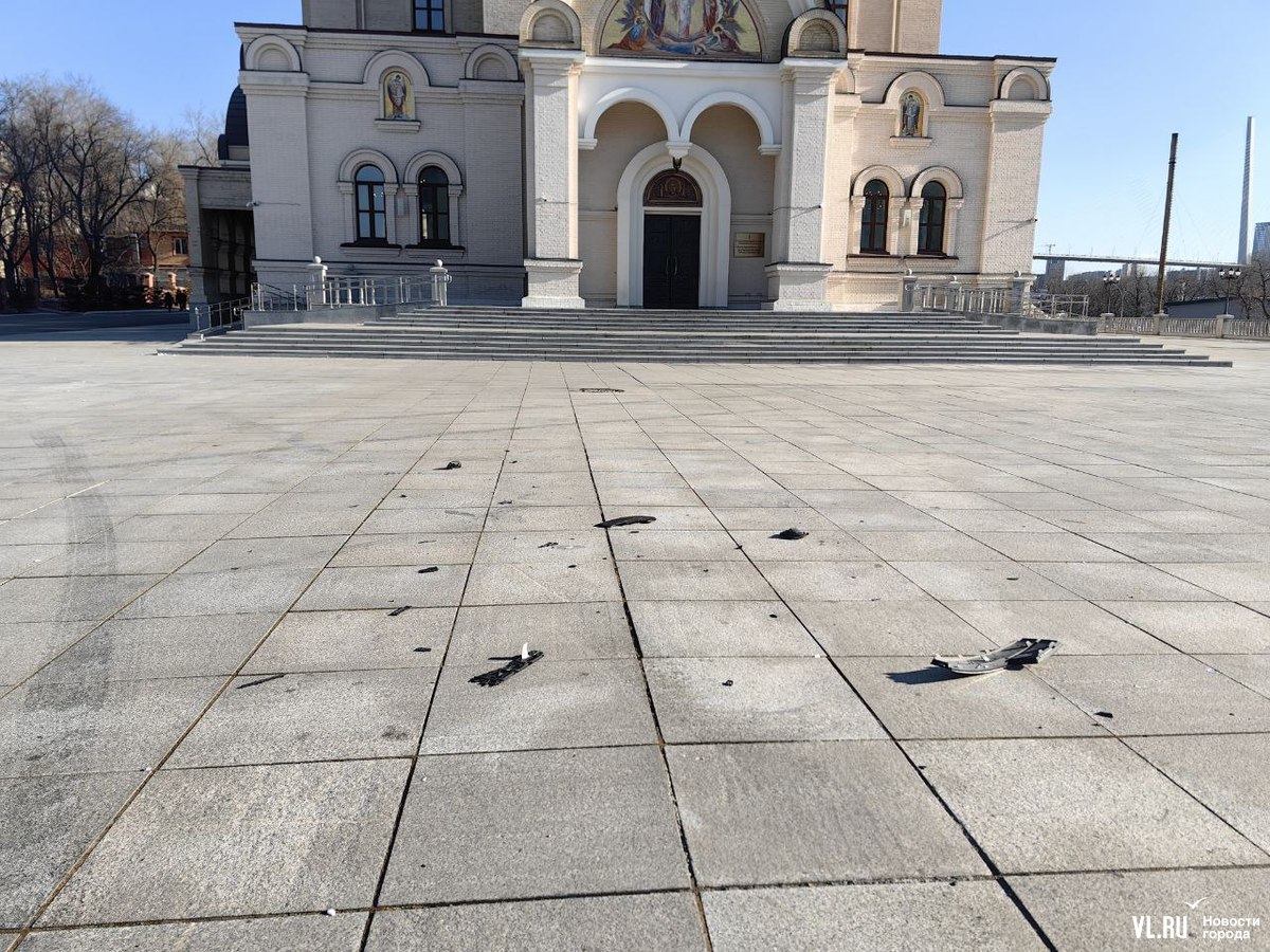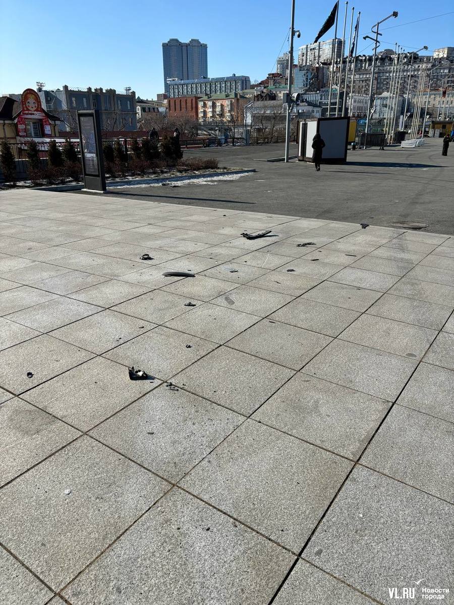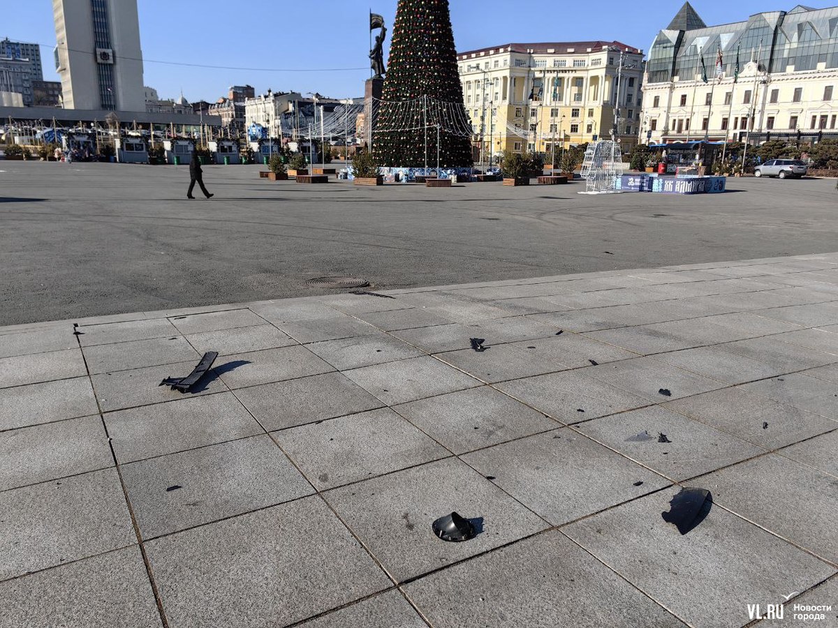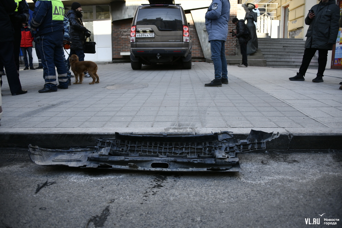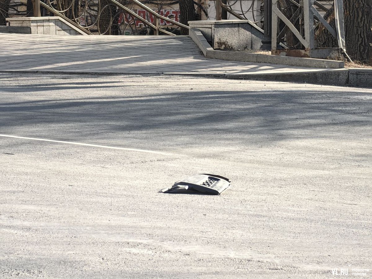 А на всём участке Светланской от площади до почтамта можно увидеть обломки внедорожника.