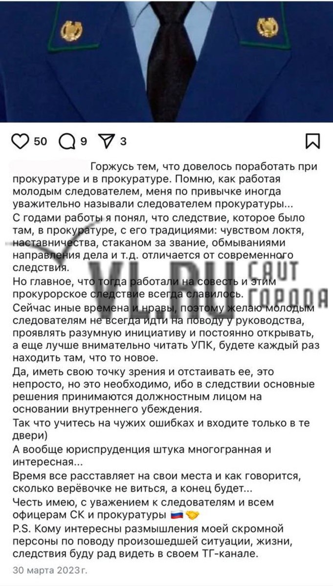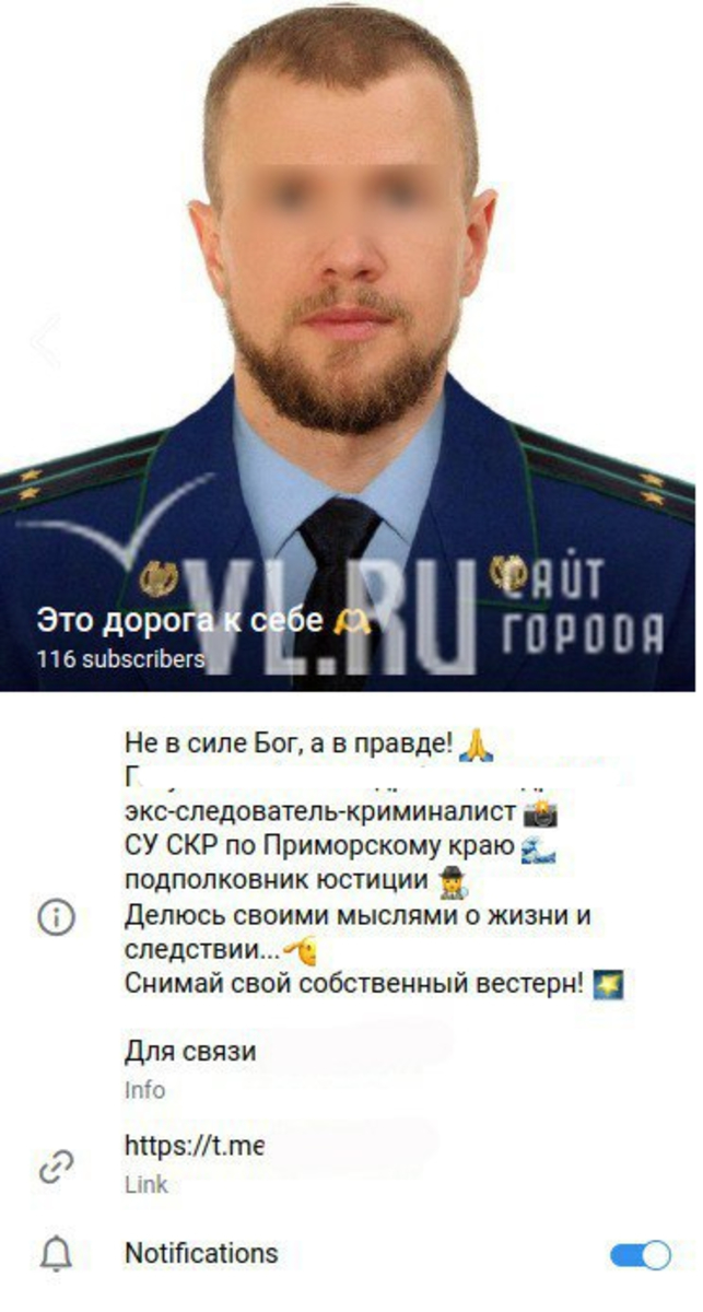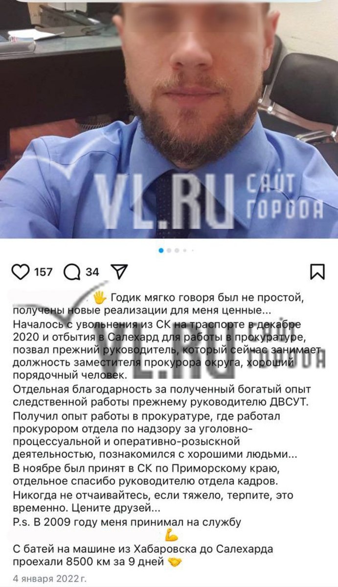 Мужчина, вероятно, ранее служил в СУ СК по Приморскому краю в звании подполковника юстиции. Освобождён от должности и уволен в январе 2022 года по результатам служебной проверки, которая показала, что сотрудник публиковал неподобающие посты в своих социальных сетях. Однако в 2023 году Хабаровский краевой суд признал увольнение незаконным.