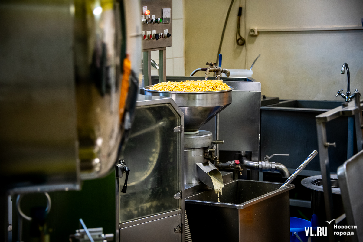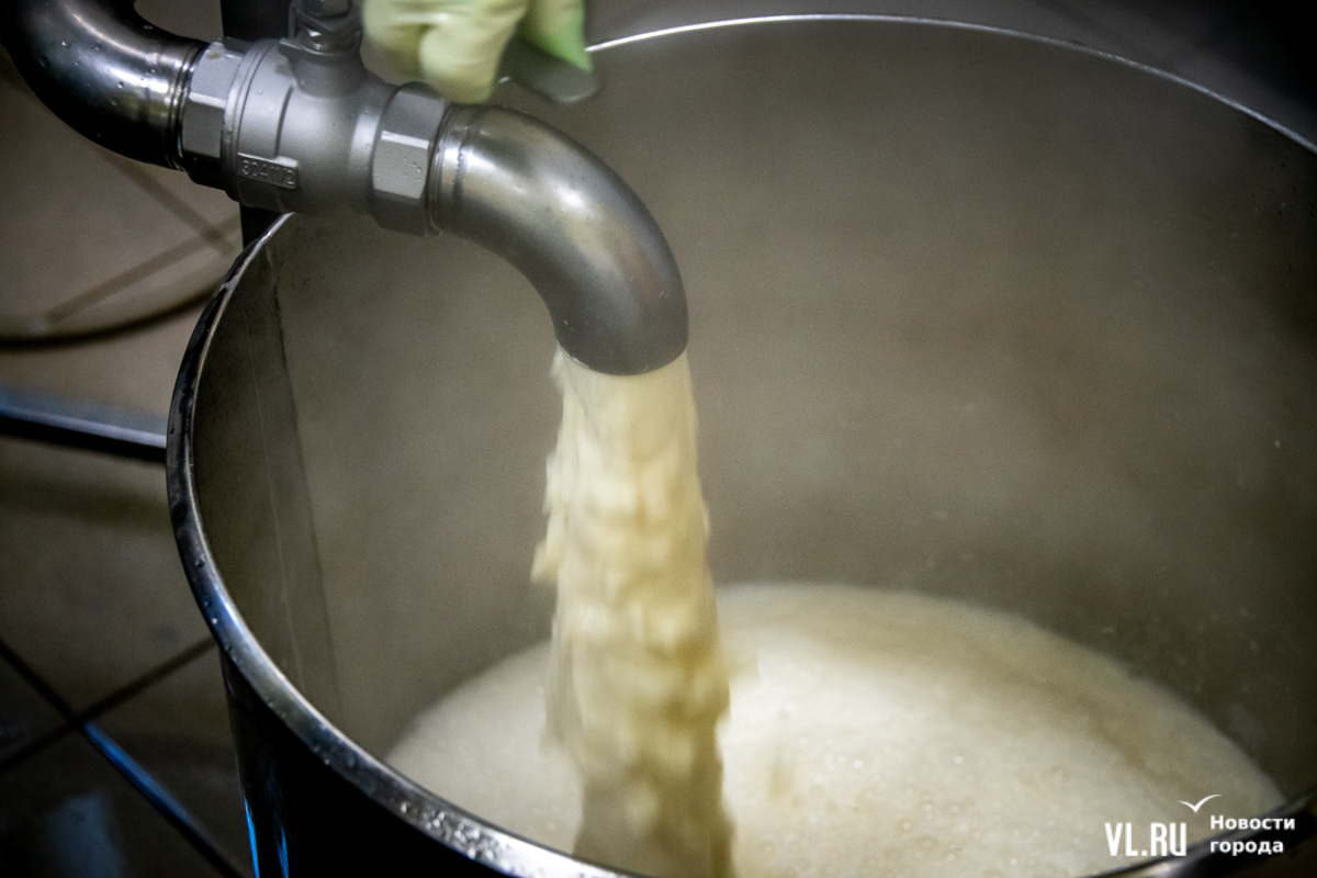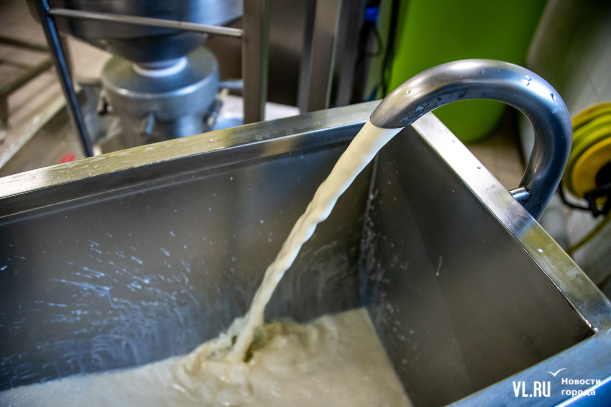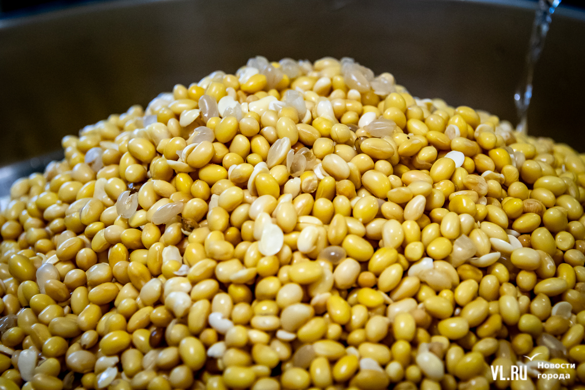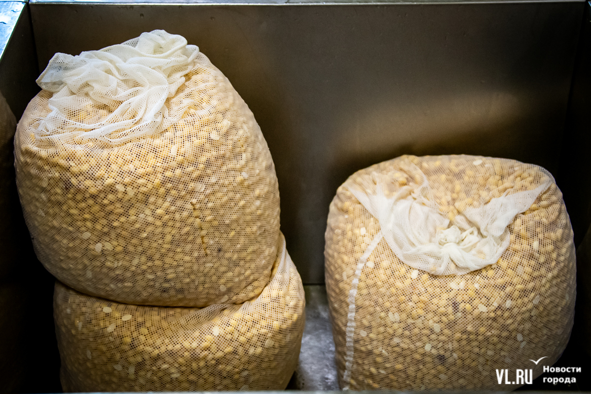 Сою хранят здесь же, на складе, где очень холодно. Перед процессом её на несколько часов замачивают и промывают. Вода должна быть очень чистой, и её прогоняют через фильтры. Потом – перемолка, и соя становится похожа на манную кашу с комочками. Технолог Денис Васильевич говорит, что горячее соевое молоко тоже пахнет манной кашей. Он ведёт почти весь процесс в одиночку.