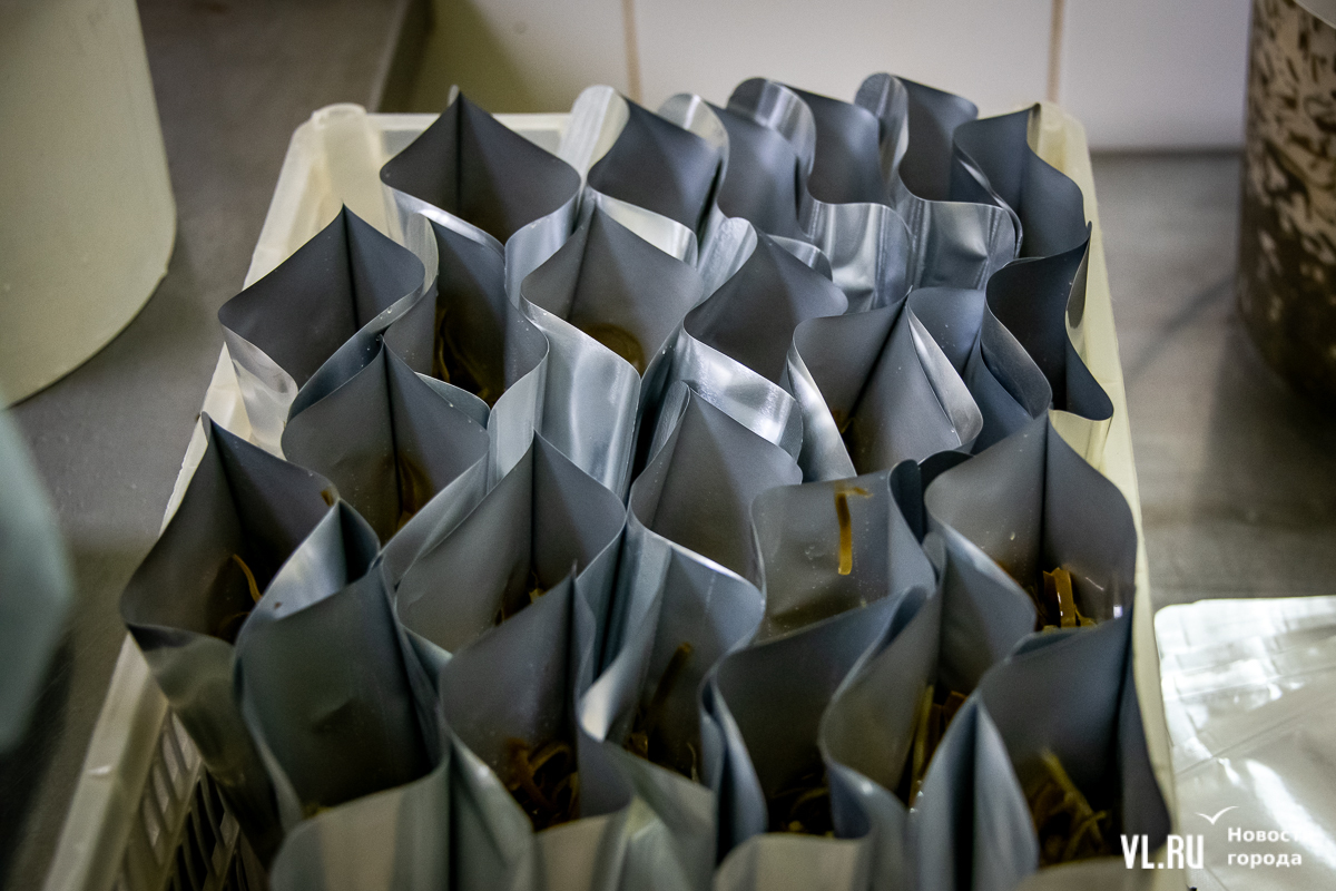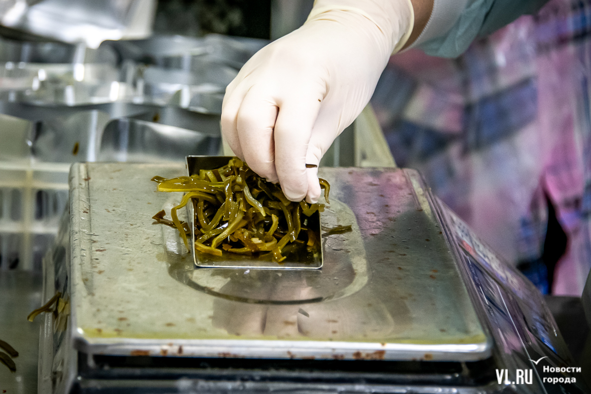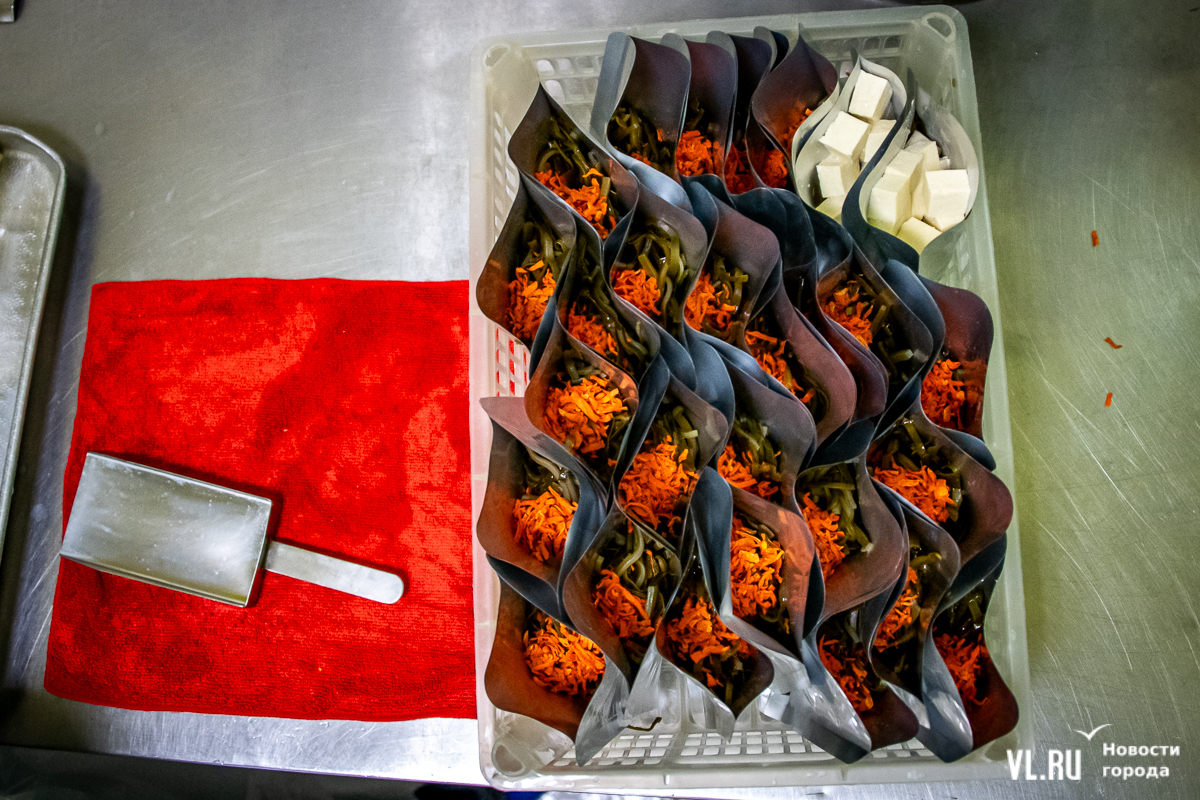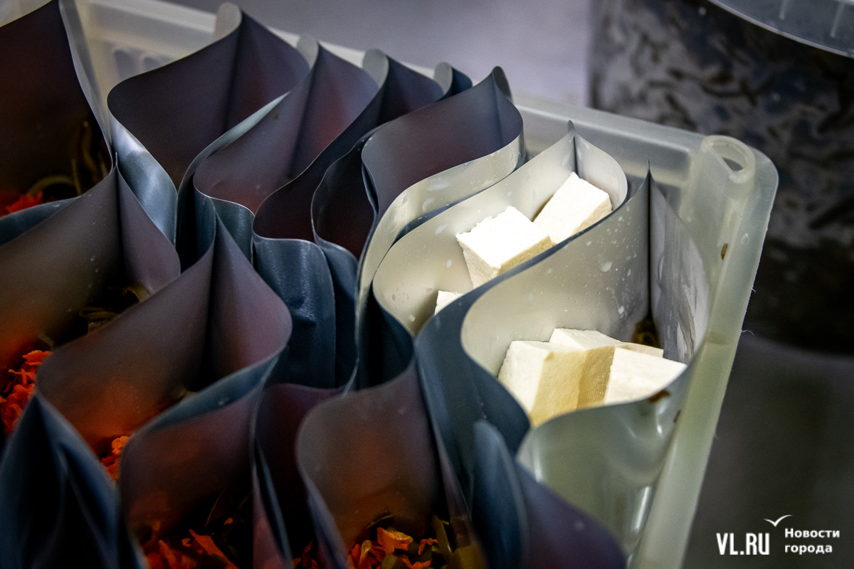 Рядом фасуют морскую капусту с тофу. В этой рецептуре ещё соус и морковь. Всё раскладывают в реторт-пакеты для автоклава. В таком виде, ещё и с наклейками, тофу уходит в магазины. Буквально через месяц наклейки изменятся: будет новый дизайн.