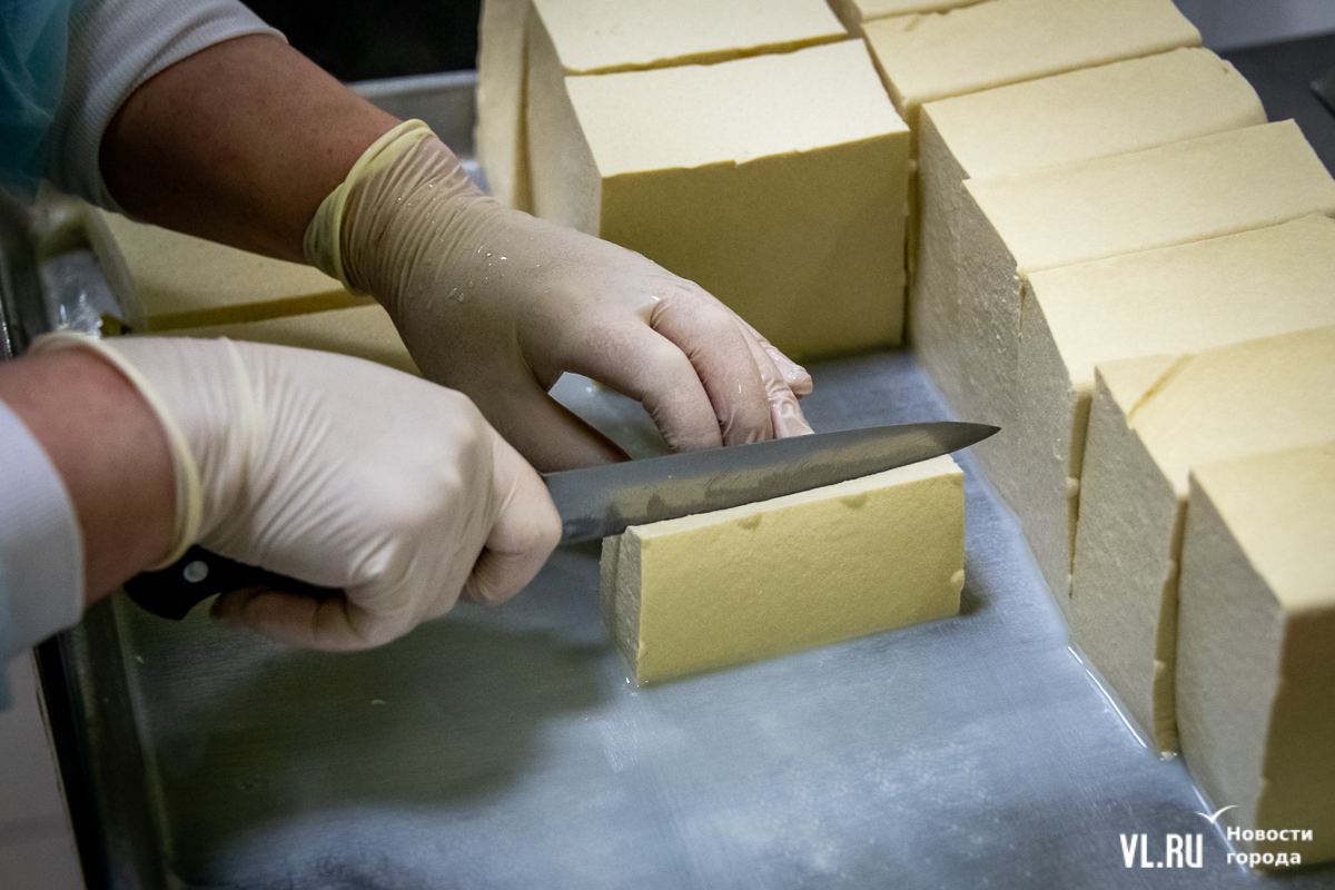 Затем – ещё несколько манипуляций, в частности, отжим белковой массы под прессом. От него на тофу остаются отметины: это ориентир для нарезки, как и специальная линейка. Получаются одинаковые куски нужного размера – линейка его регулирует.