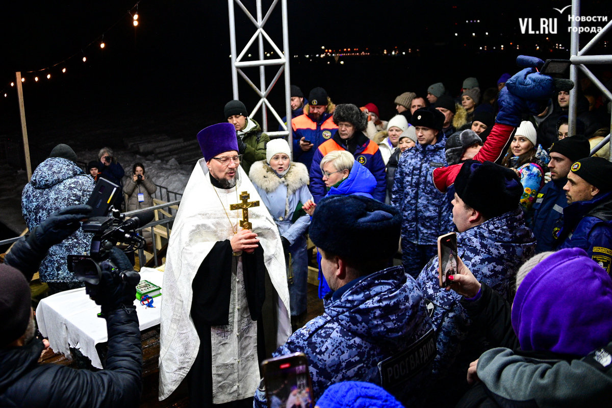 Пускать в прорубь людей начали около 22:30, когда её освятил батюшка и дал благословение.