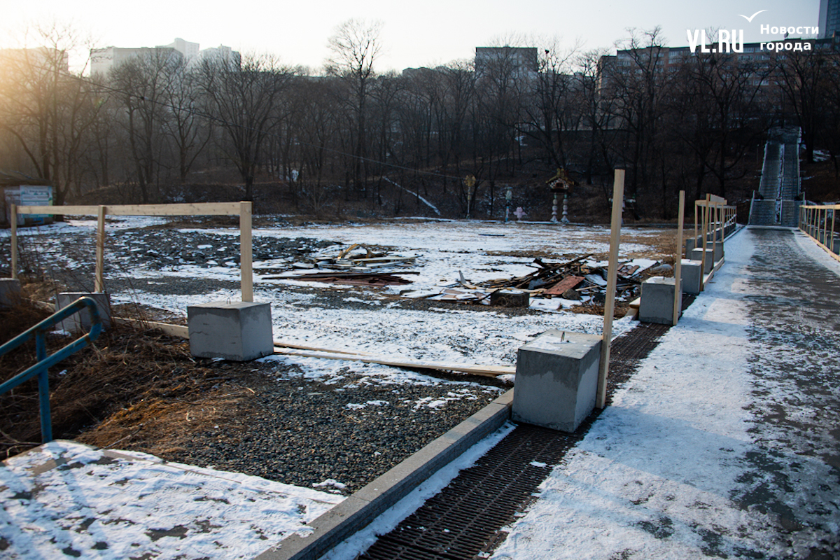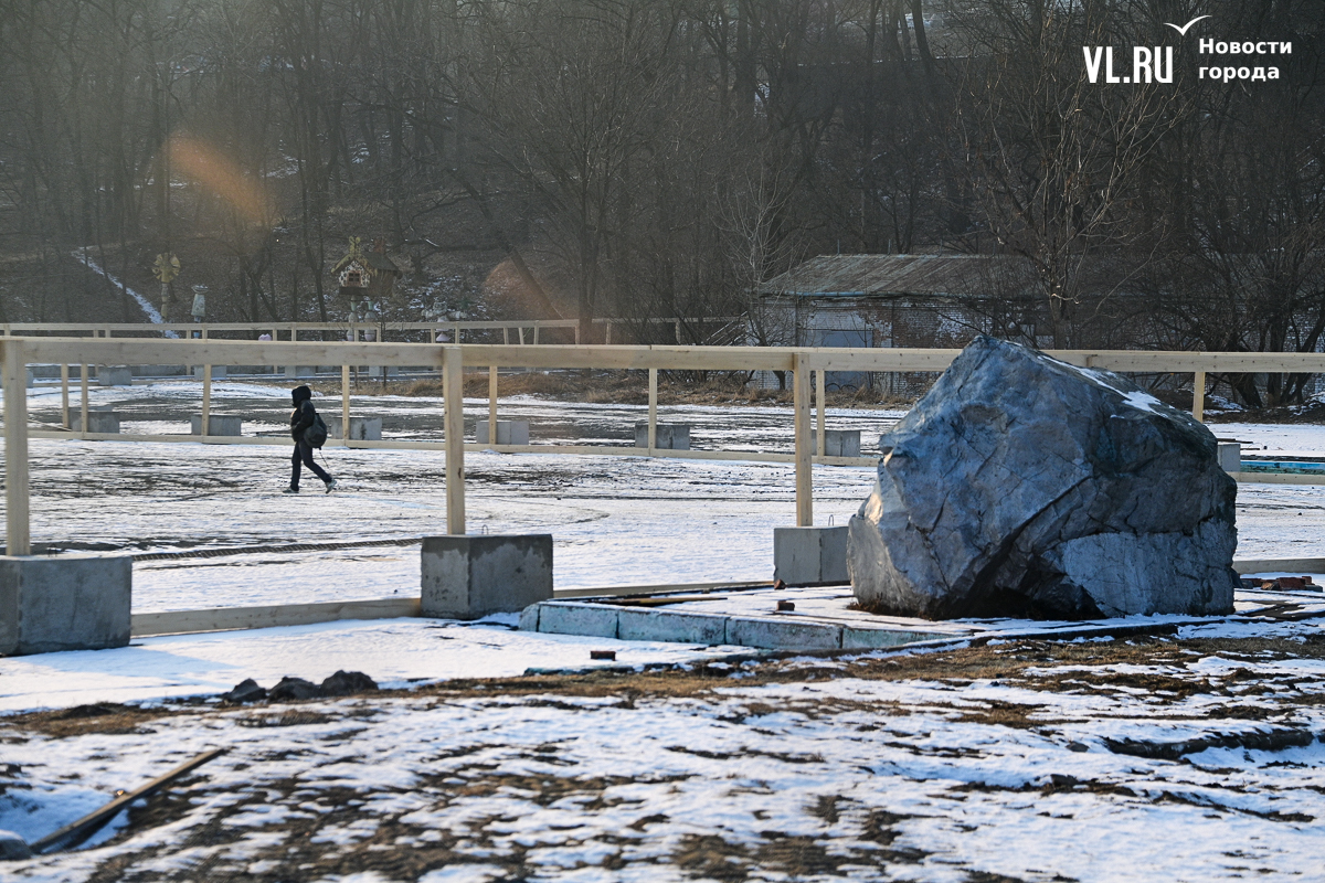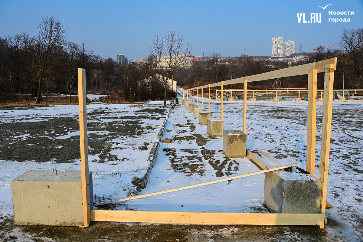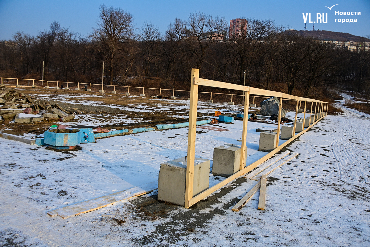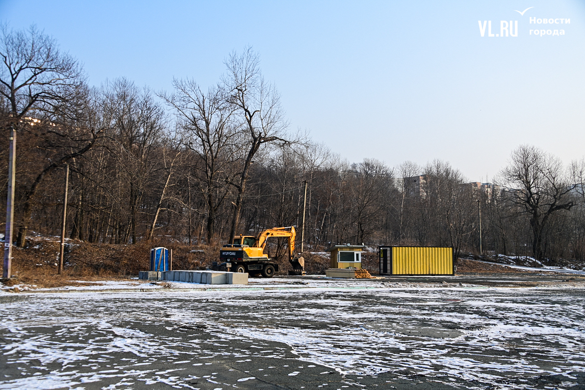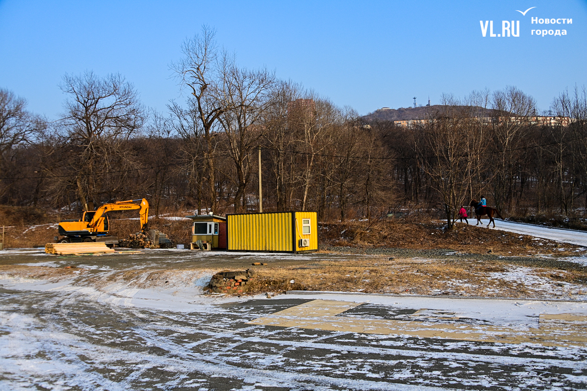 Активные работы ведутся с начала недели. Днём в четверг корреспондент Новостей VL.ru застал рабочих, которые ограждали участок около бывшего парка детских аттракционов «Добрые сердца», забор возводят и ближе к озёрам. Судя по всему, сквозной проход через парк к лестнице, ведущей к остановке «Поликлиника», закрывать не будут. Рядом с местом, где была сцена, установлены несколько бытовок, туалет и стоит экскаватор. Паспорта объекта пока нет.