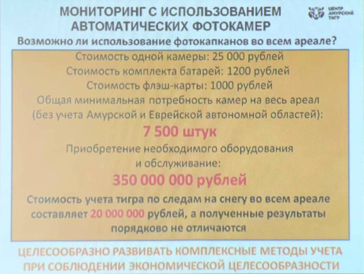 Сергей Арамилев, директор Центра «Амурский тигр», объяснил, что процесс пересчёта тигров очень трудоёмкий и финансово затратный – прошлый следовой учёт обошёлся в 20 млн. При этом если считать по следам, то будет большая погрешность, а для учёта по фотоловушкам необходимо закупить дорогое оборудование, и огромную статью расходов займёт обслуживание камер.