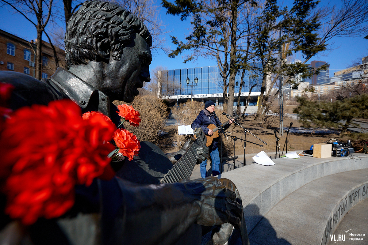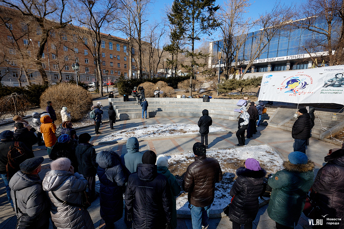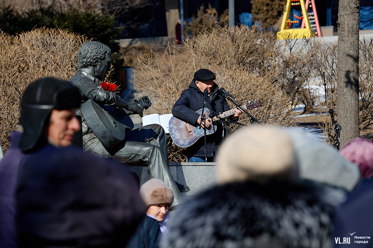Больше 50 человек собрались в субботу, 25 января, в Театральном сквере во Владивостоке на традиционный концерт, посвящённый Владимиру Высоцкому. Сегодня музыканту, поэту и актёру могло бы исполниться 87 лет. Поклонники его творчества в память о нём читали стихотворения и пели песни под гитару.