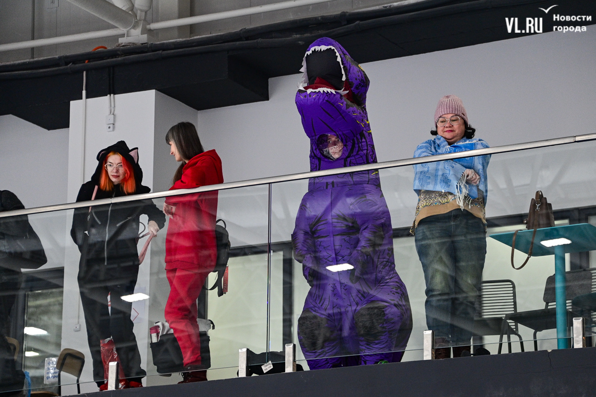Помимо начинающих кёрлингистов, на соревнования пришли и болельщики. Так, команду IThub college с трибун поддерживал динозавр, но прорычать комментарий корреспонденту Новостей VL.ru он постеснялся. Кто-то из студентов вузов и колледжей махал разрисованными плакатами, на которых в трёх словах могло быть написано признание любви к однокурсниками. А некоторые даже придумывали авторские кричалки.