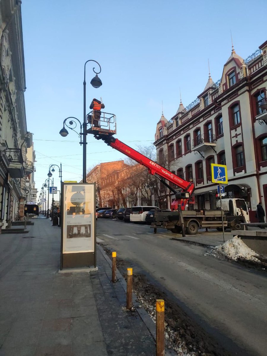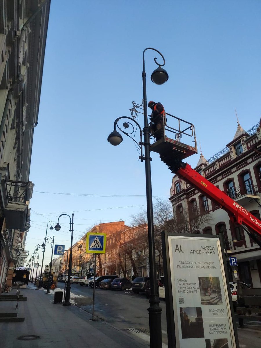 Сегодня специалисты Владсвета начали демонтировать новогоднюю иллюминацию на улицах Пограничной и Набережной. Светящиеся новогодние конструкции снимают с опор освещения. После демонтажа их отправят на склад. Специалисты осмотрят все конструкции, при необходимости проведут ремонт.