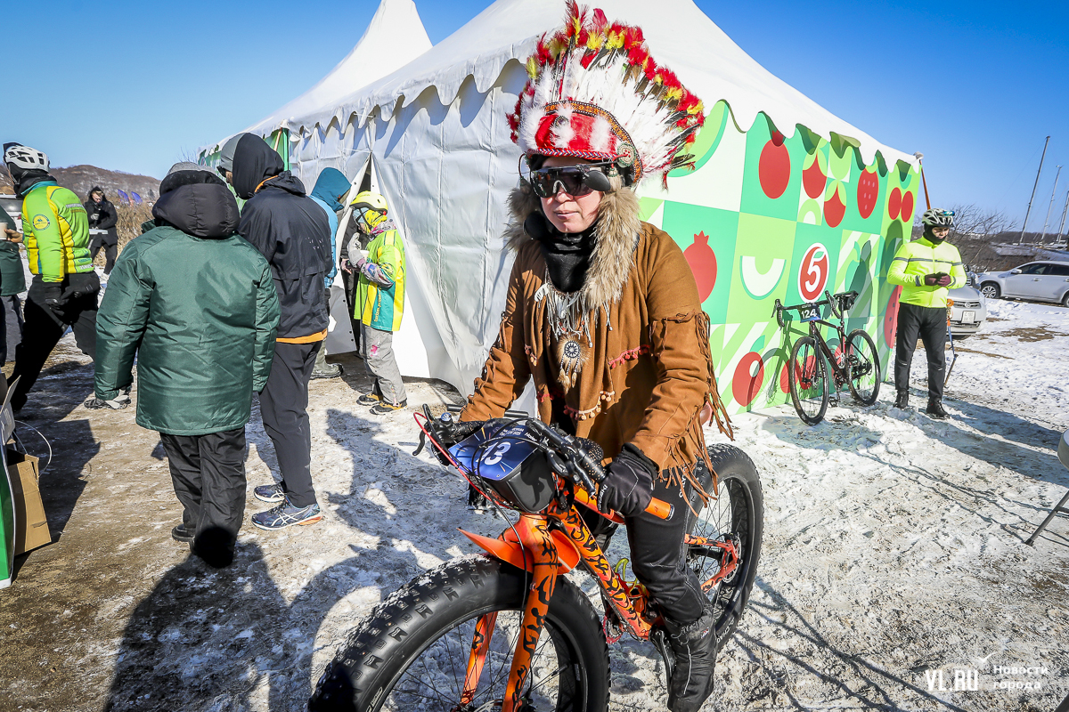 Ещё одна участница из Хабаровска, Надежда, каждый год гоняет на «Тур острова Папенберг» в каком-нибудь костюме. В этом году выбрала наряд американского индейца – роуч, венец из перьев, а также основной наряд сделала сама. Смеётся, что ушло на это две юбки и платье. А под костюмом традиционное спортивное облачение: зимнее термобельё, флис с виндстопом, ветровка. Считает, что не замёрзнет.