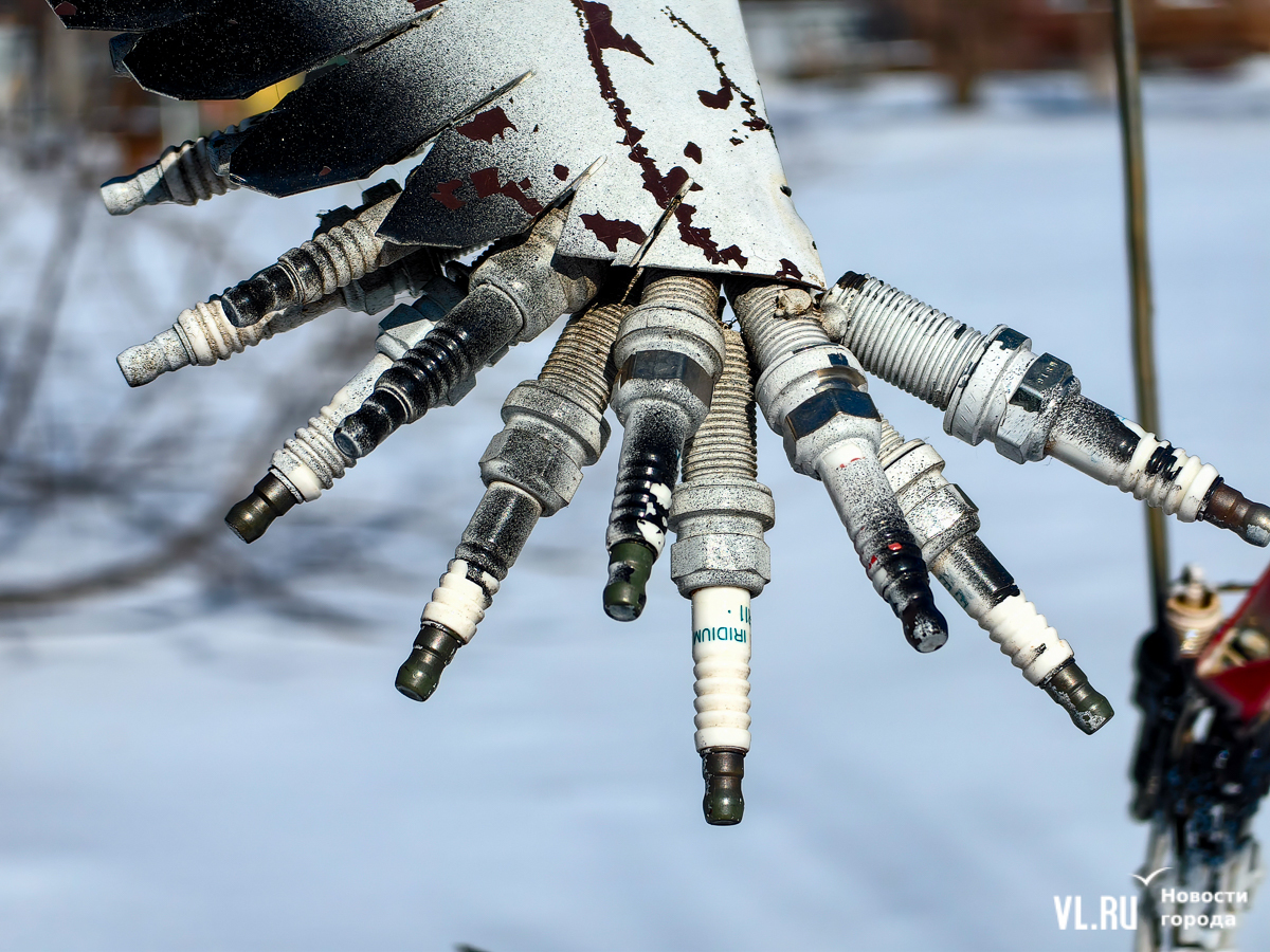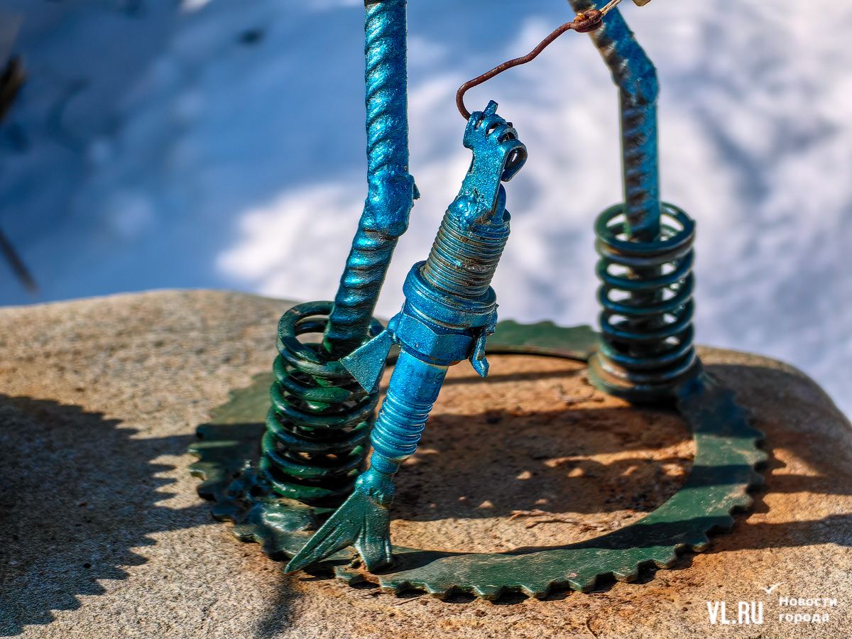 Есть и такие, которые без знаний физики не поймёшь. Например, композицию из двух журавлей (автор называет их лебедями). Один стоит, вытянув шею, второй завис над ним. При ветре верхняя птица кружится и покачивается. Соединяется она с нижней шариком, а свечи зажигания, расположенные на её крыльях, создают баланс.